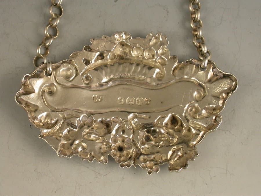 An unusual George IV die-stamped silver Wine Label of asymmetrical shape with a border of shells, vine leaves and grapes below a scrolled name plate incised for Madeira, a basket of fruit and flowers above.