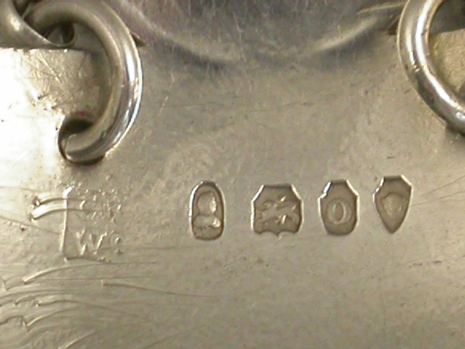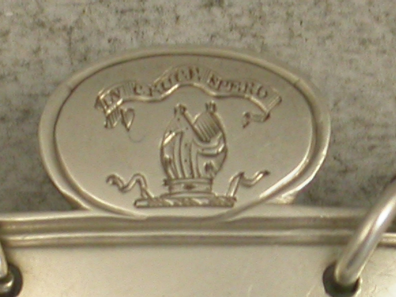 A George IV silver Wine Label of cut cornered rectangular form with double reeded border, an oval surmount engraved with a crest of a Bishops Mitre below the motto ""In Cruce Spero"" (I hope in the cross), possibly for Robert Barclay Esq, of Bury Hill, Dorking, Surrey.