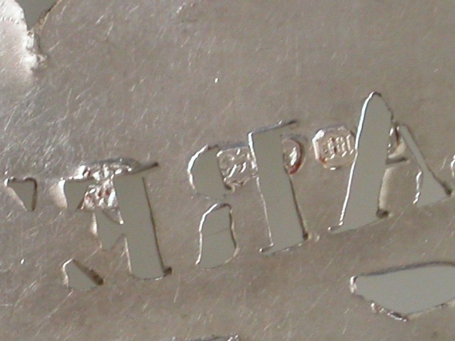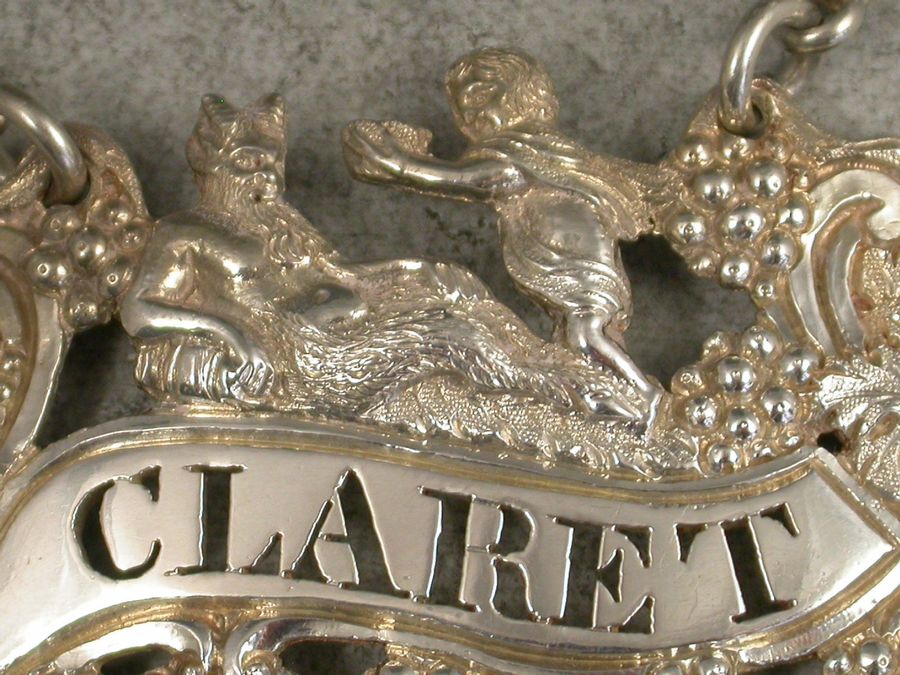 A fine George IV heavy cast and pierced silver Wine Label depicting a reclining Dionysus being offered a cup of wine by a cloaked Putto, a fruiting vine border surrounding the scrolled name plate pierced for Claret.