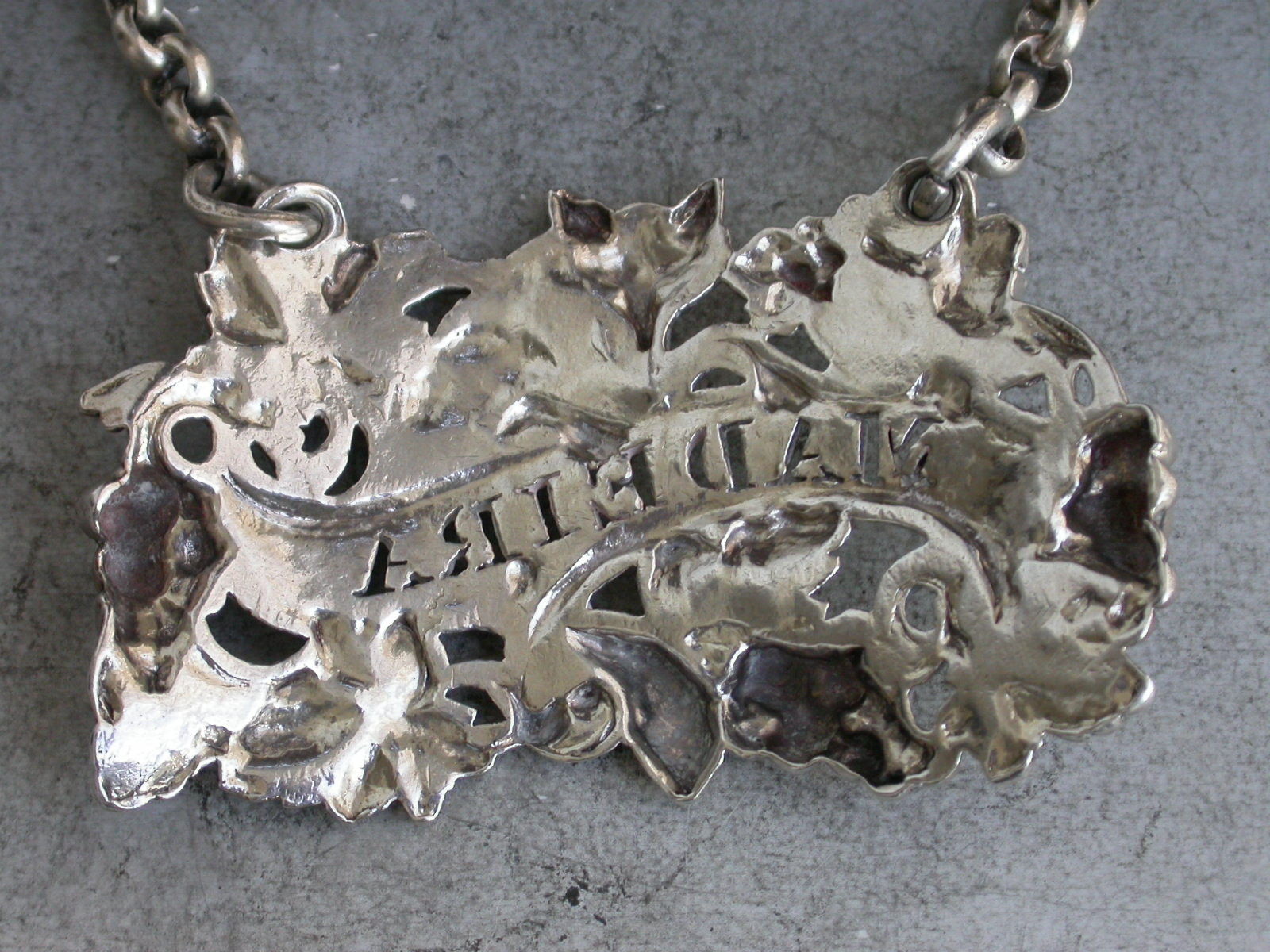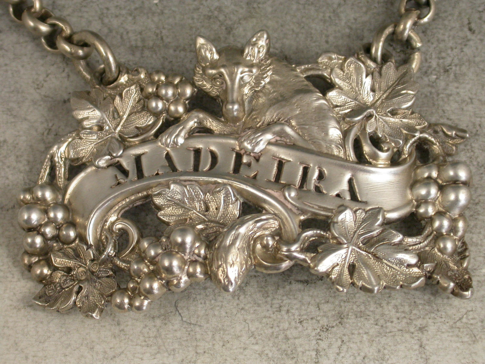 An extremely rare and fine quality George IV cast silver Wine Label depicting a curious fox amongst vine leaves and grapes, climbing over a scrolled name plate pierced for Madeira.