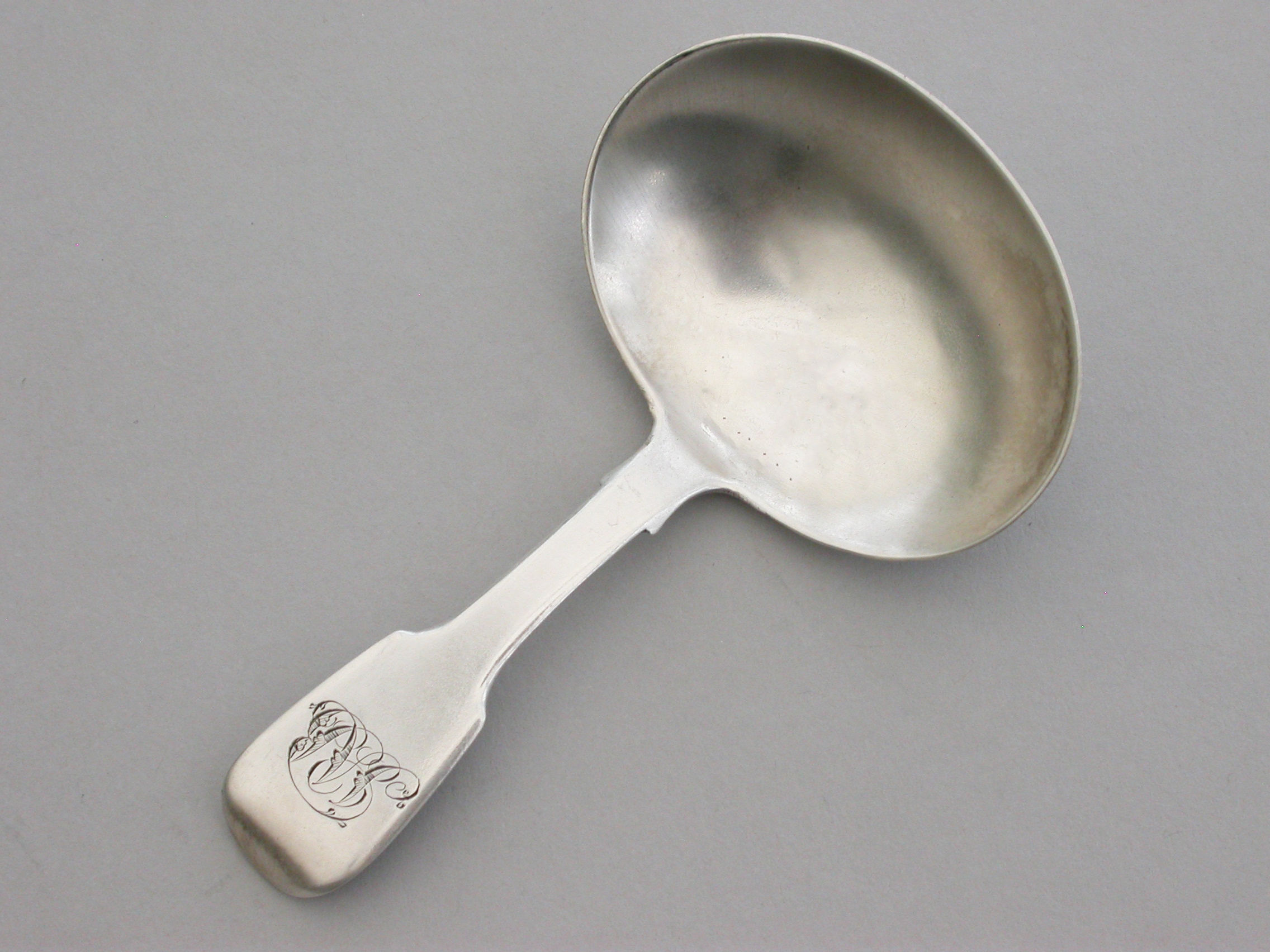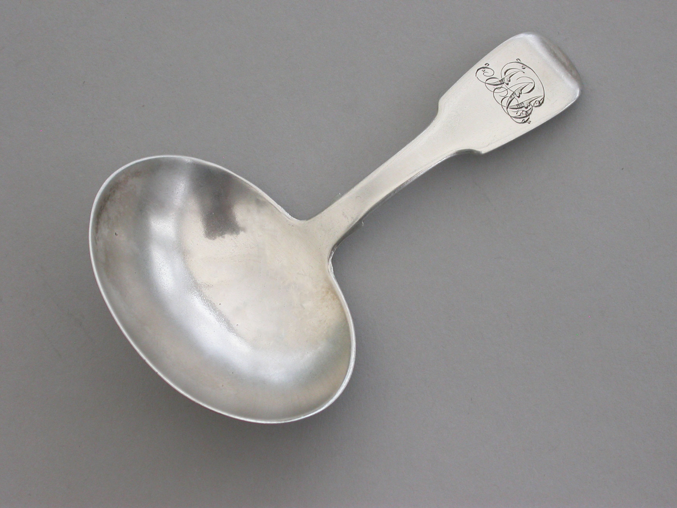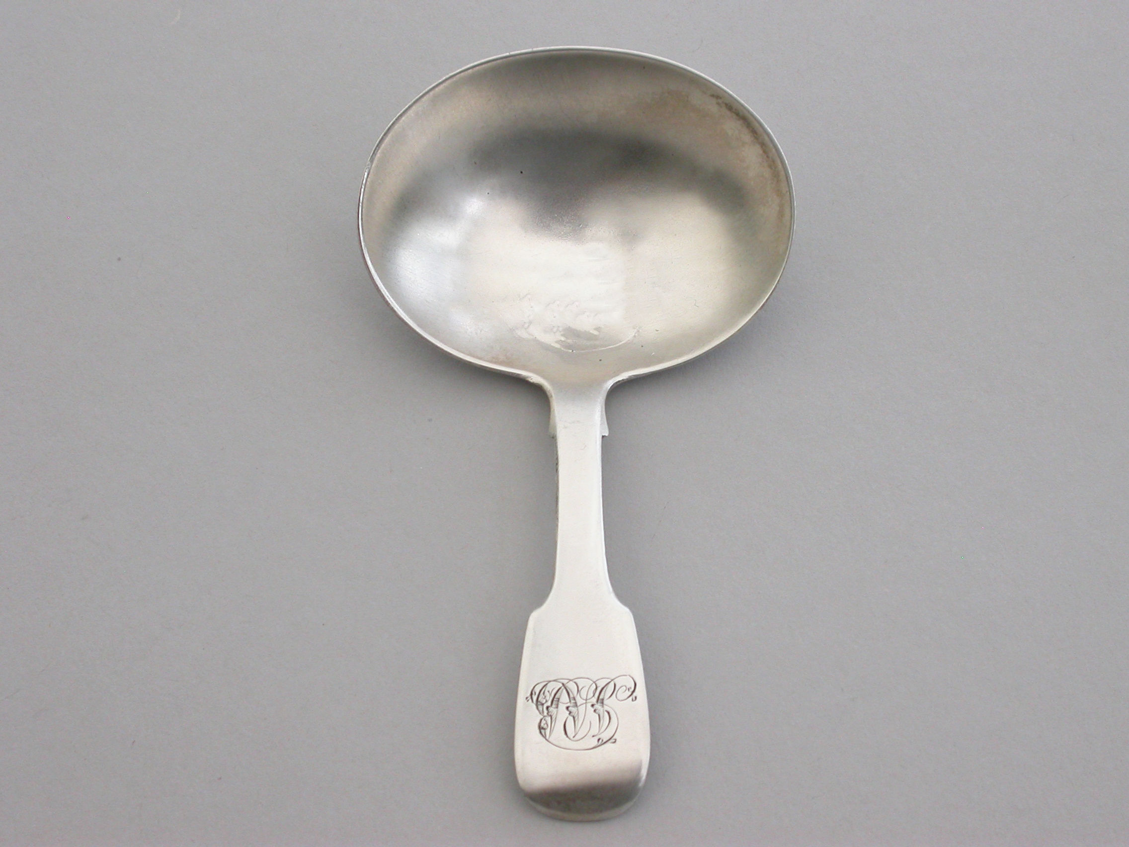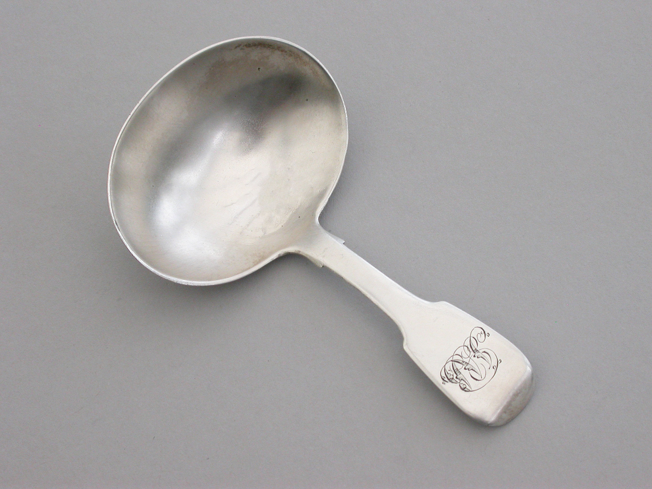 A George IV Irish silver Caddy Spoon with plain oval bowl and fiddle pattern handle, engraved with contemporary script initials.