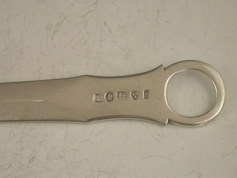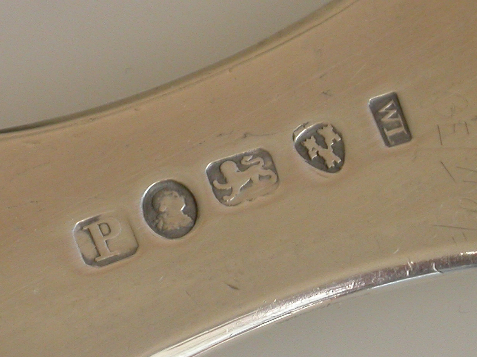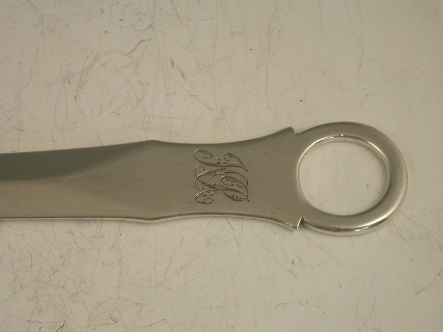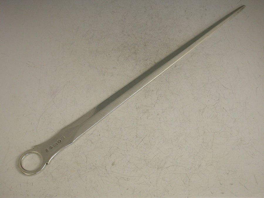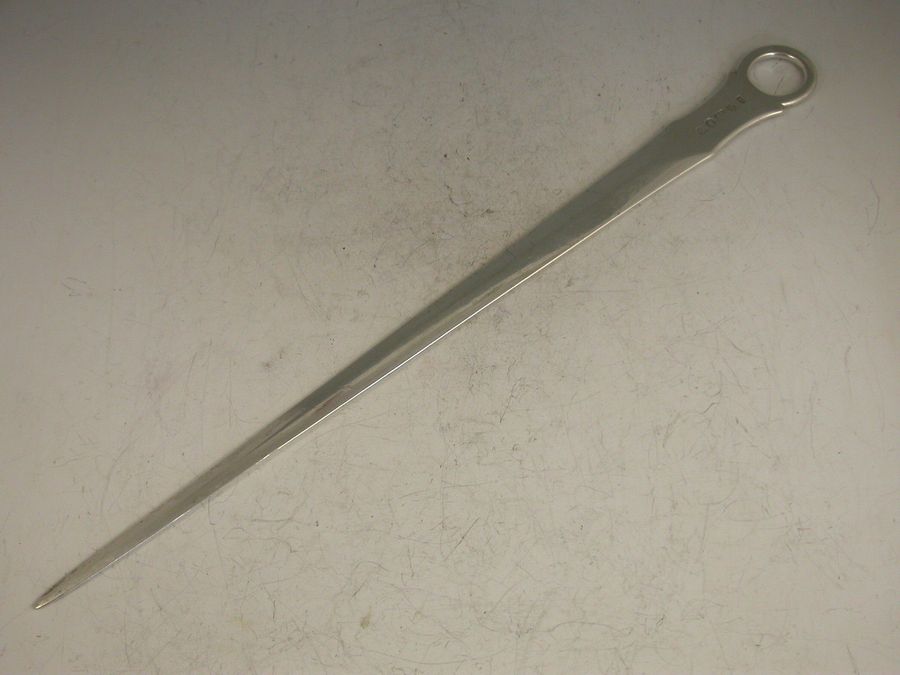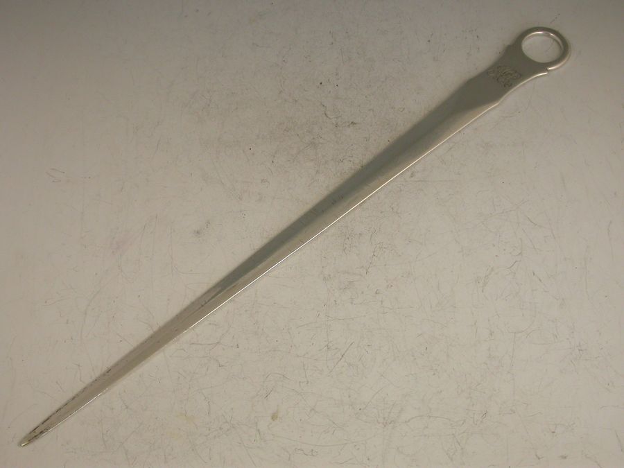 A good George IV Provincial silver Meat Skewer of large size and standard beveled form with plain ring terminal, engraved with contemporary initials 'HR'.
