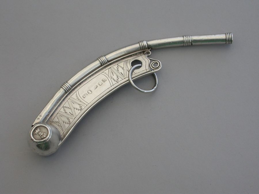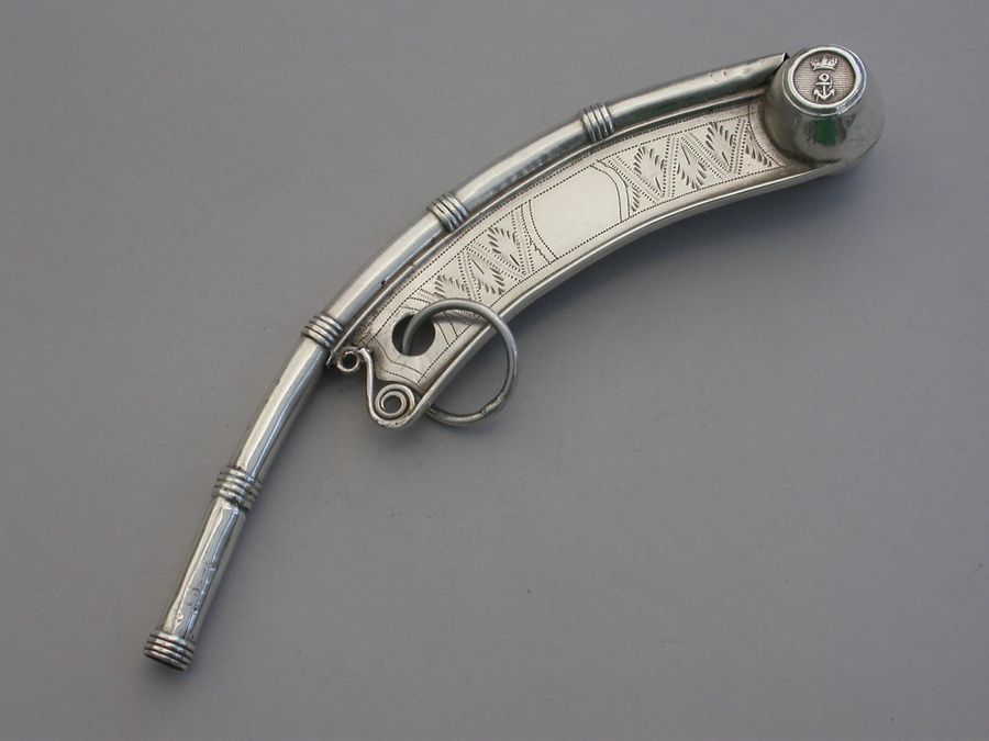 An extremely rare George IV silver Bosuns Whistle of an unusually large size, the buoy stamped on either side with the Royal Navy Crown and Anchor mark, the keel with scratch engraved decoration and a vacant cartouche, reeded bands to the pipe. Complete with suspension ring.
