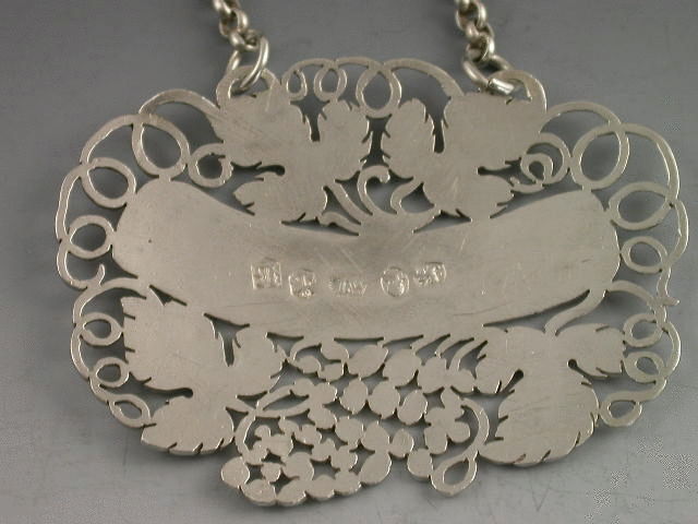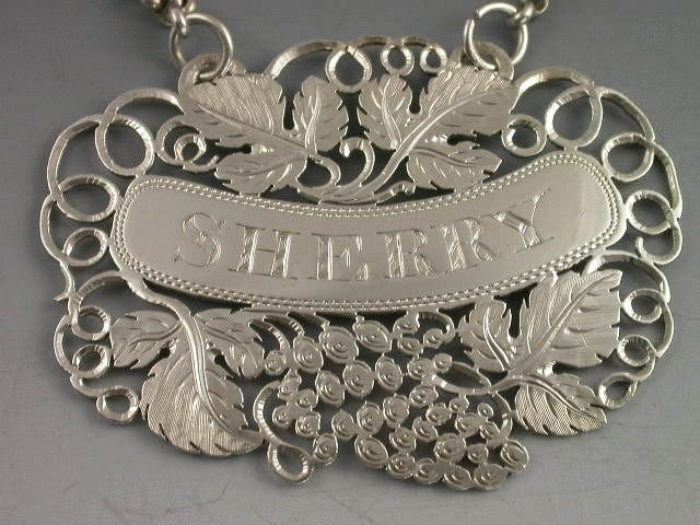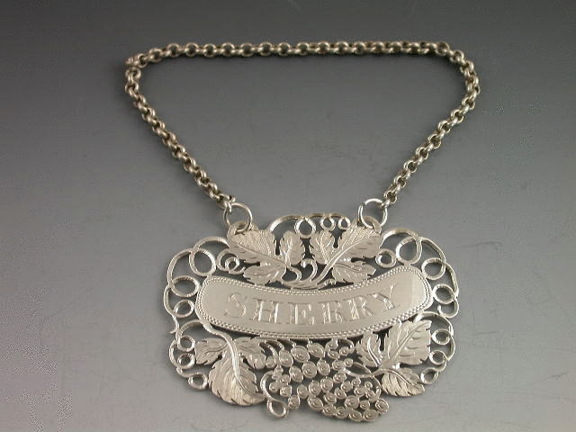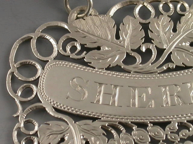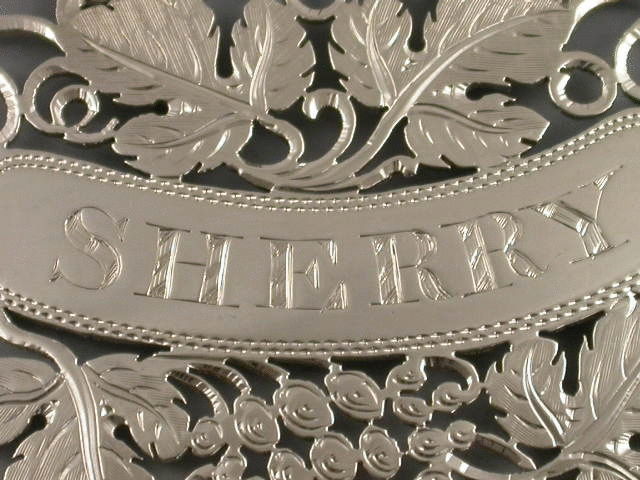 A very attractive George IV silver Wine Label, delicately pierced and engraved with vine leaves, grapes and vine tendrils surrounding the curved nameplate incised for SHERRY. See “Wine Labels 1730-2003 fig 794, page 241, 242”.