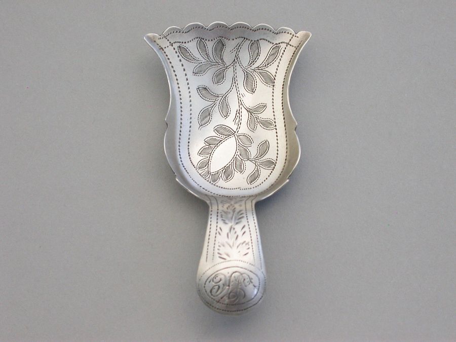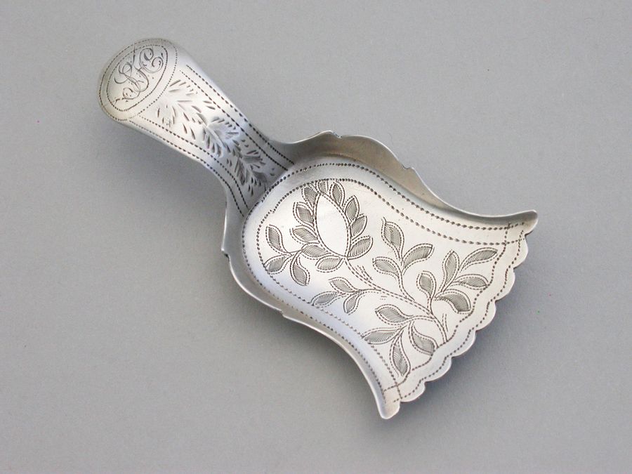 A good George IV silver Caddy Spoon, the bell shaped bowl bright-cut engraved with flowers and a bright-cut engraved Old English handle.