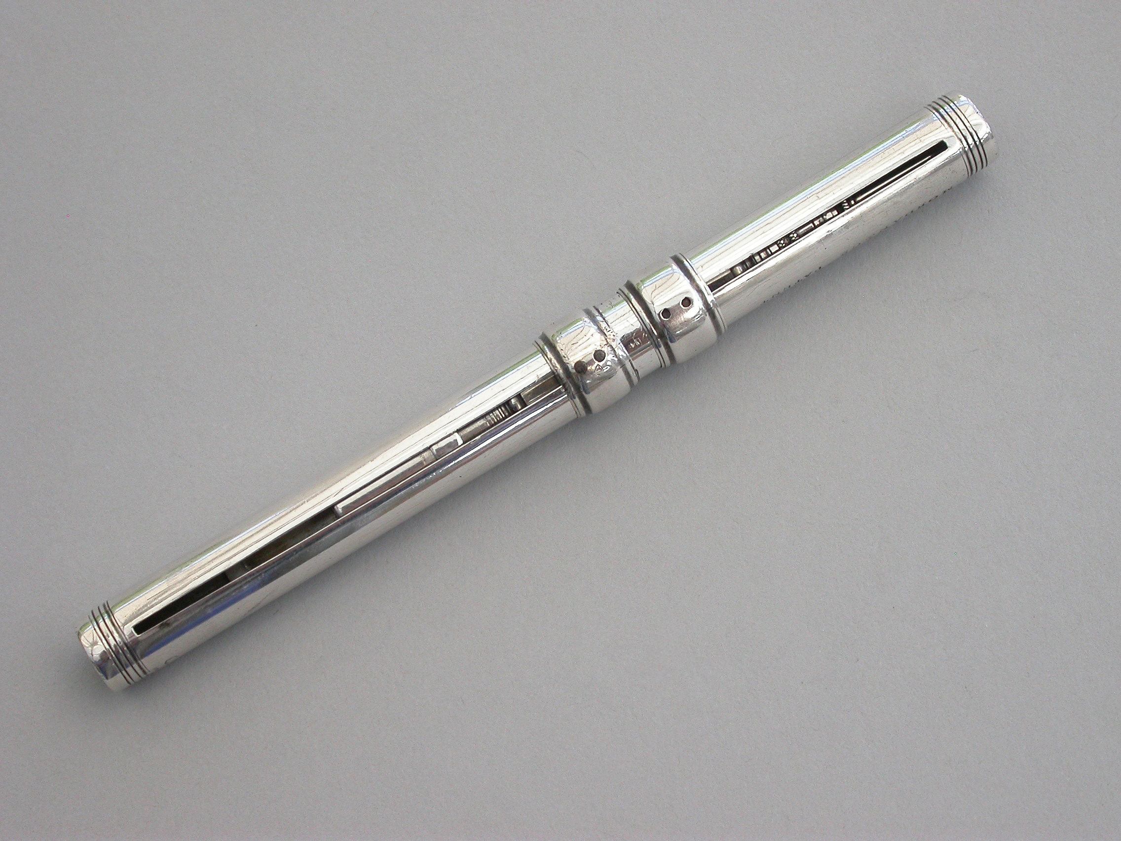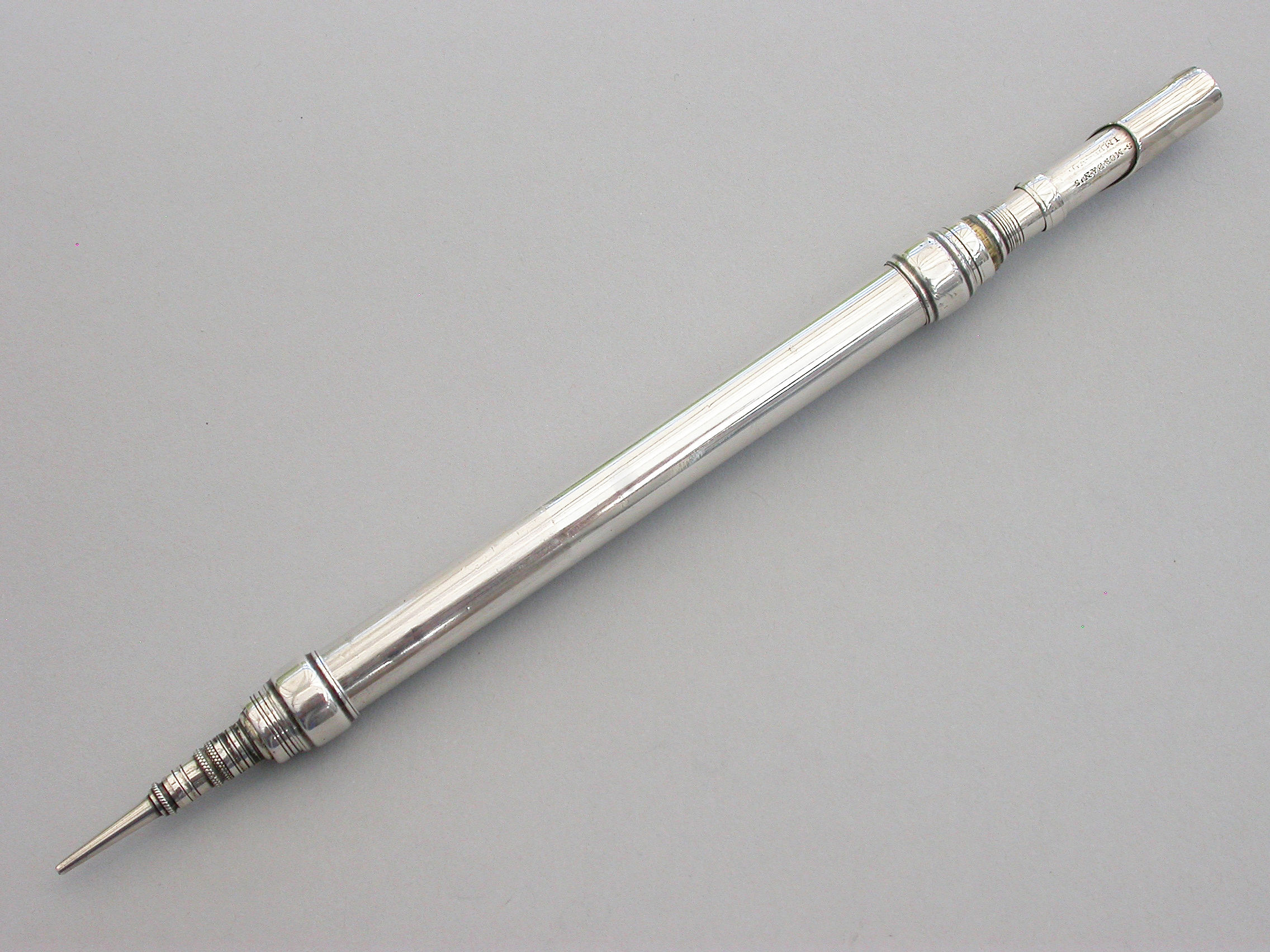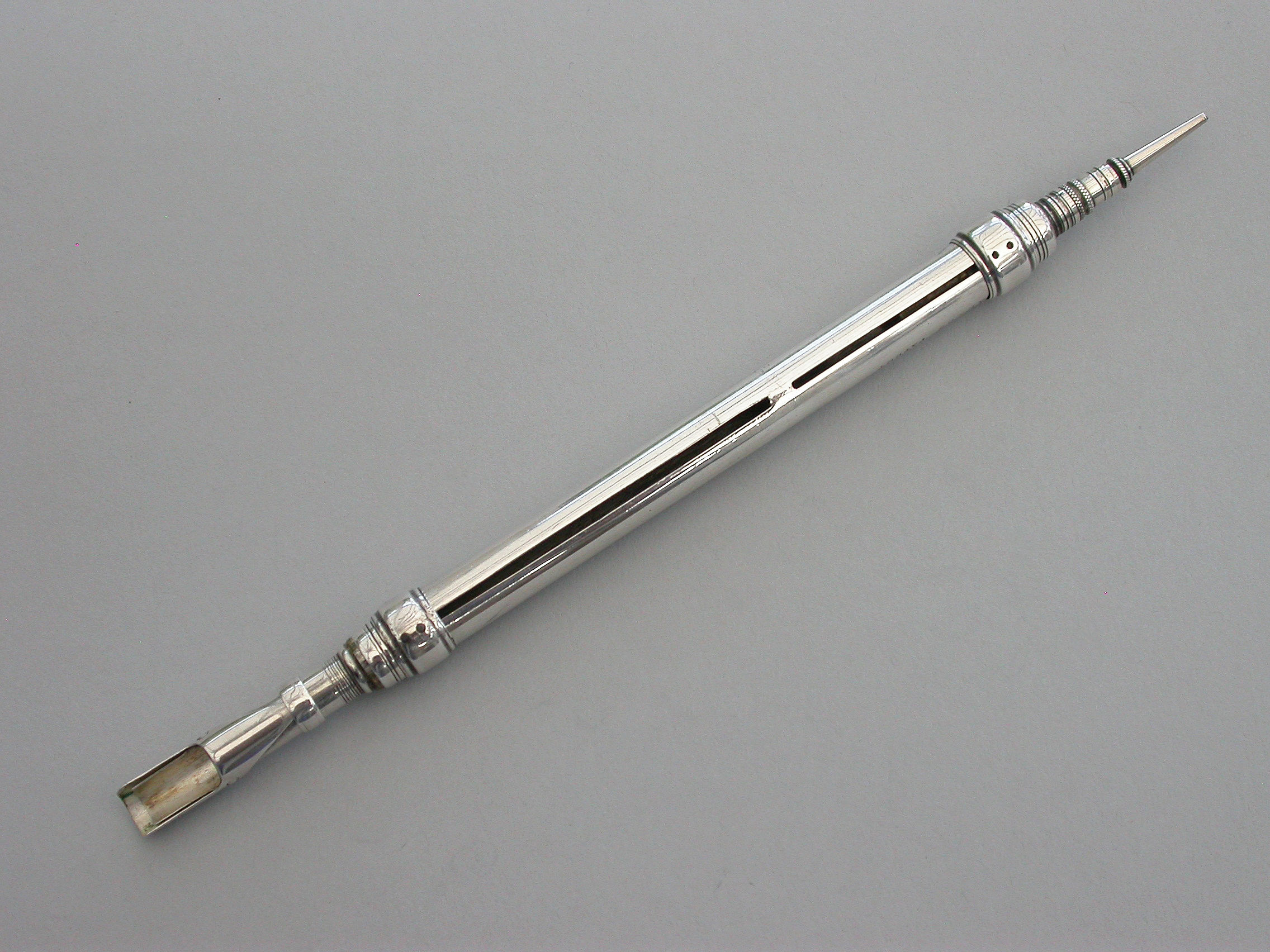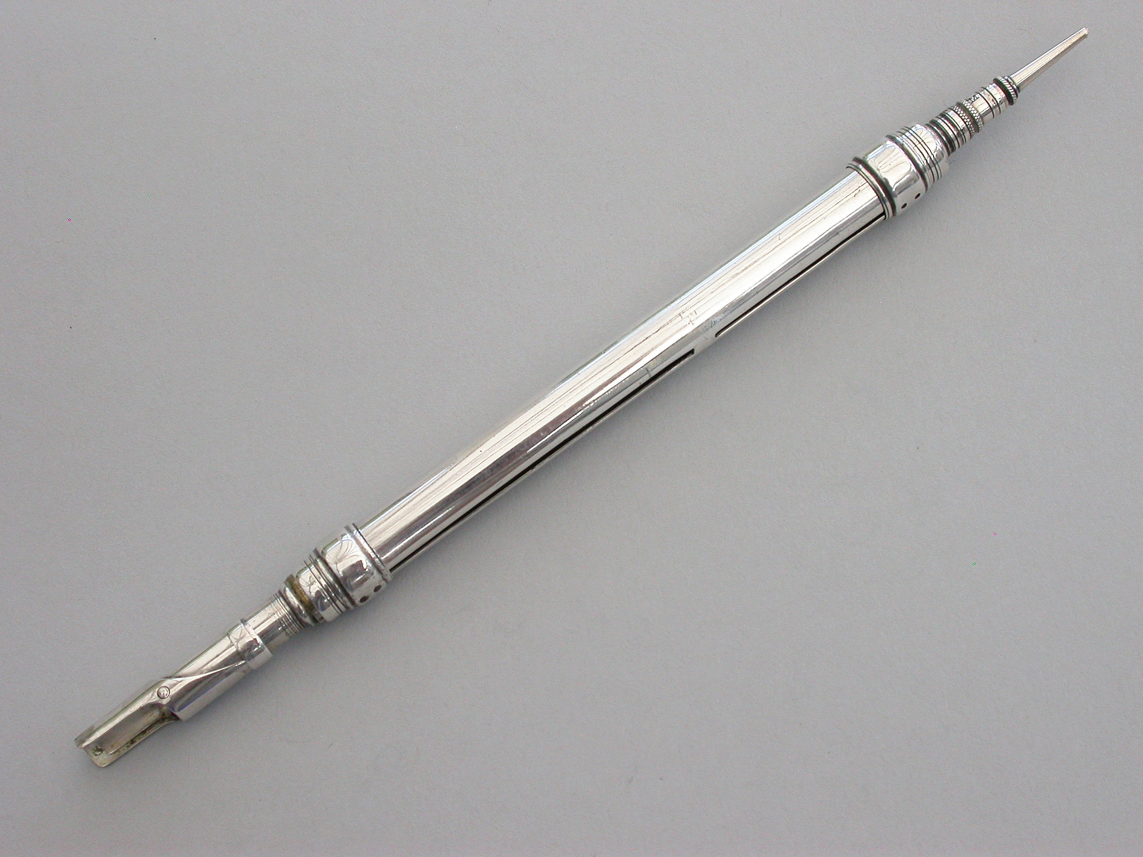 An extremely rare and early George IV fully hallmarked silver double open ended combined Pen and Pencil, with Bramah type nib holder, the plain cylindrical body with reeded decoration.