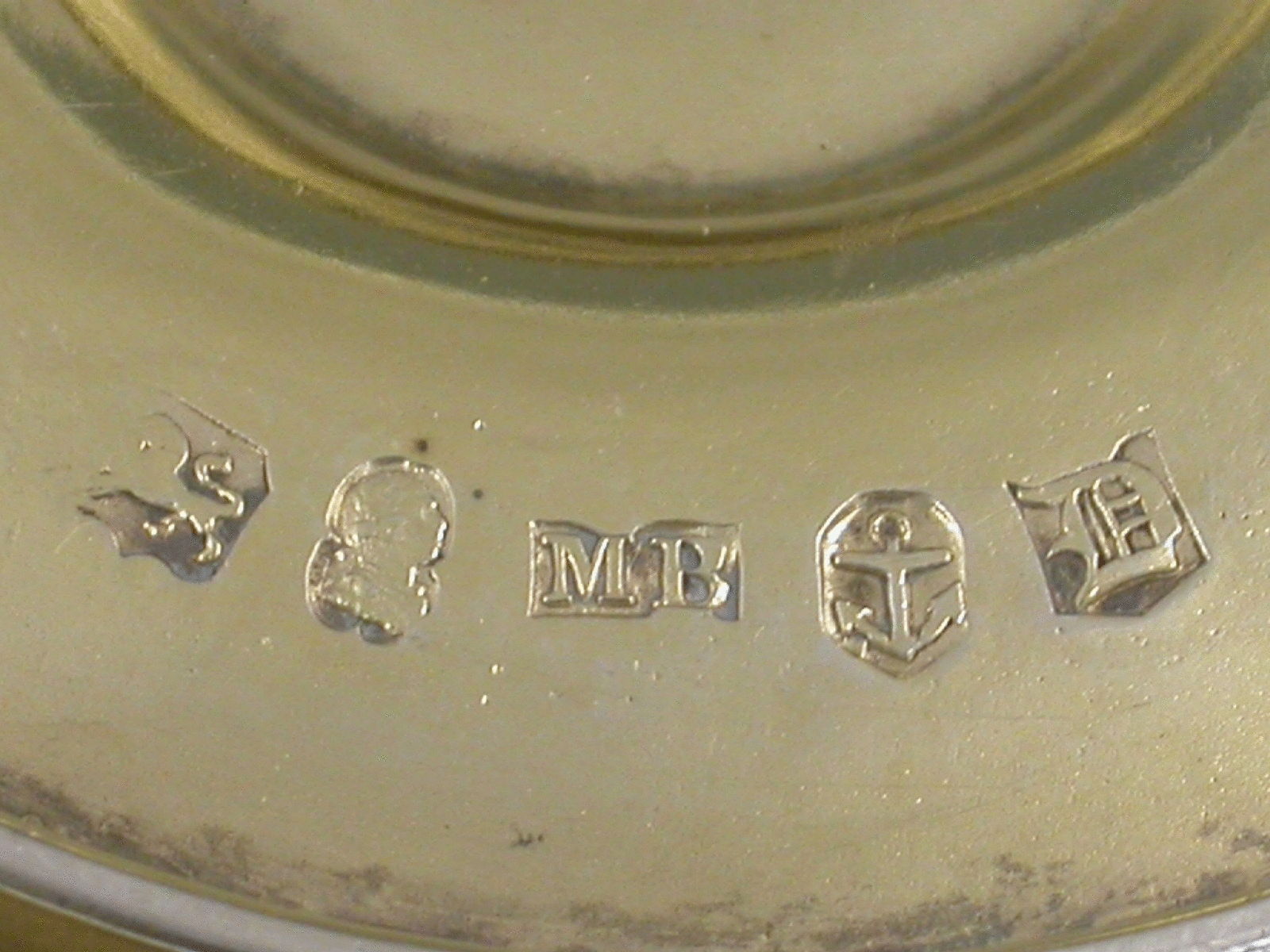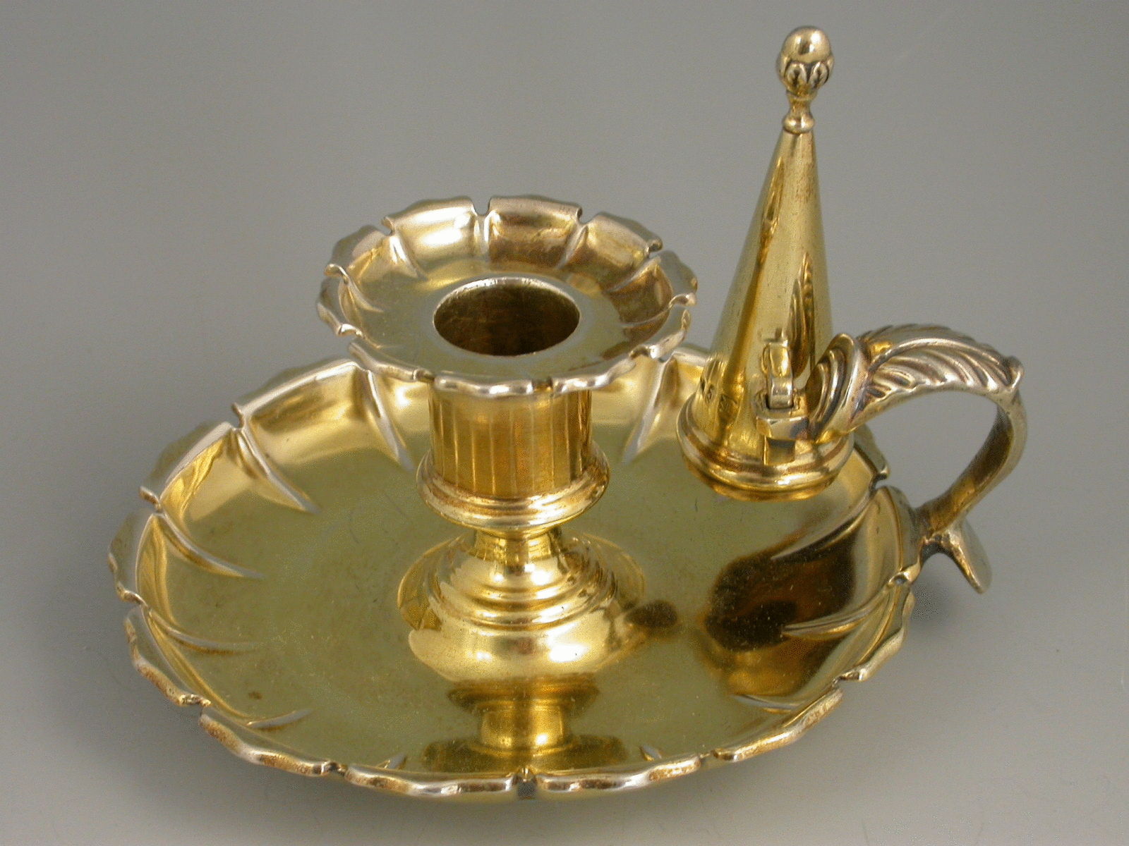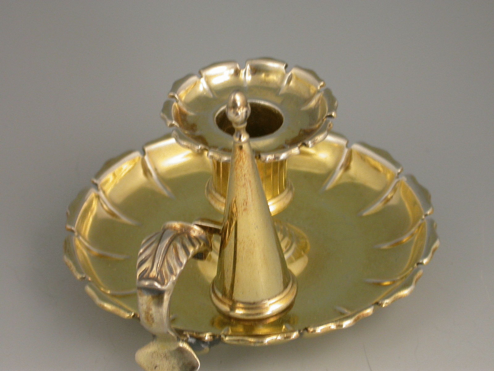 A good George IV silver gilt Chamberstick and Snuffer of circular form with shaped fluted borders and leaf capped scroll handle, plain conical snuffer.