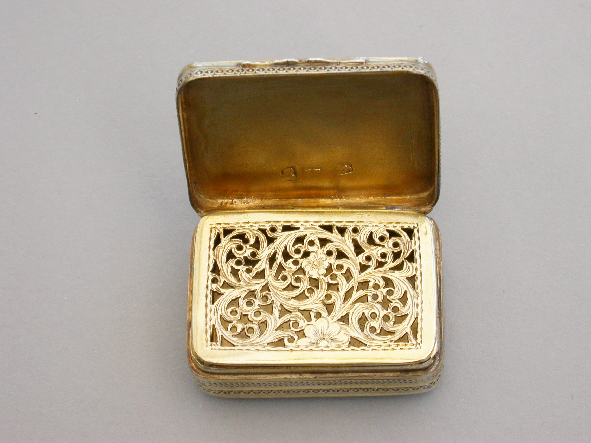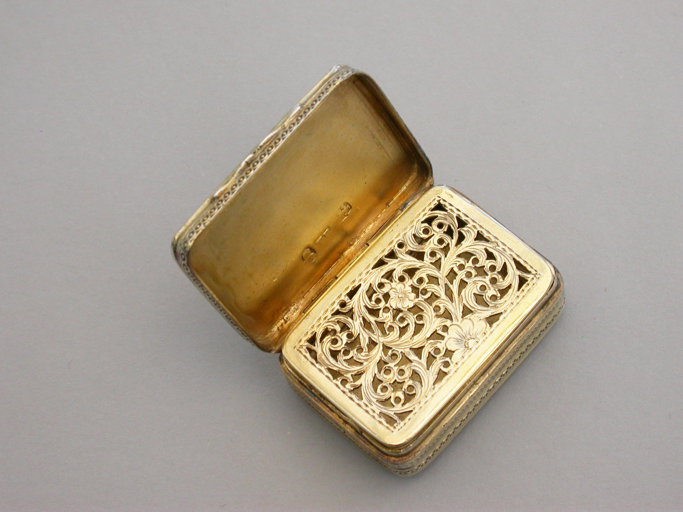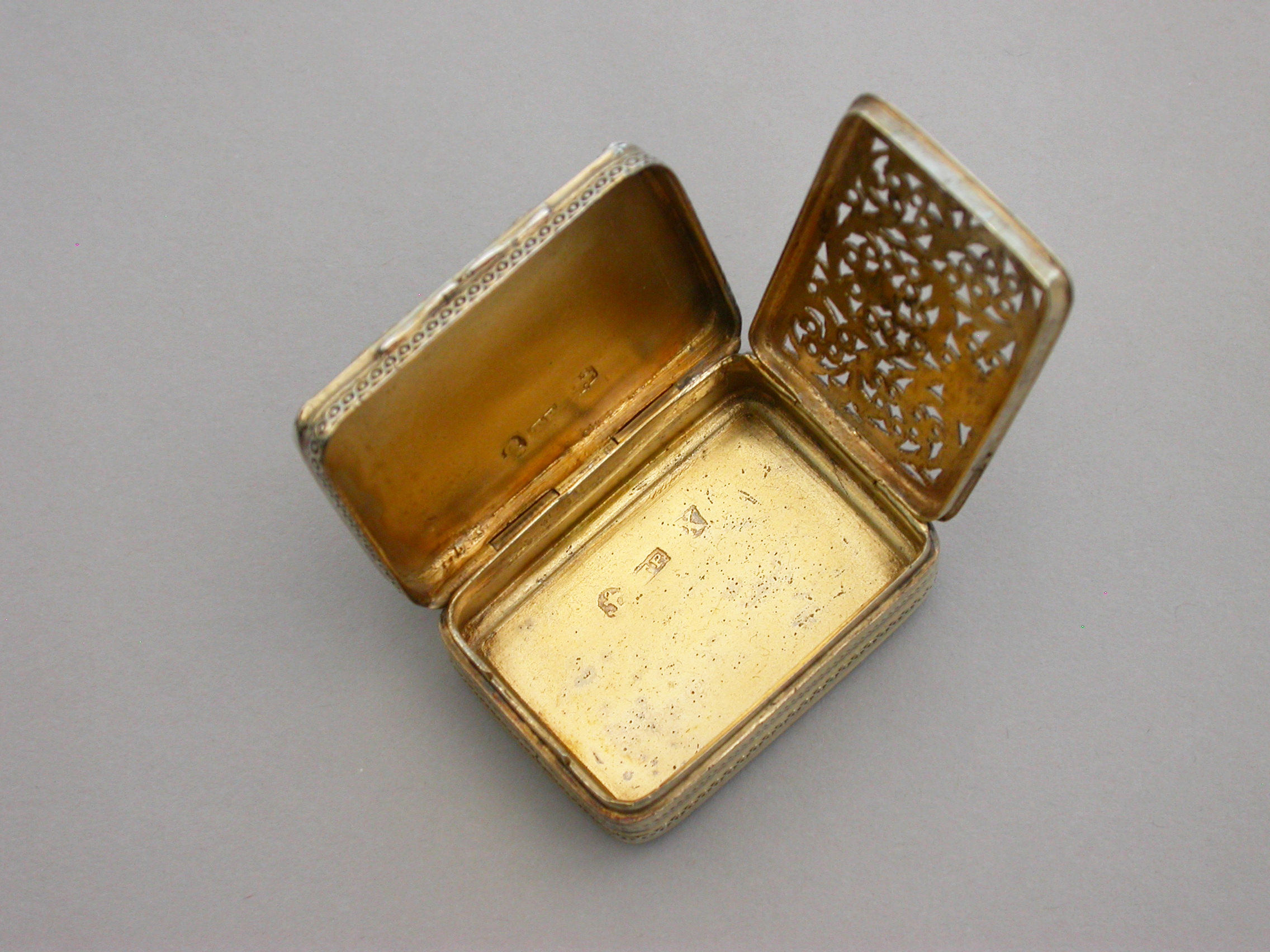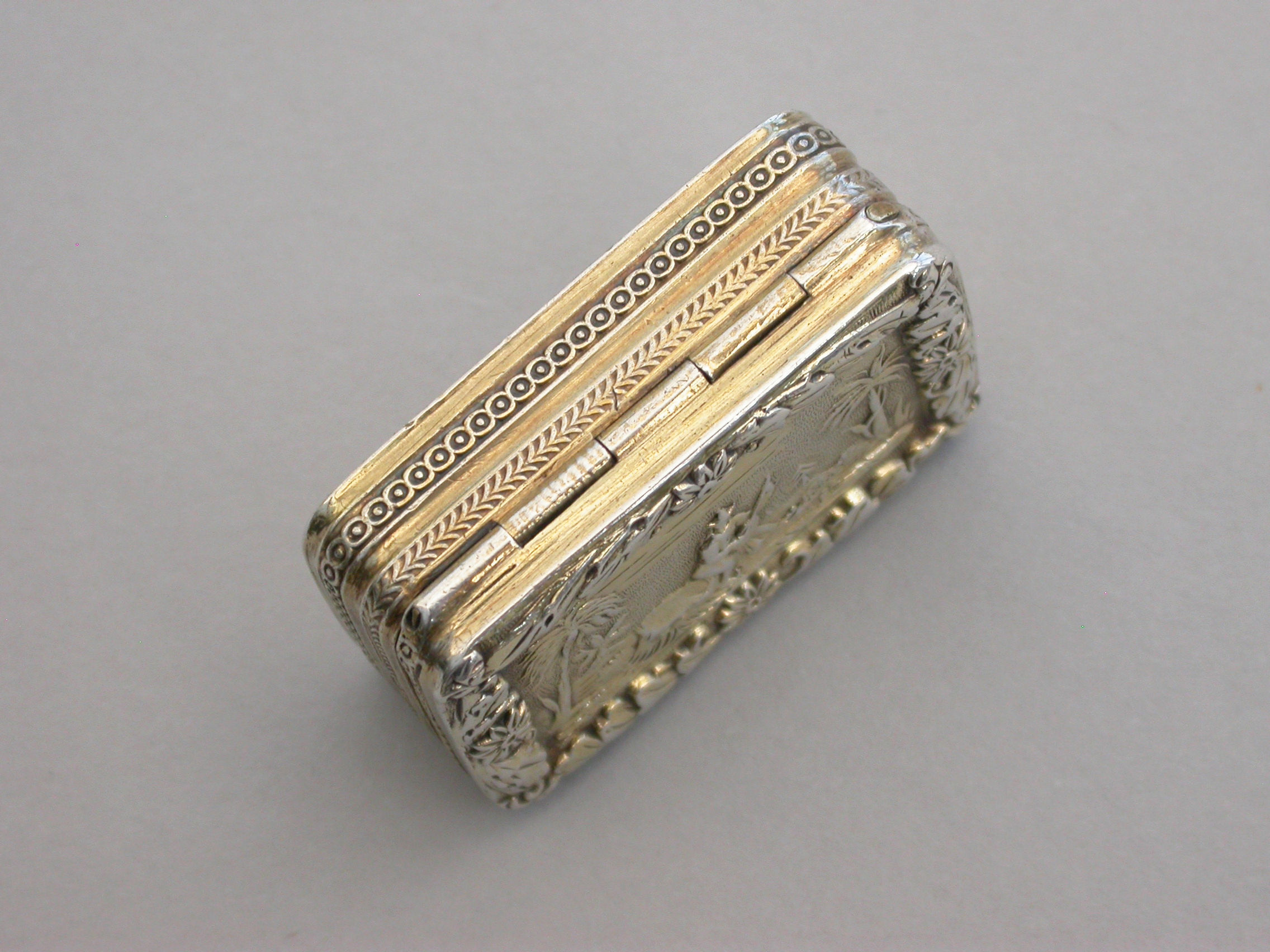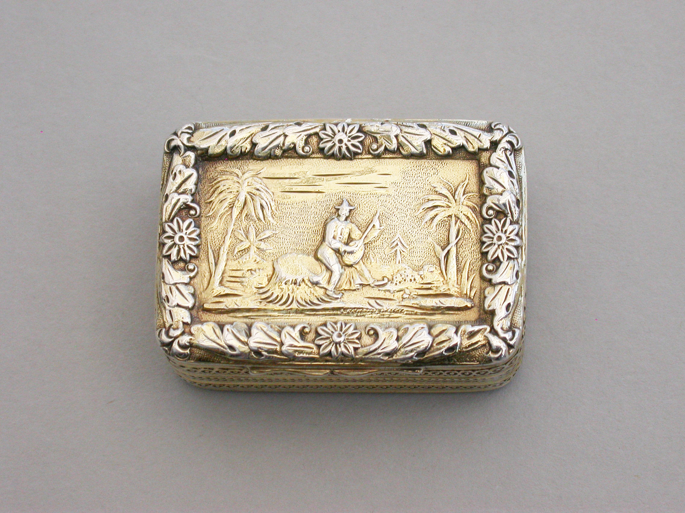 A rare George IV silver gilt Vinaigrette of deep rectangular form with engine turned decoration to the base and raised bands to the sides. The lid with a raised scene in the 'Chinoiserie Revival' style depicting a Chinaman on a desert island playing a Mandolin. Set within a leaf and flower head border.
