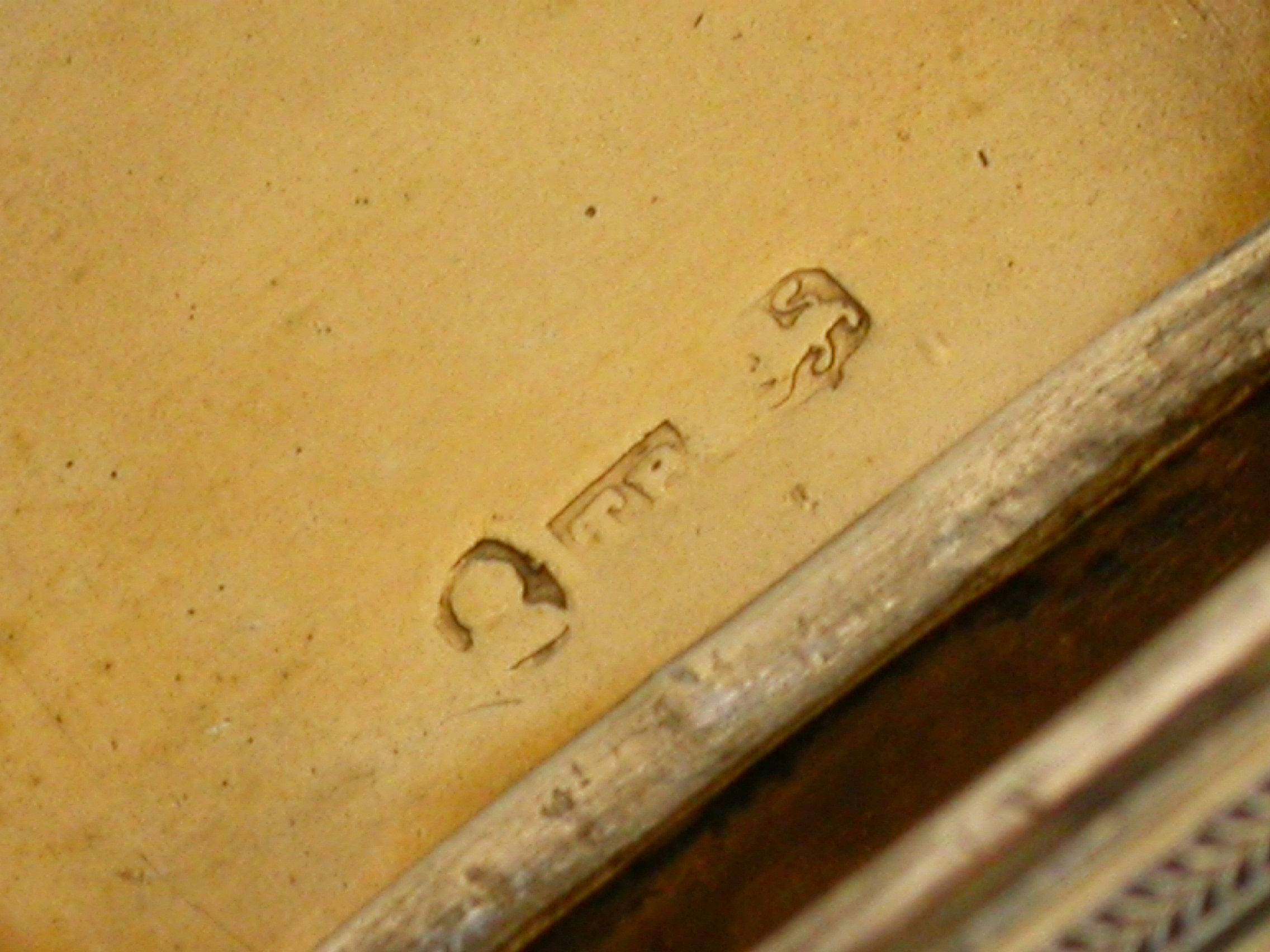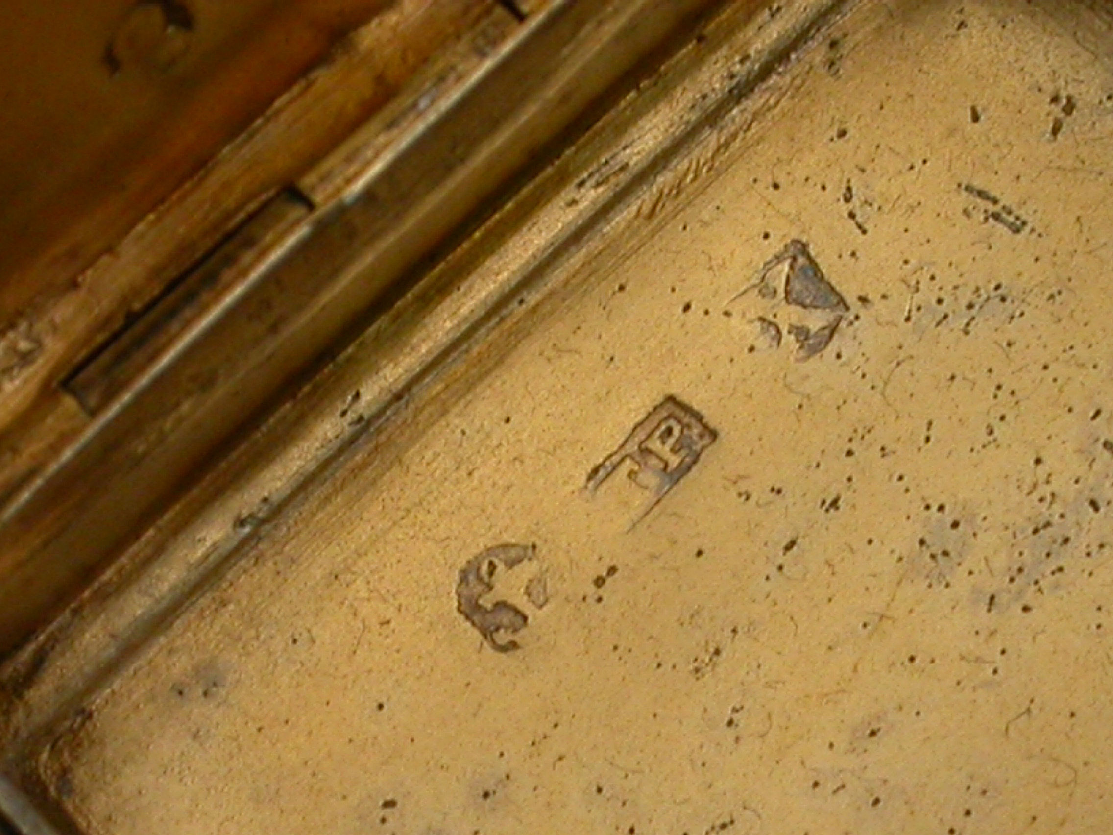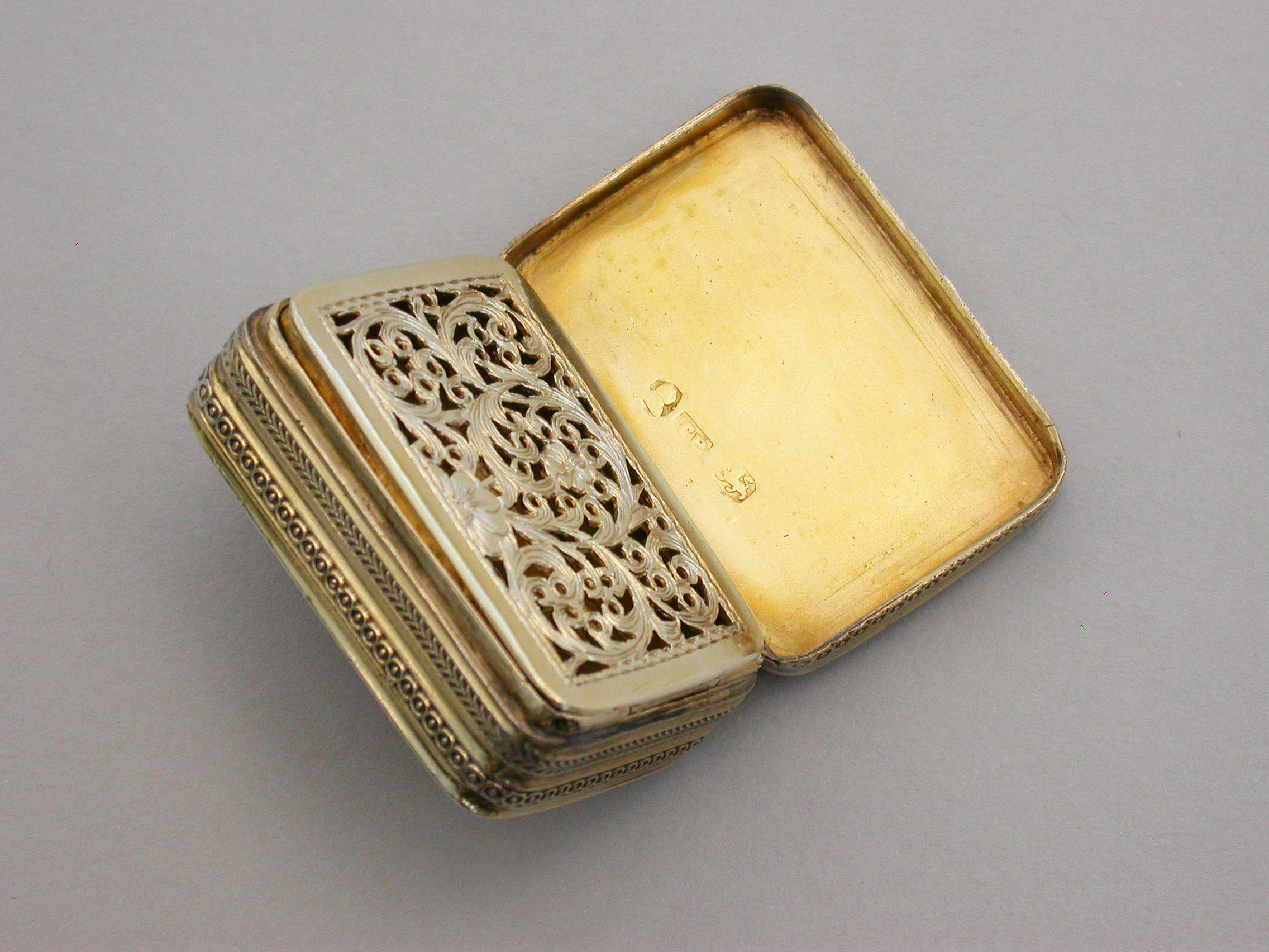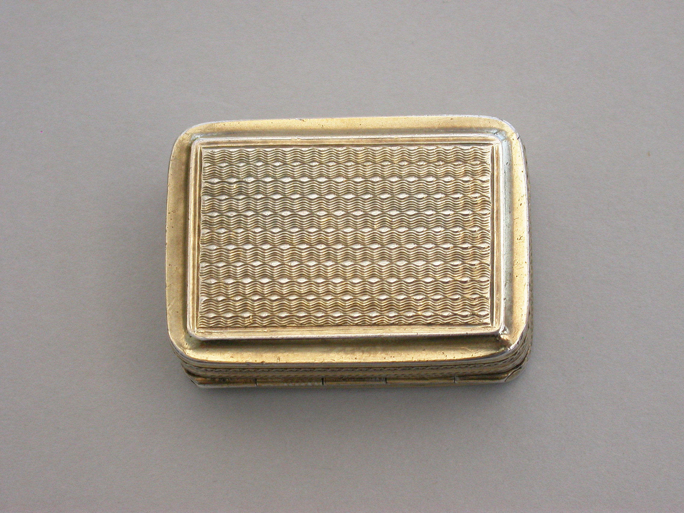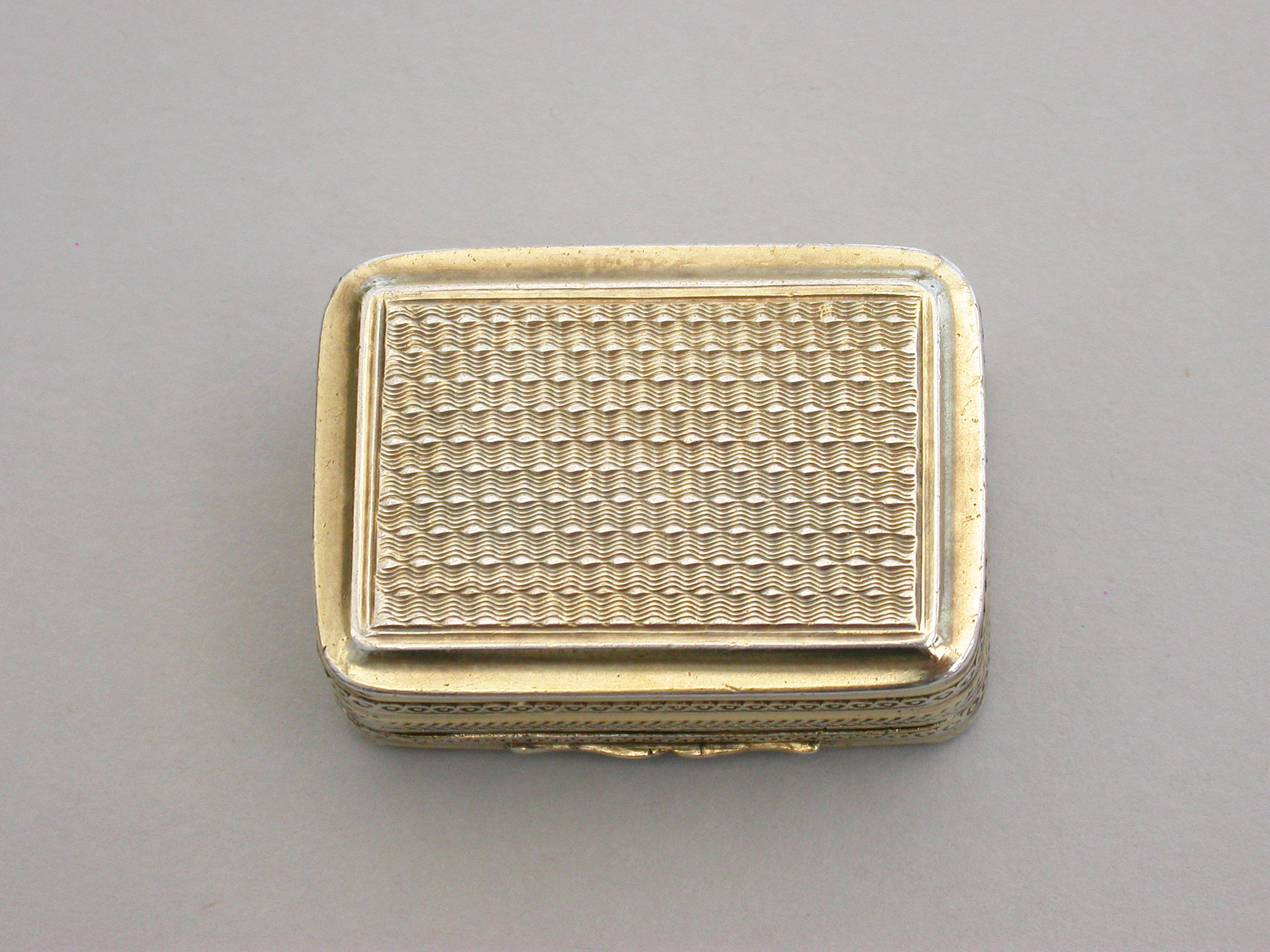 A rare George IV silver gilt Vinaigrette of deep rectangular form with engine turned decoration to the base and raised bands to the sides. The lid with a raised scene in the 'Chinoiserie Revival' style depicting a Chinaman on a desert island playing a Mandolin. Set within a leaf and flower head border.