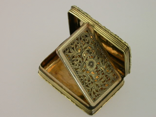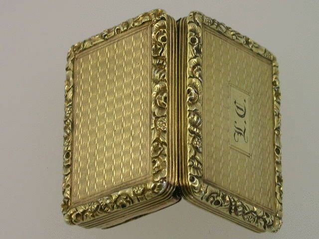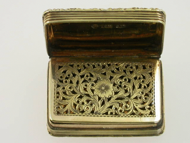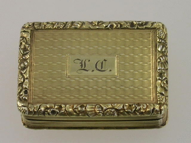 A fine George IV silver gilt Vinaigrette with engine turned decoration and raised shell and floral border, contemporary initials L C to central cartouche.