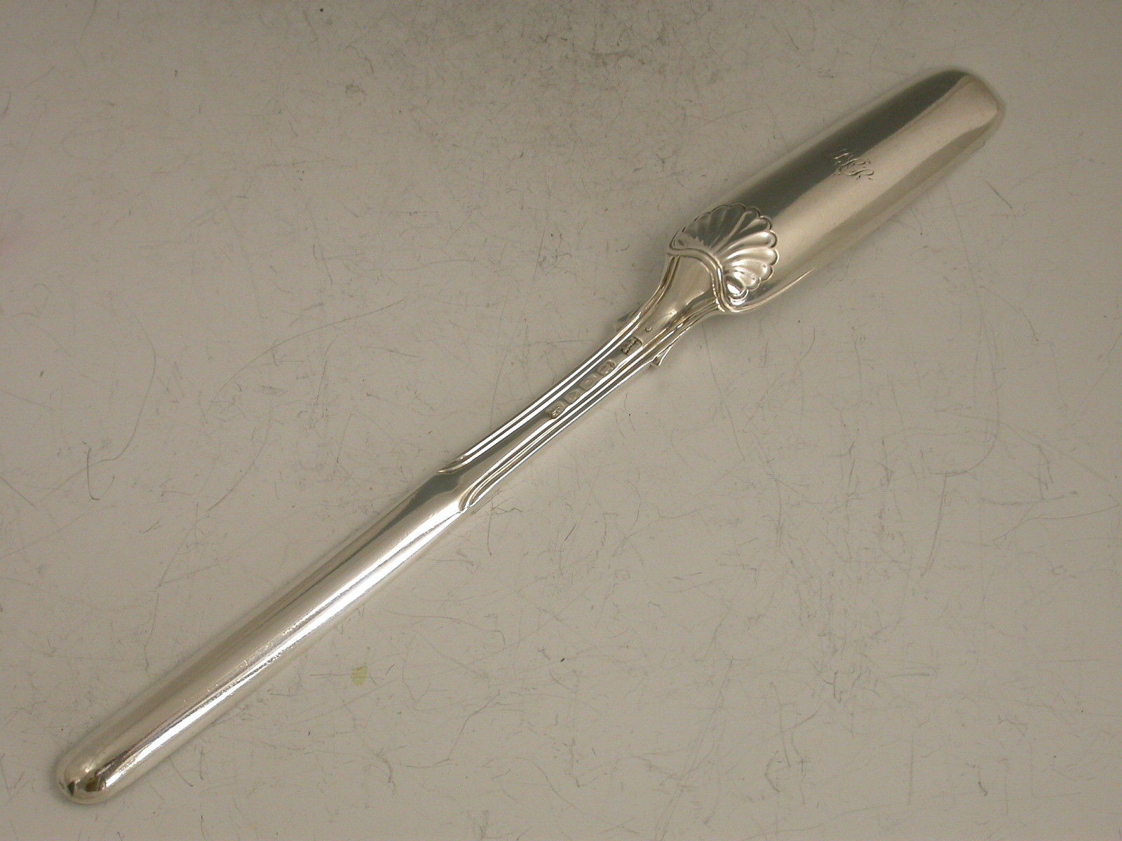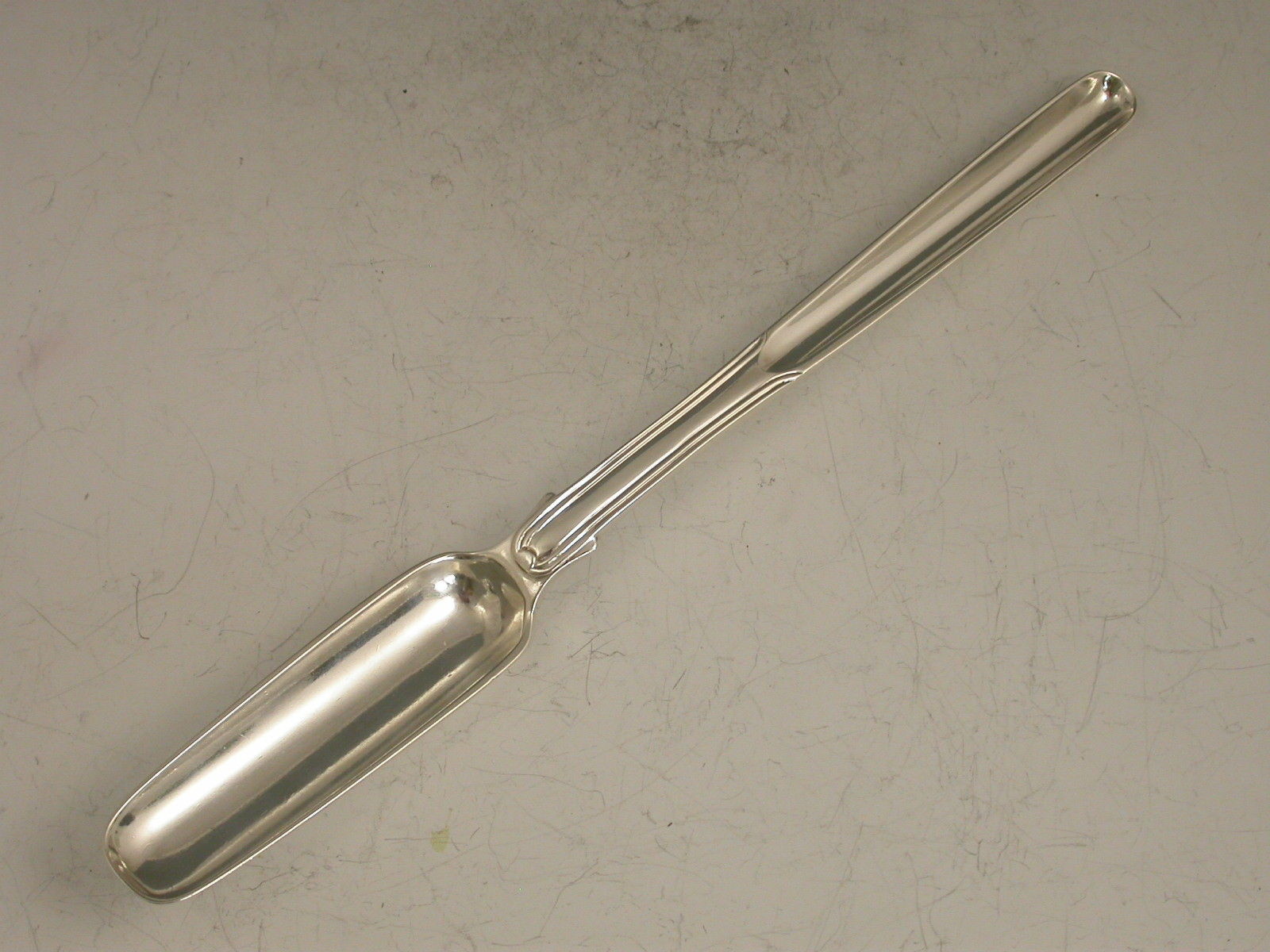 A good quality George IV heavy cast silver Marrow Scoop of Kings Hour Glass pattern with a Union Shell Heel to the bowl. The large bowl engraved with initials.