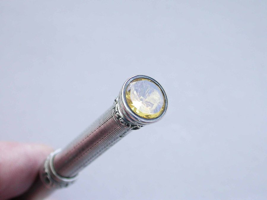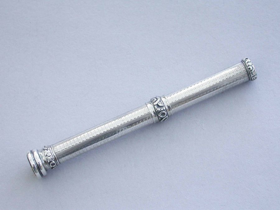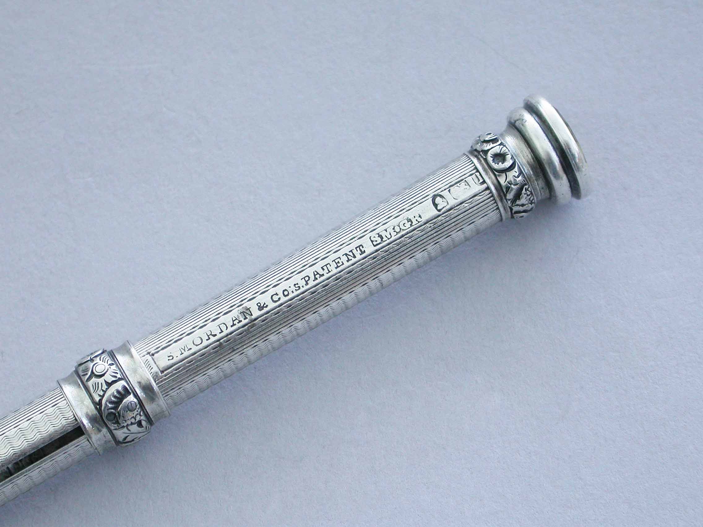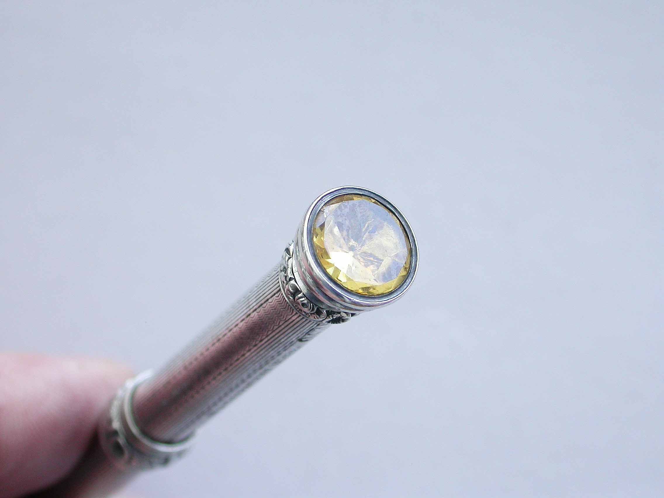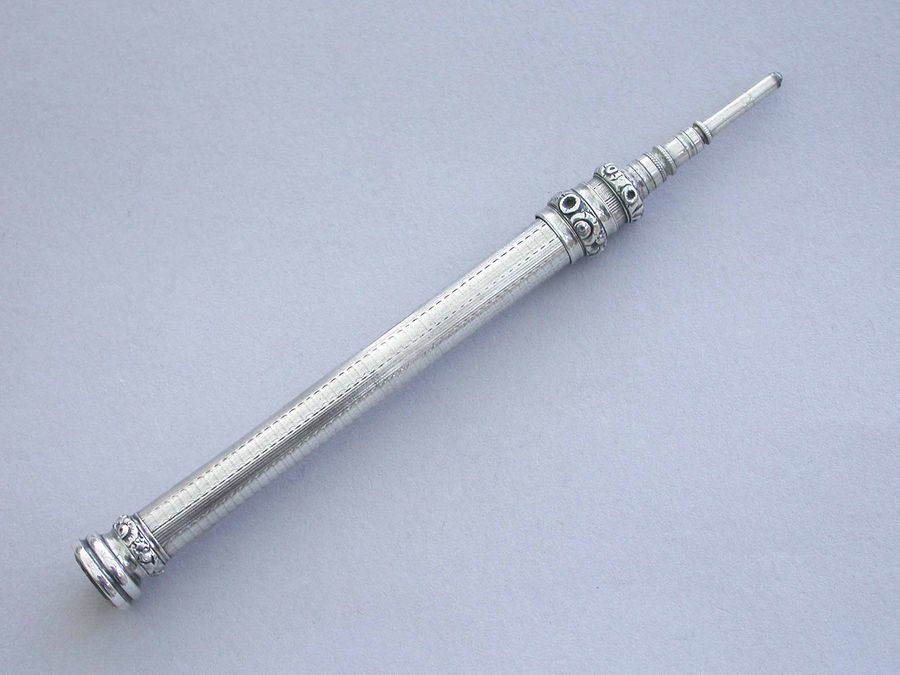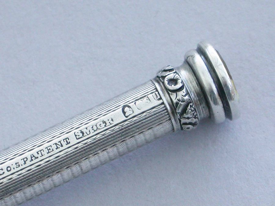 A rare George IV silver sliding Propelling Pencil with engine turned decoration to the barrel, raised foliate scroll slider ring and terminal set with a citrine seal stone.