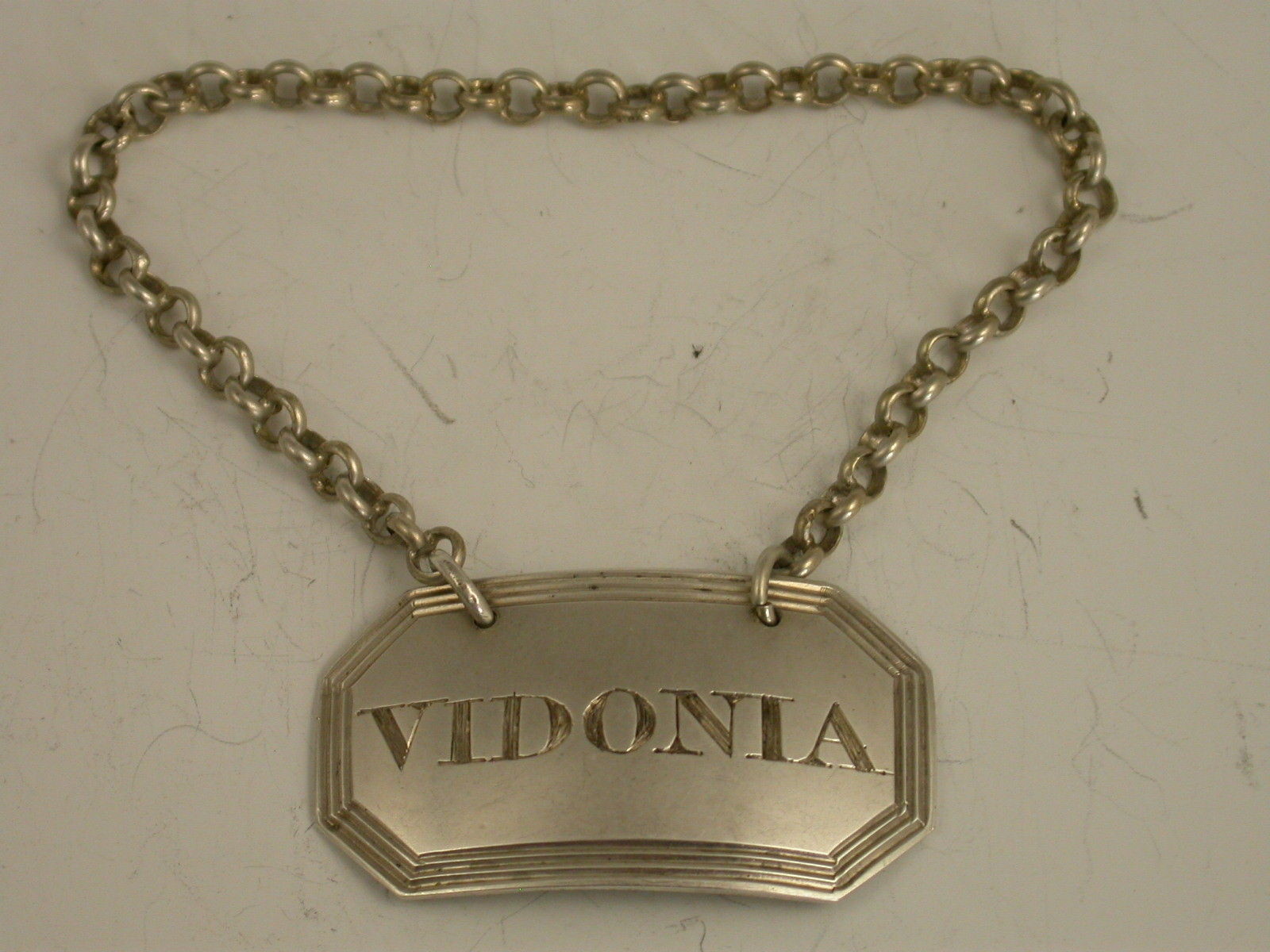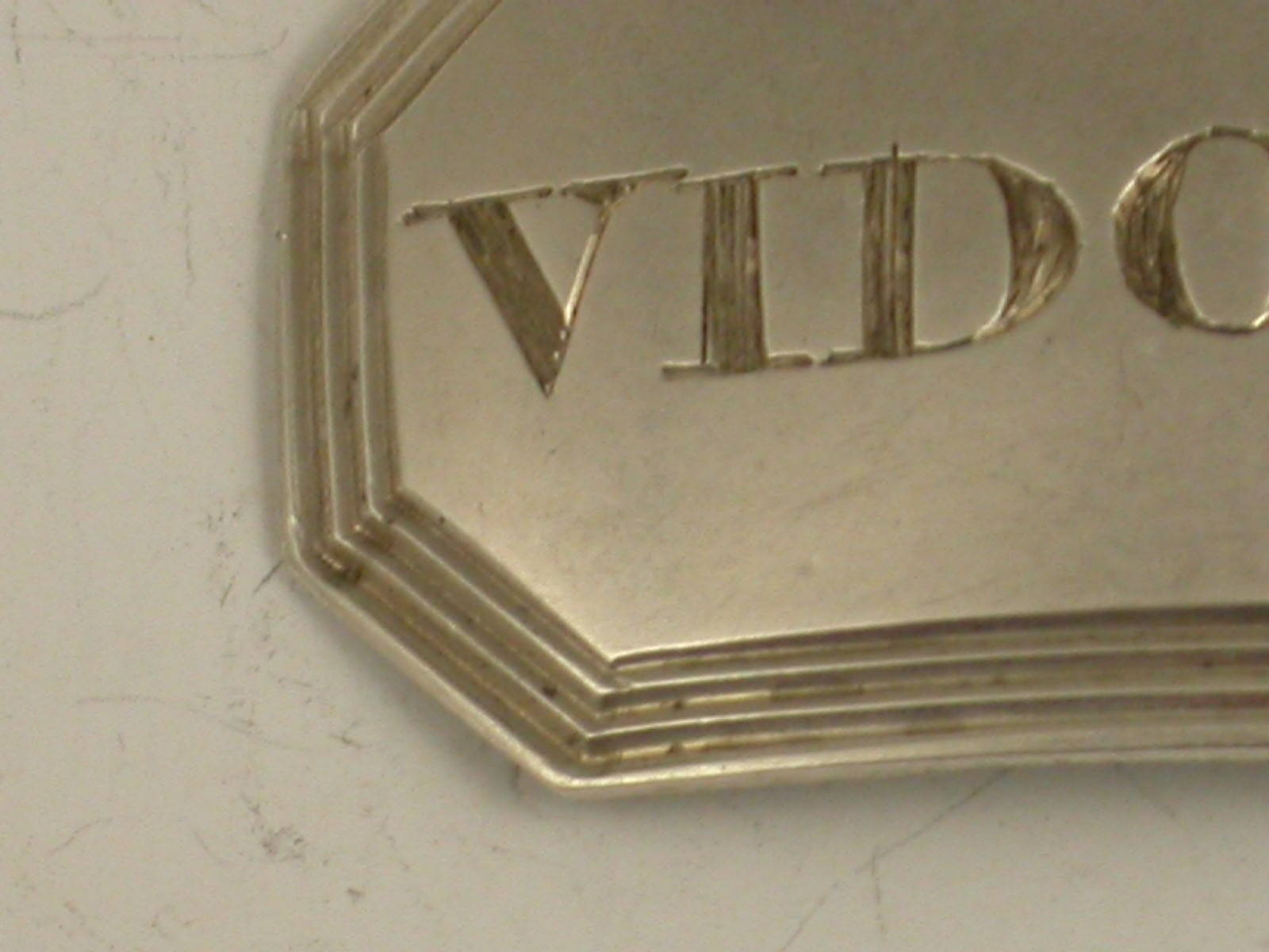 A rare George IV silver Wine Label of cut cornered rectangular form with triple reeded border, incised for Vidonia.