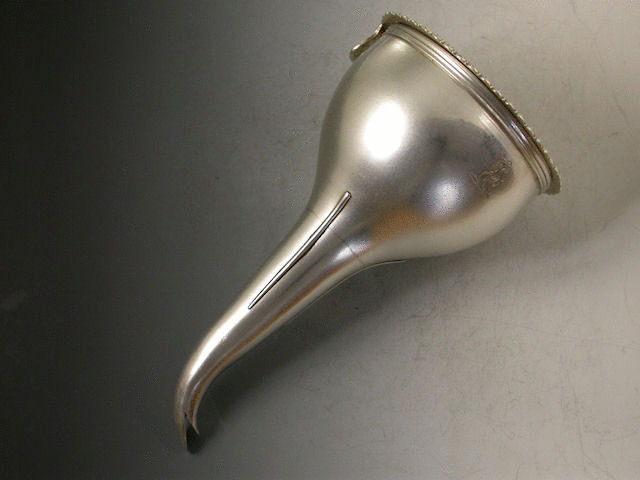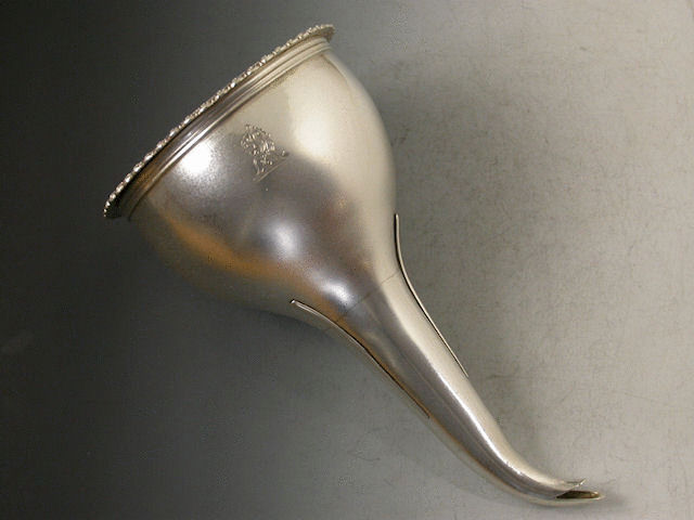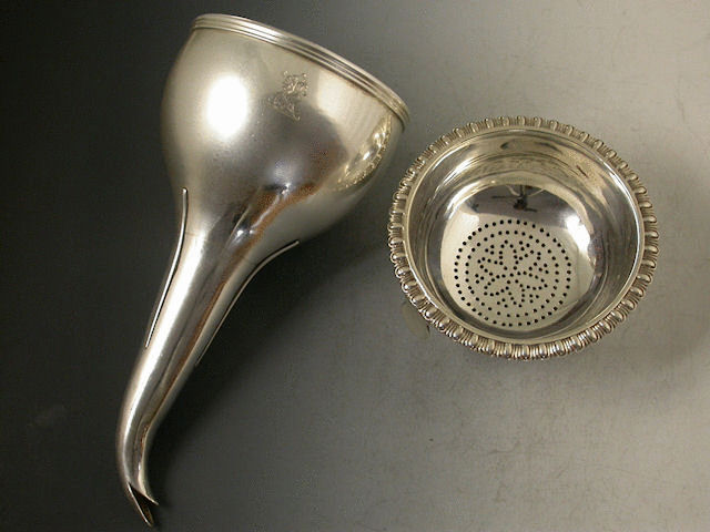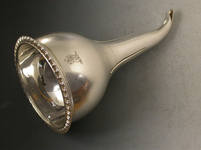 A very fine George IV plain silver Wine Funnel with four applied straps to the body, the detachable strainer with raised ovolo border. Engraved with a lions head crest.