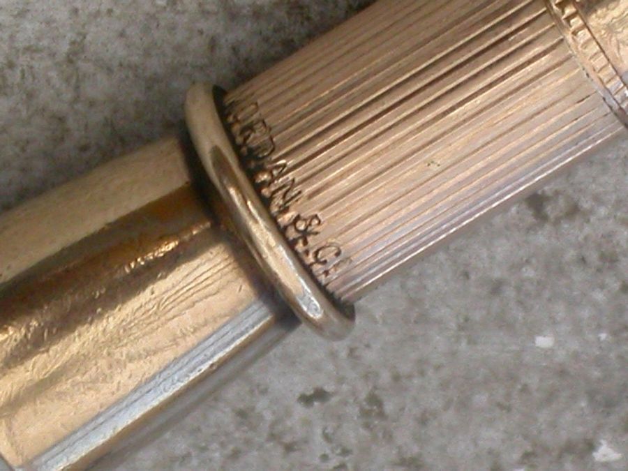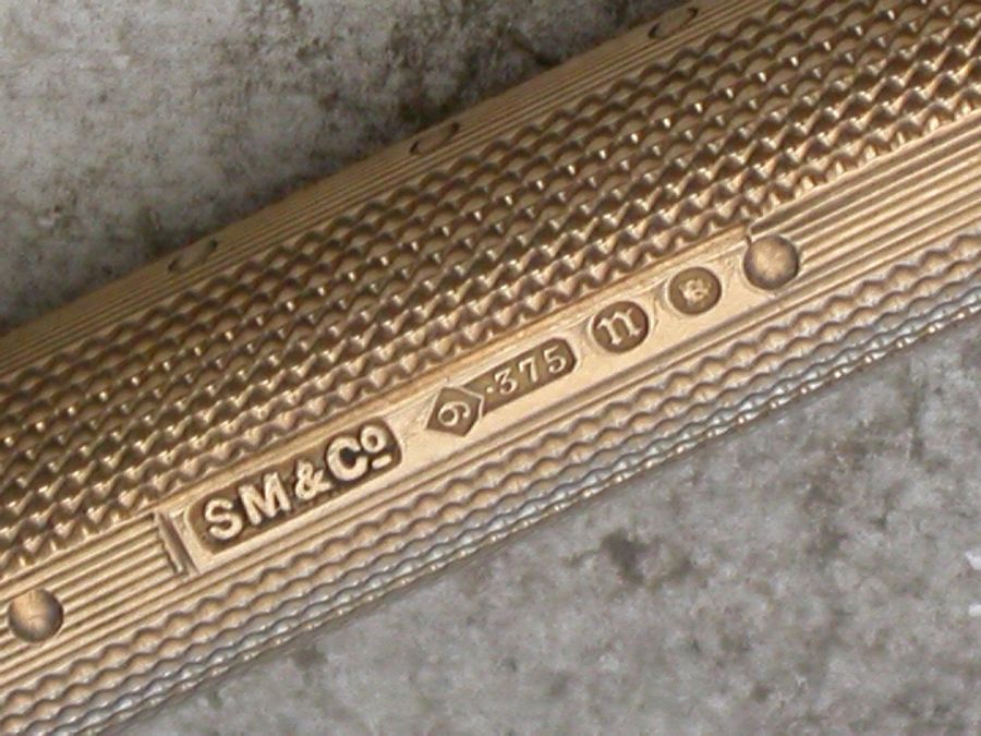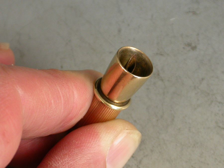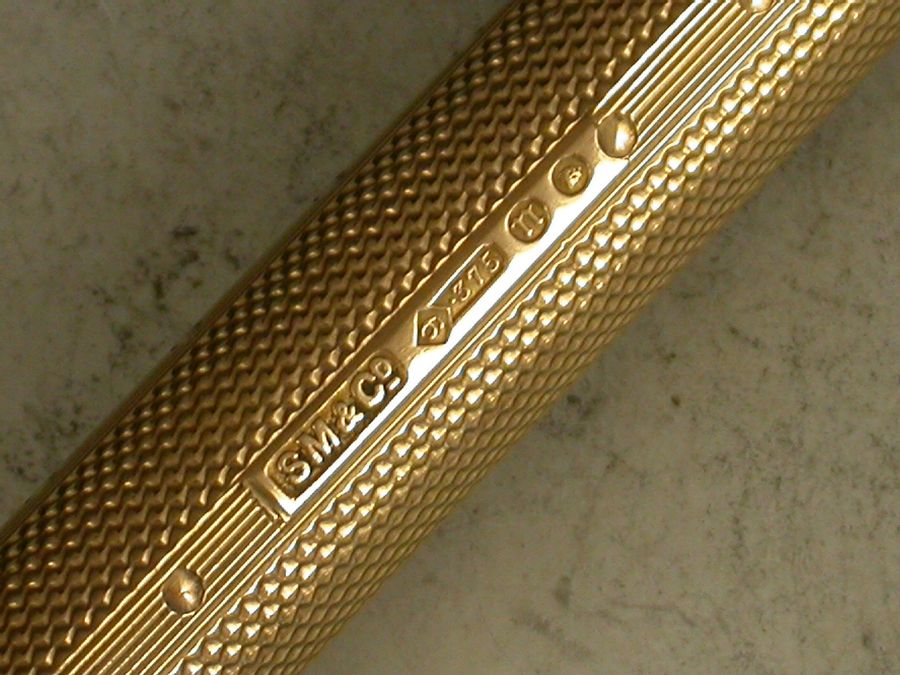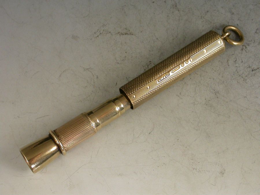 A good quality George V 9 carat gold sprung Cigar Piercer of tubular form, with engine turned line and dot decoration to the sheath, attached suspension ring. The metal piercer with sprung push button mechanism.