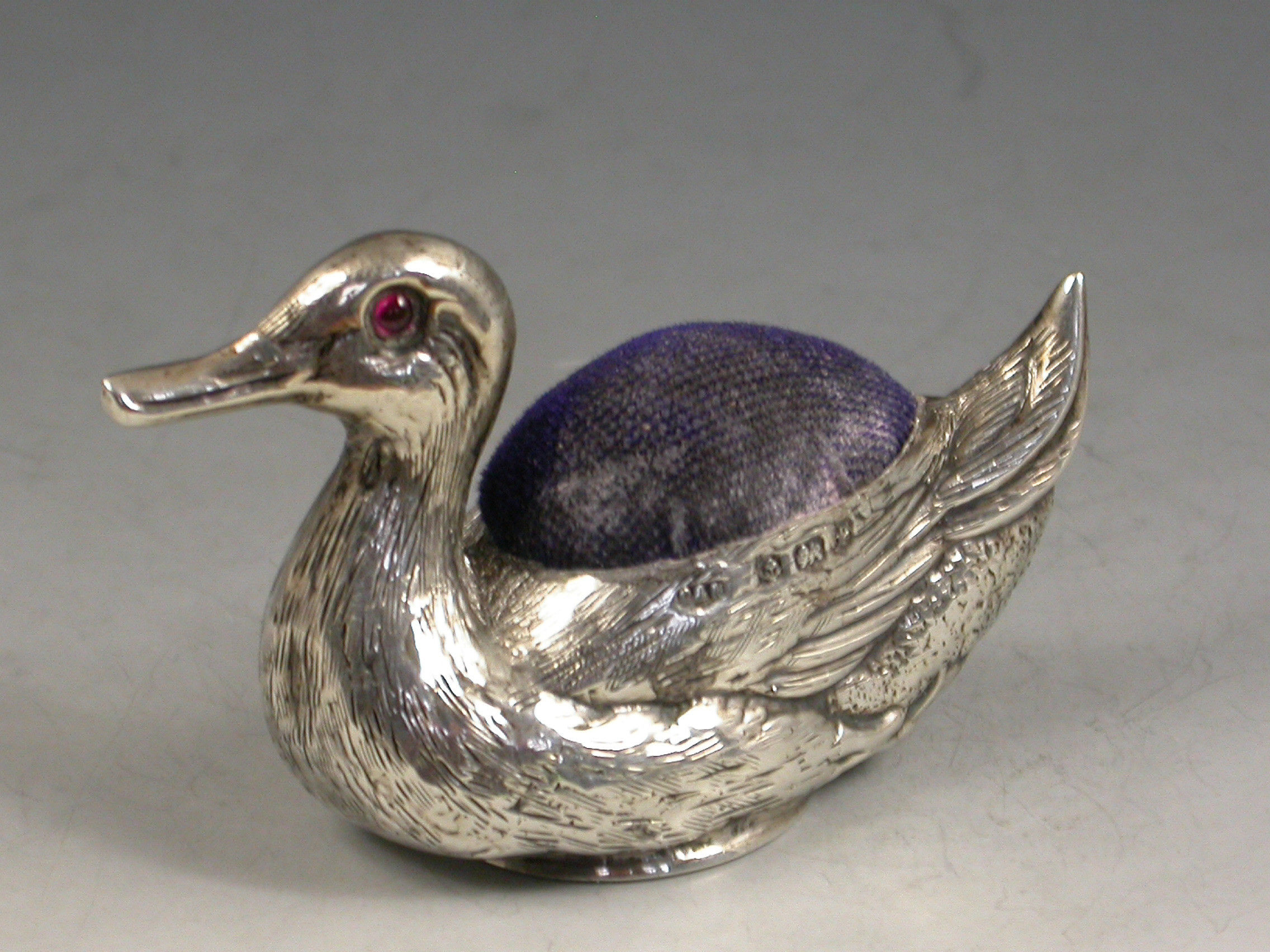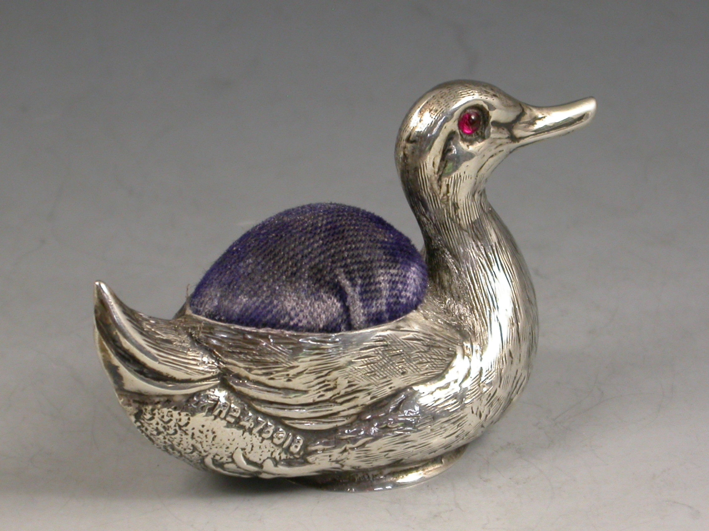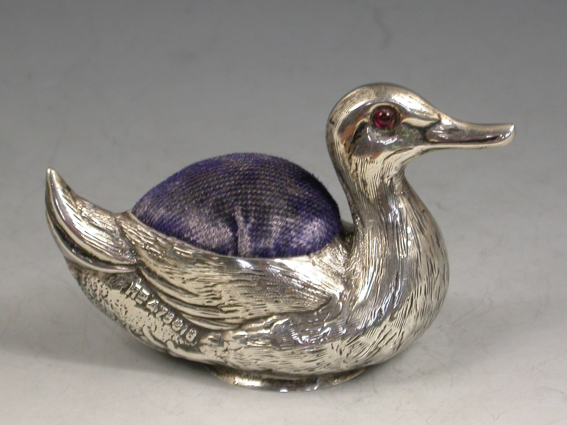 A rare Edwardian novelty silver Pin Cushion, made in the form of a swimming Duck with up-turned tail, complete with ruby red glass eyes and blue velvet cushion. Realistically modeled complete with trailing webbed feet.