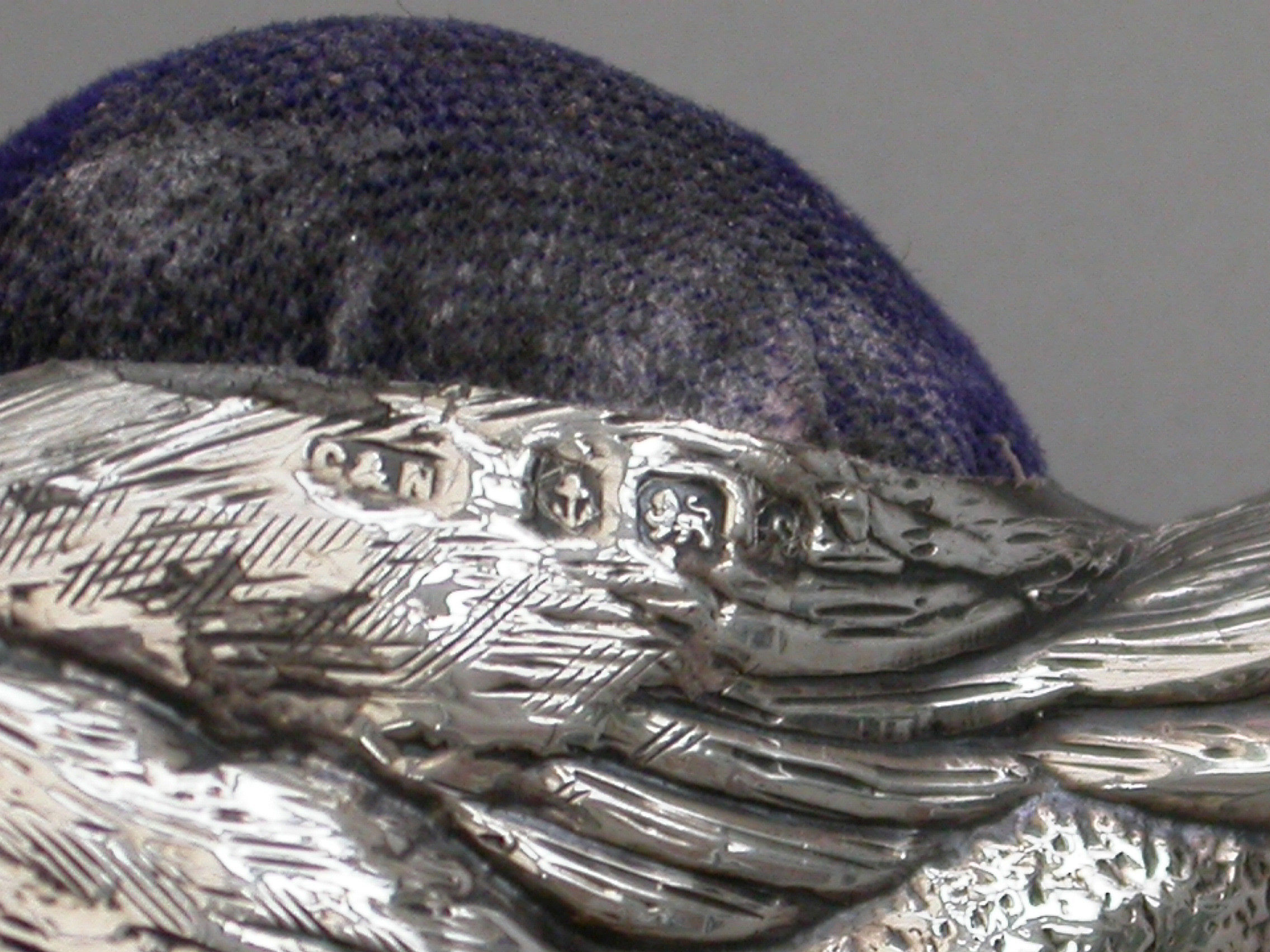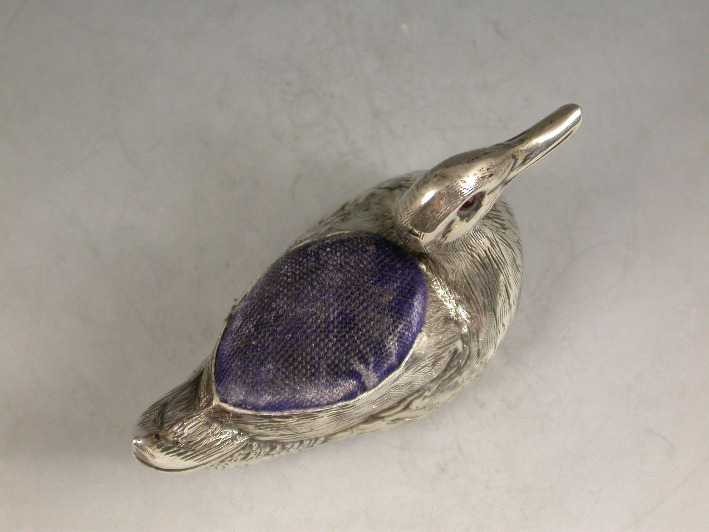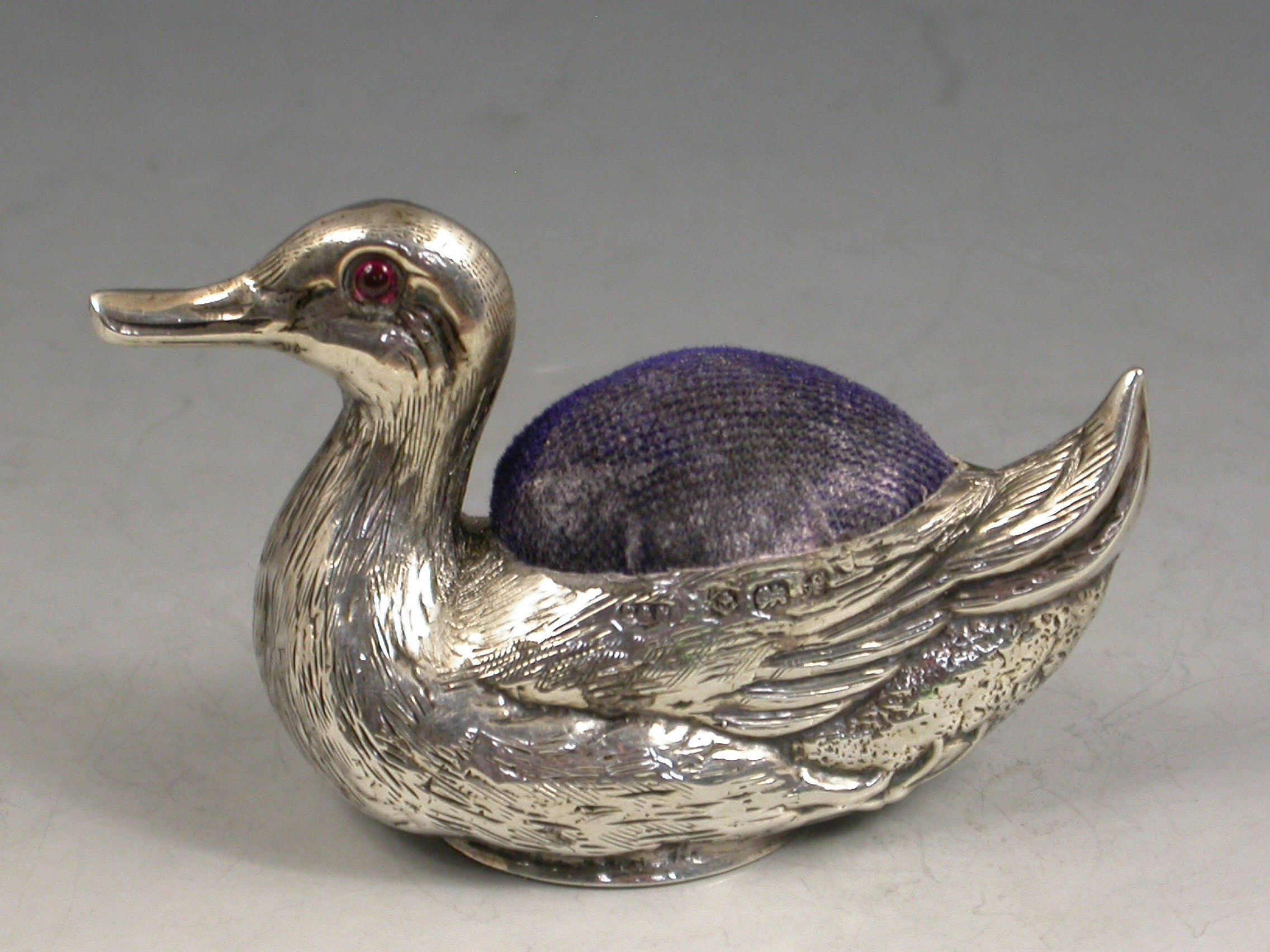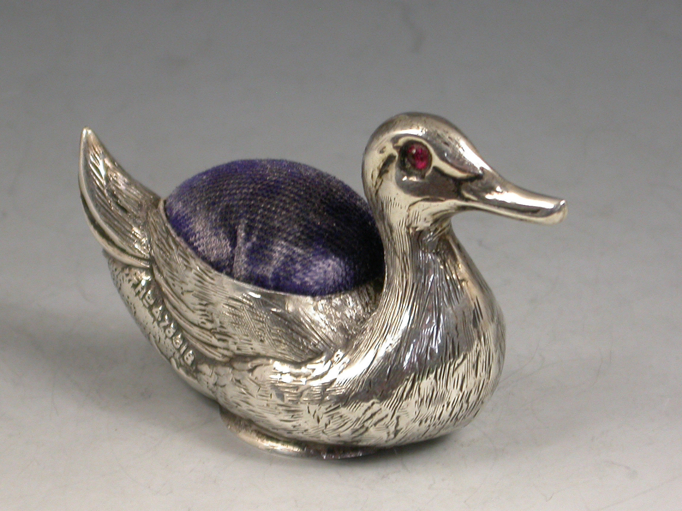 A rare Edwardian novelty silver Pin Cushion, made in the form of a swimming Duck with up-turned tail, complete with ruby red glass eyes and blue velvet cushion. Realistically modeled complete with trailing webbed feet.