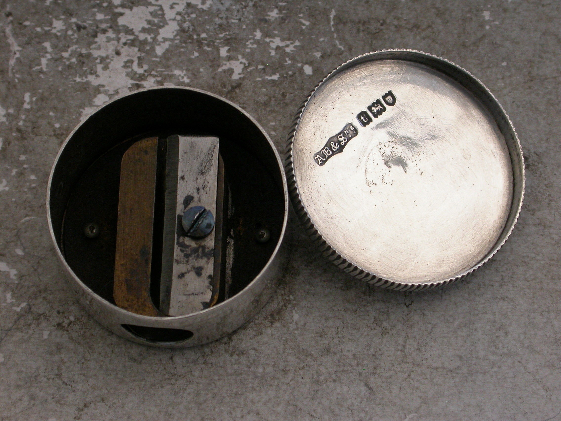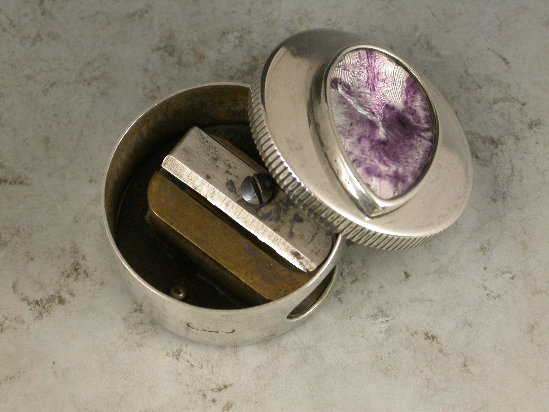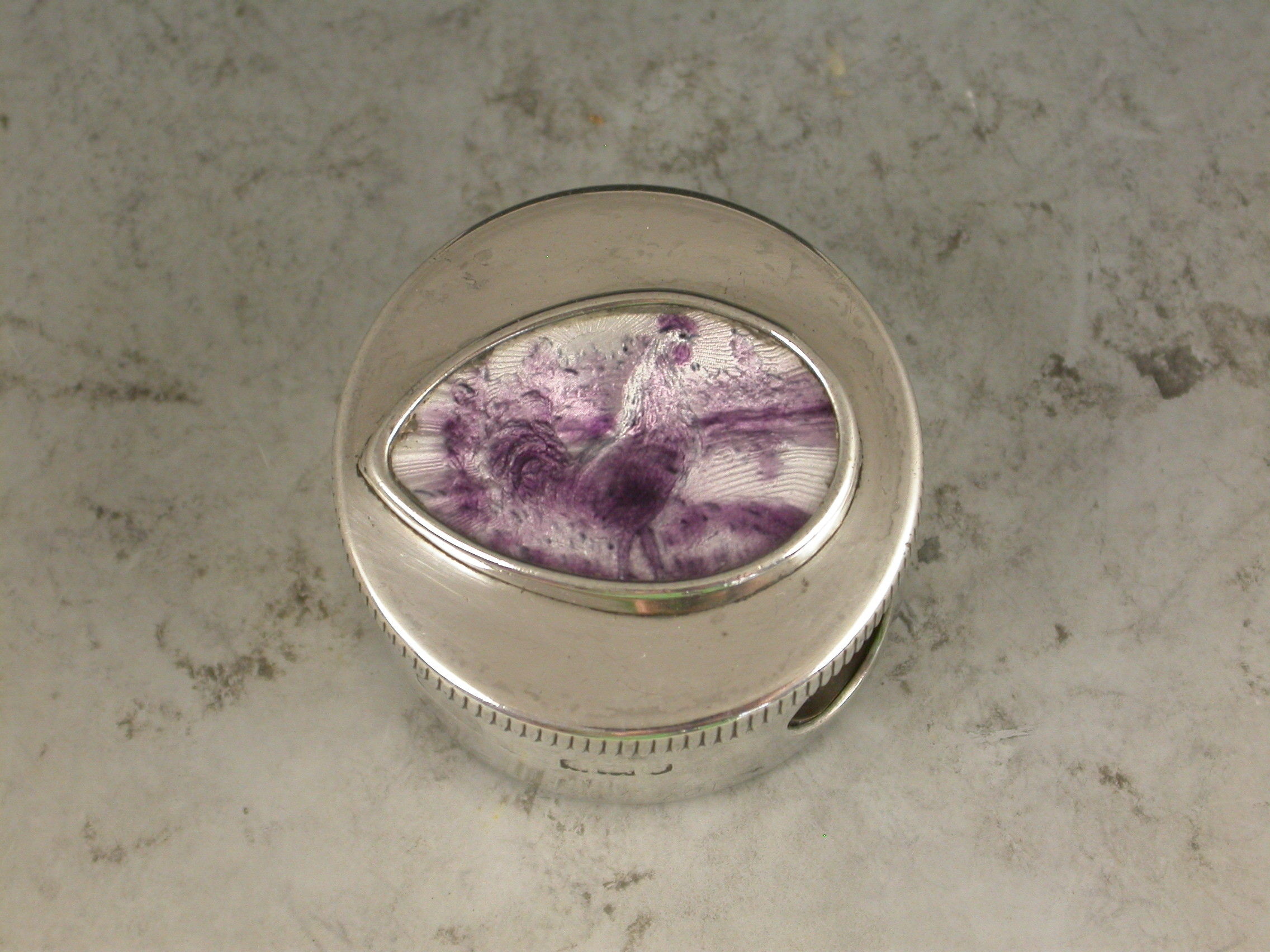 An unusual early 20th century silver and enamel Pocket Pencil Sharpener of circular form with pull-off lid. The lid set with a tear-drop shaped panel decorated with puce guilloche enamel depicting a cockerel in a landscape scene with a sunrise in the background.