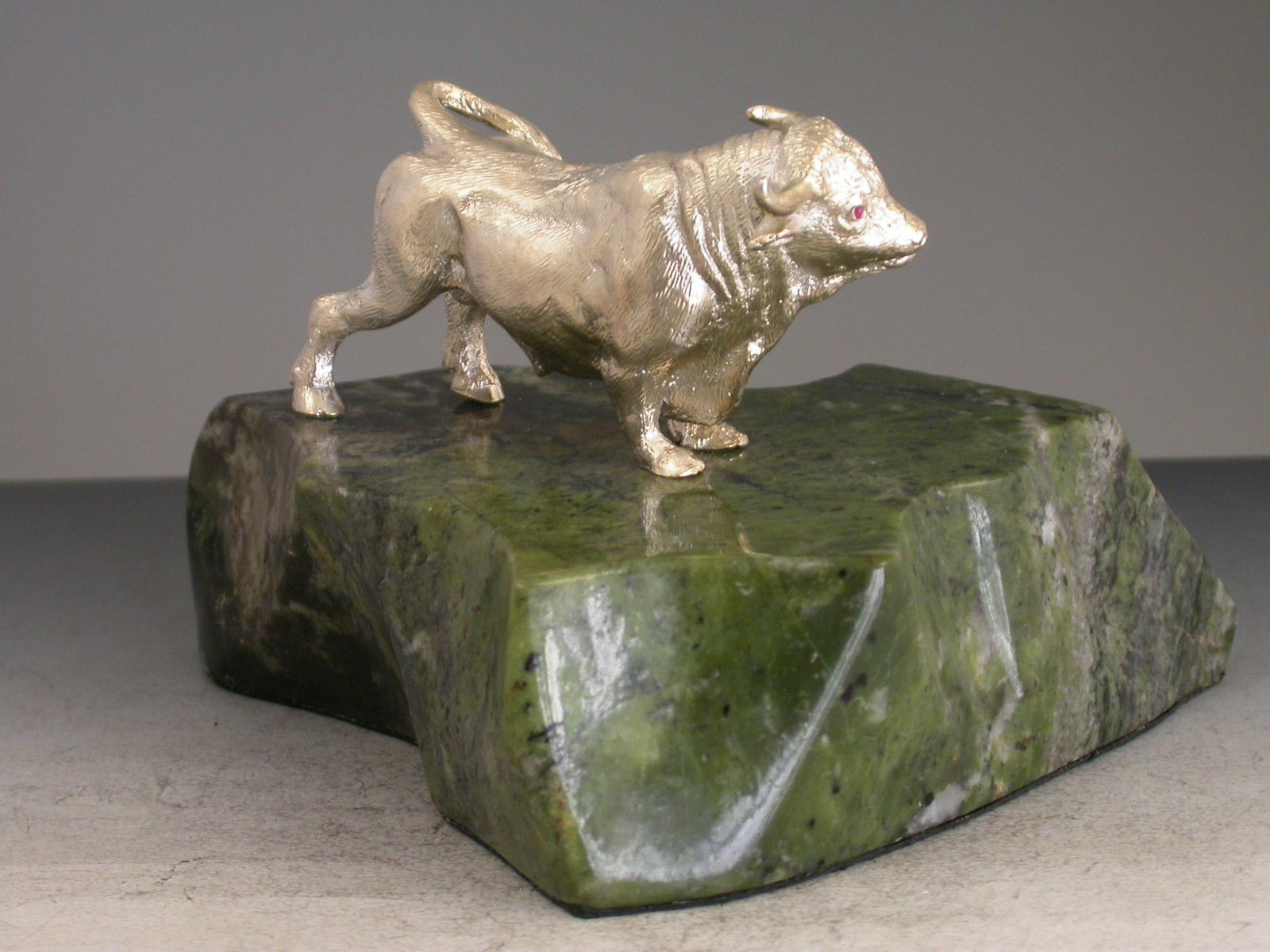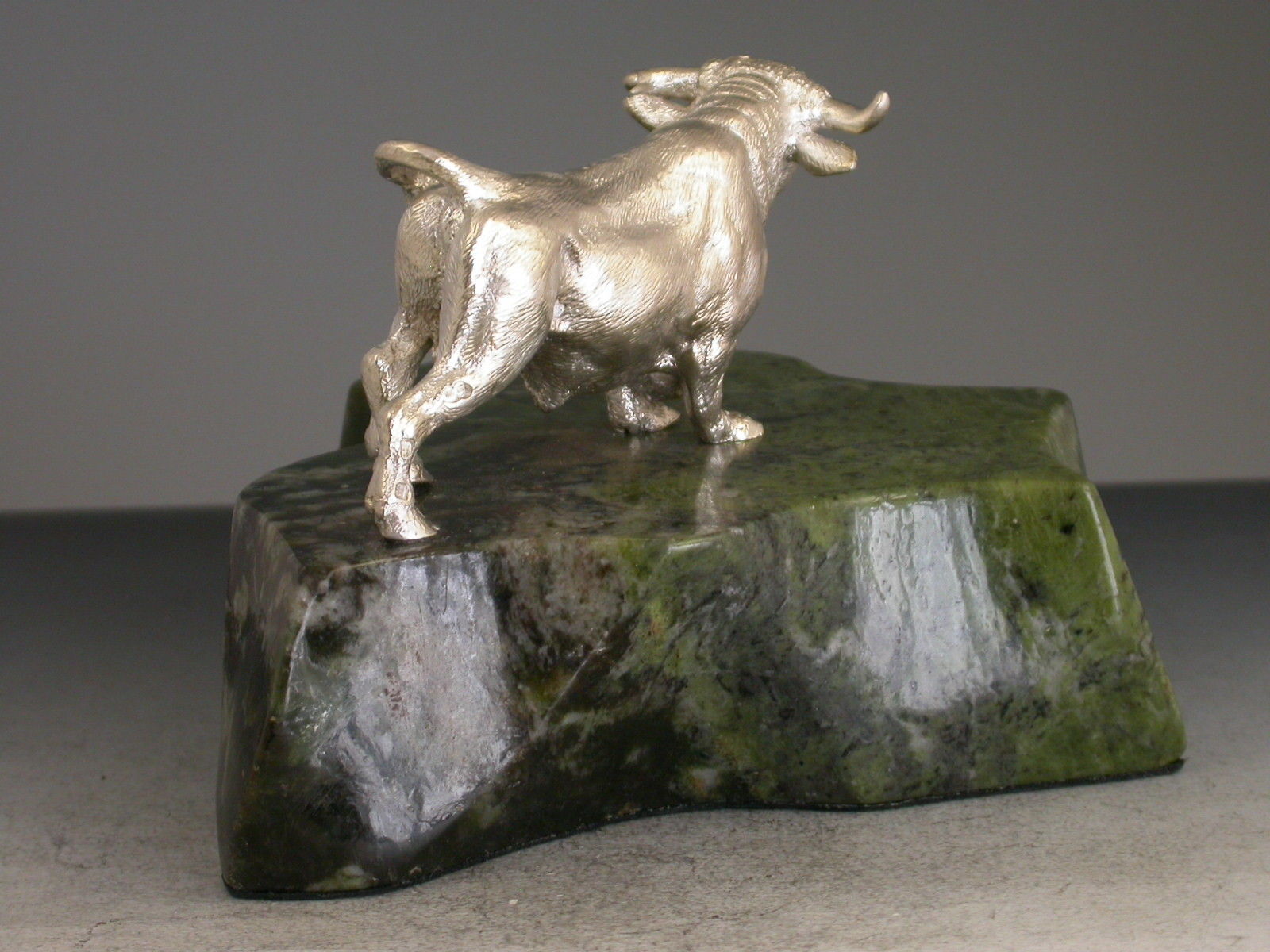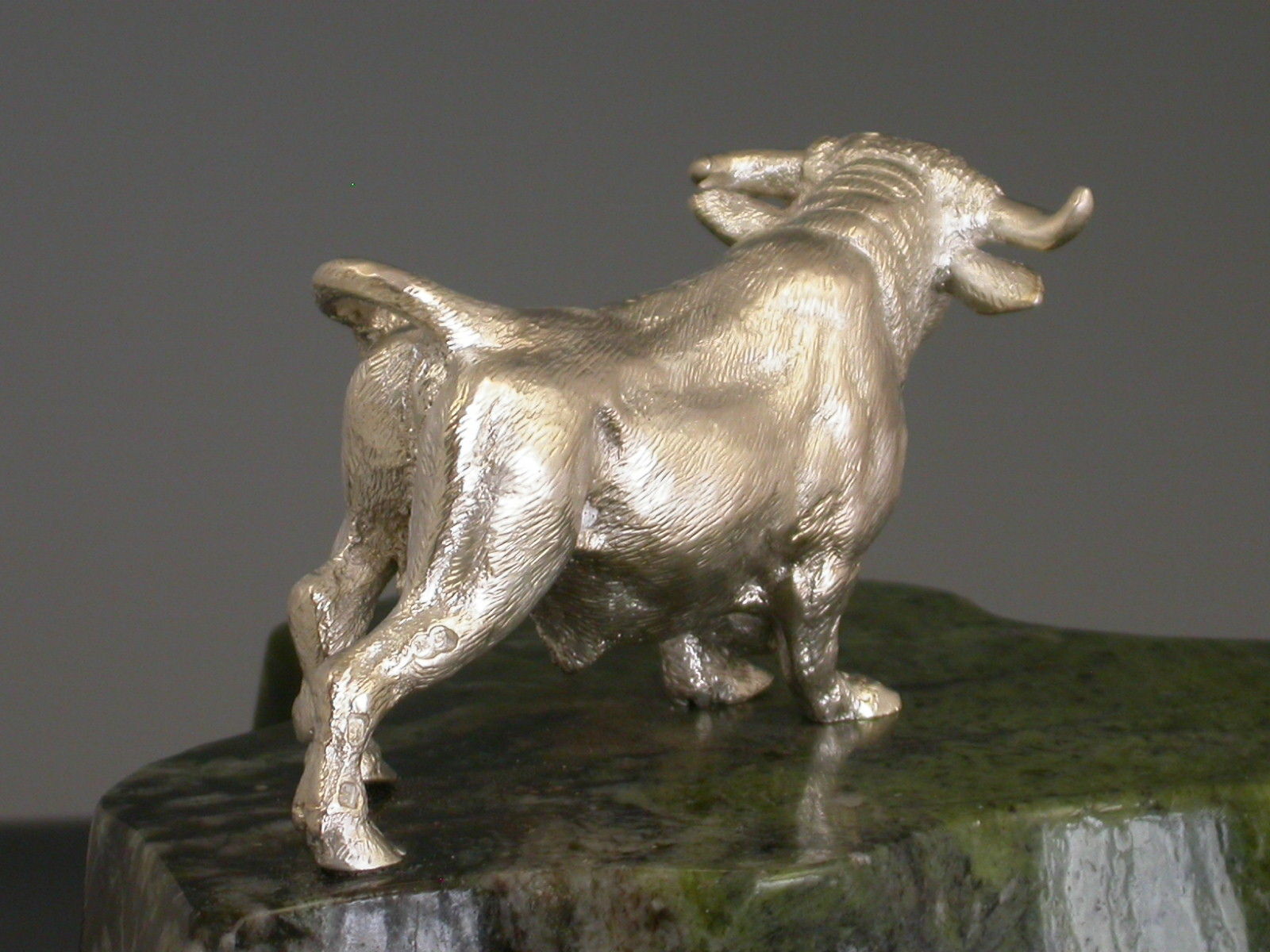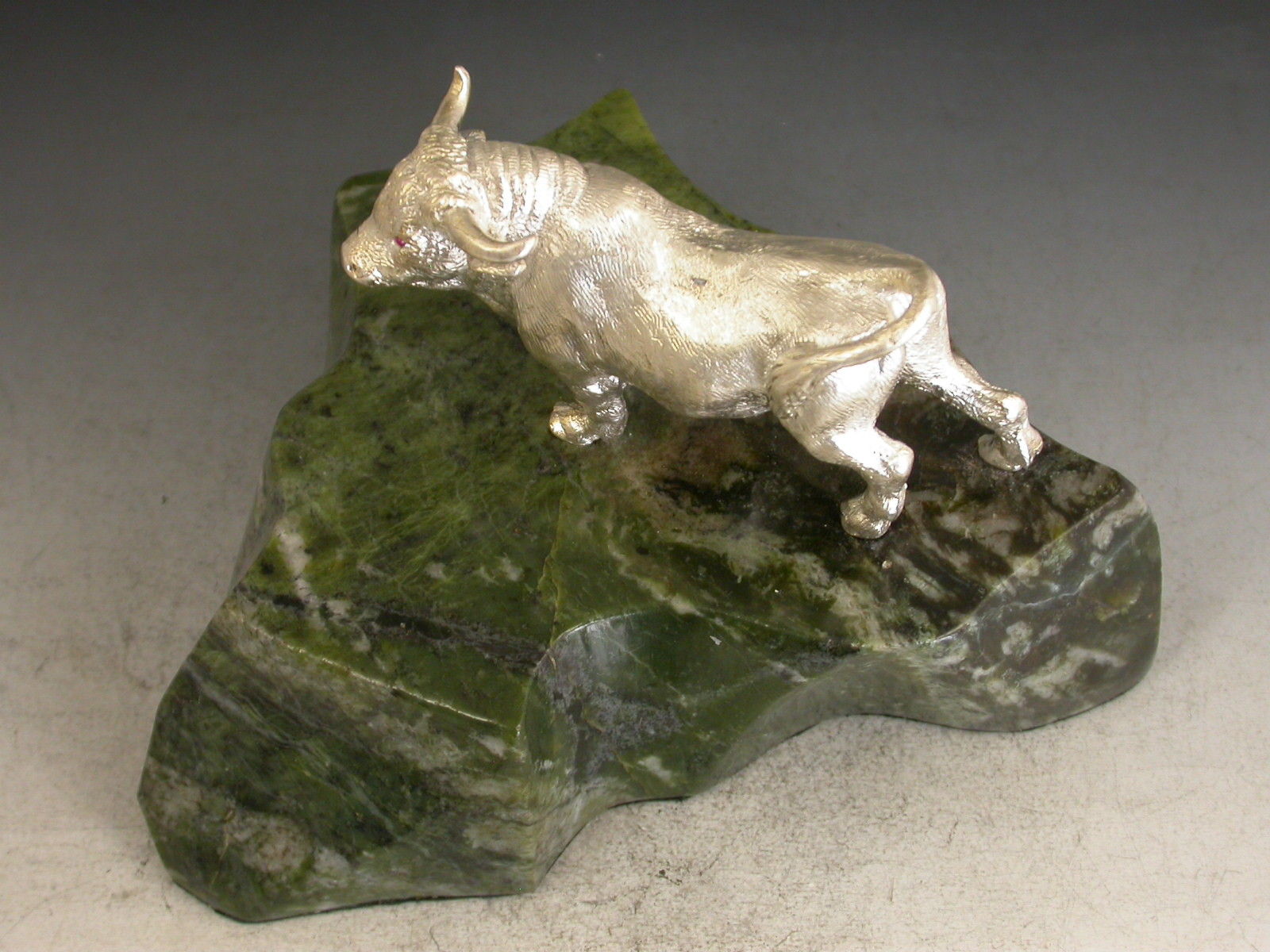 A very fine quality George V cast silver model of a Bull standing on a shaped green Connemara marble base, red glass or garnet eyes. Realistically modelled and very well defined.