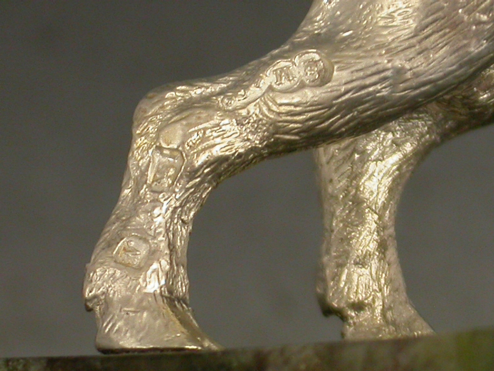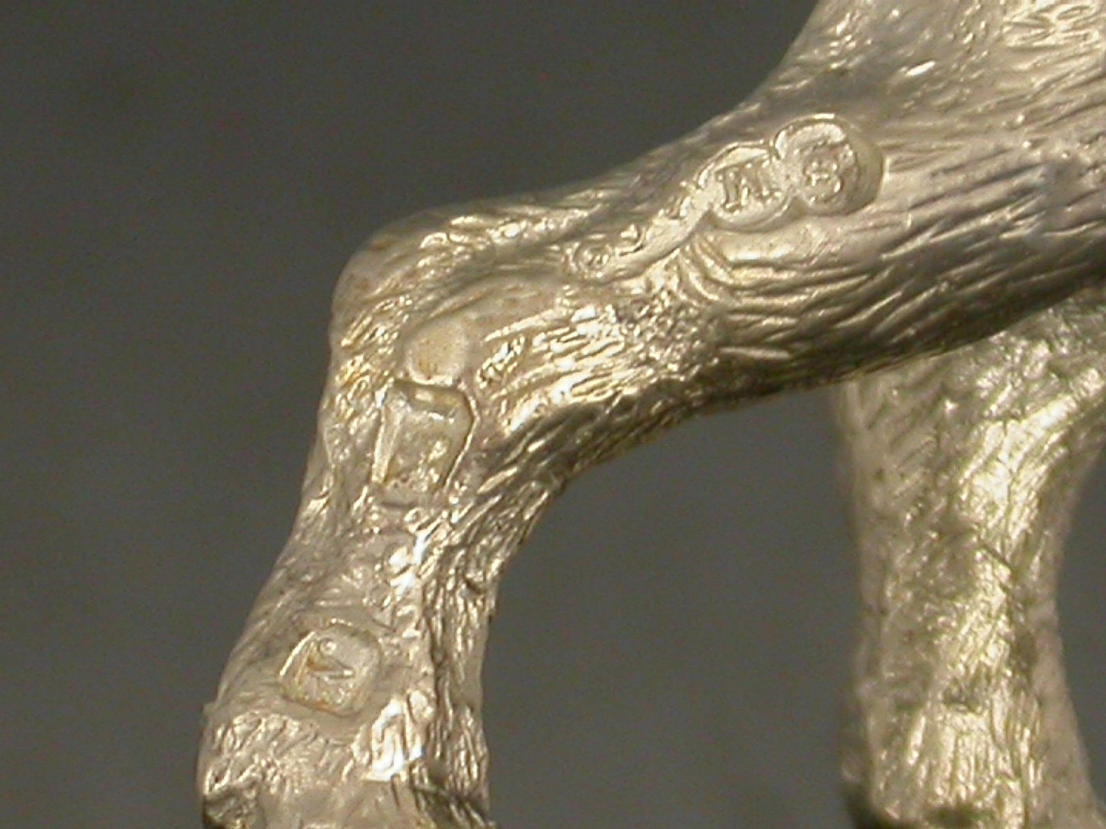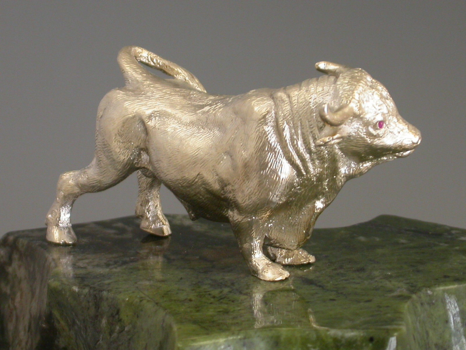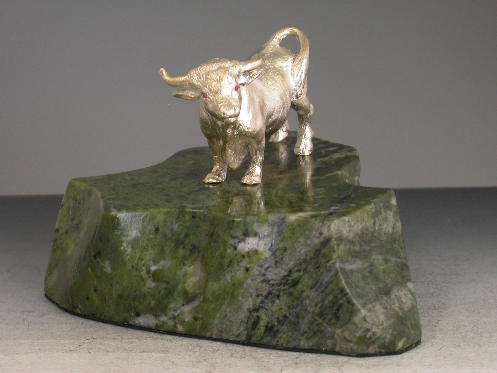 A very fine quality George V cast silver model of a Bull standing on a shaped green Connemara marble base, red glass or garnet eyes. Realistically modelled and very well defined.