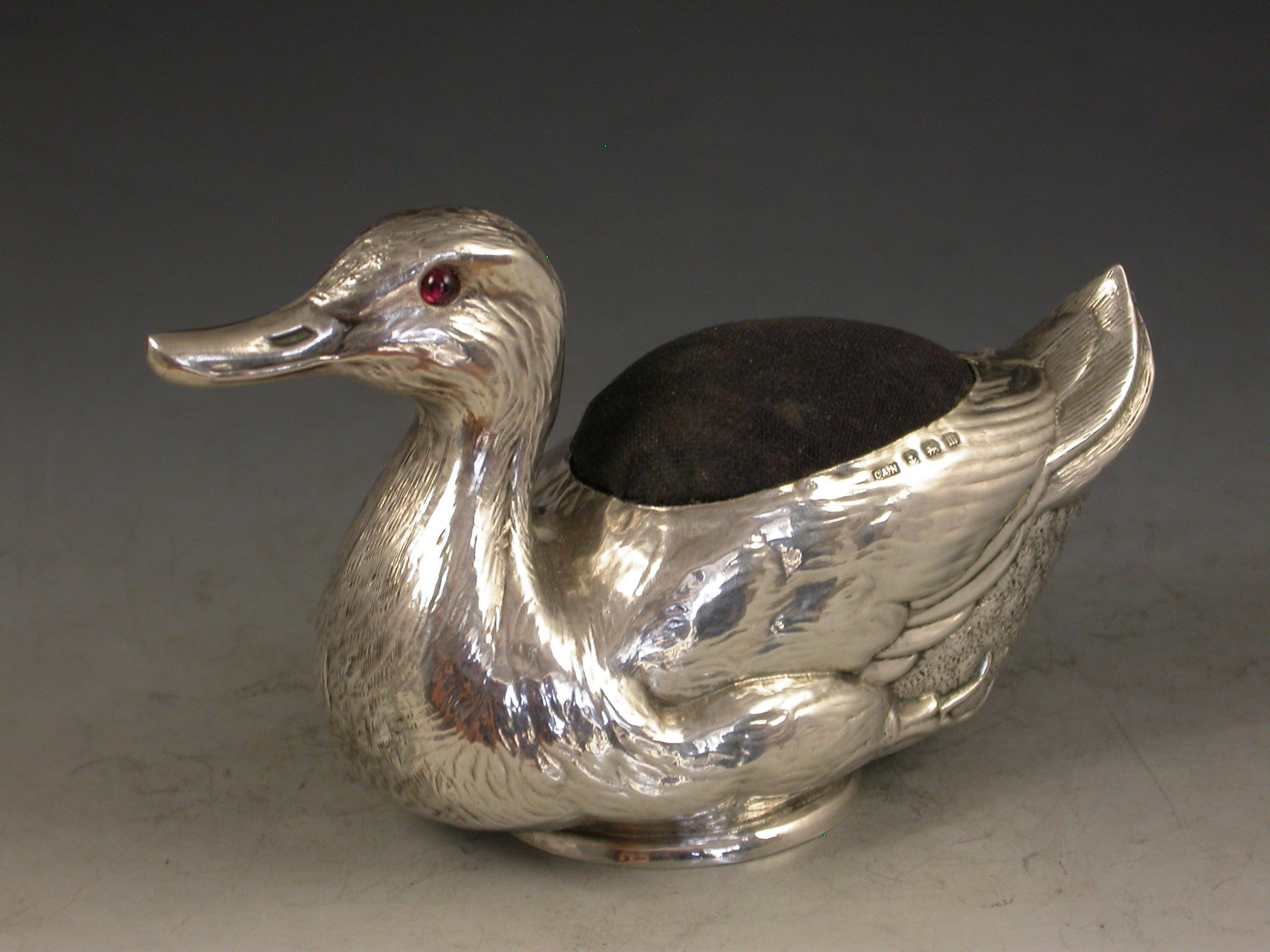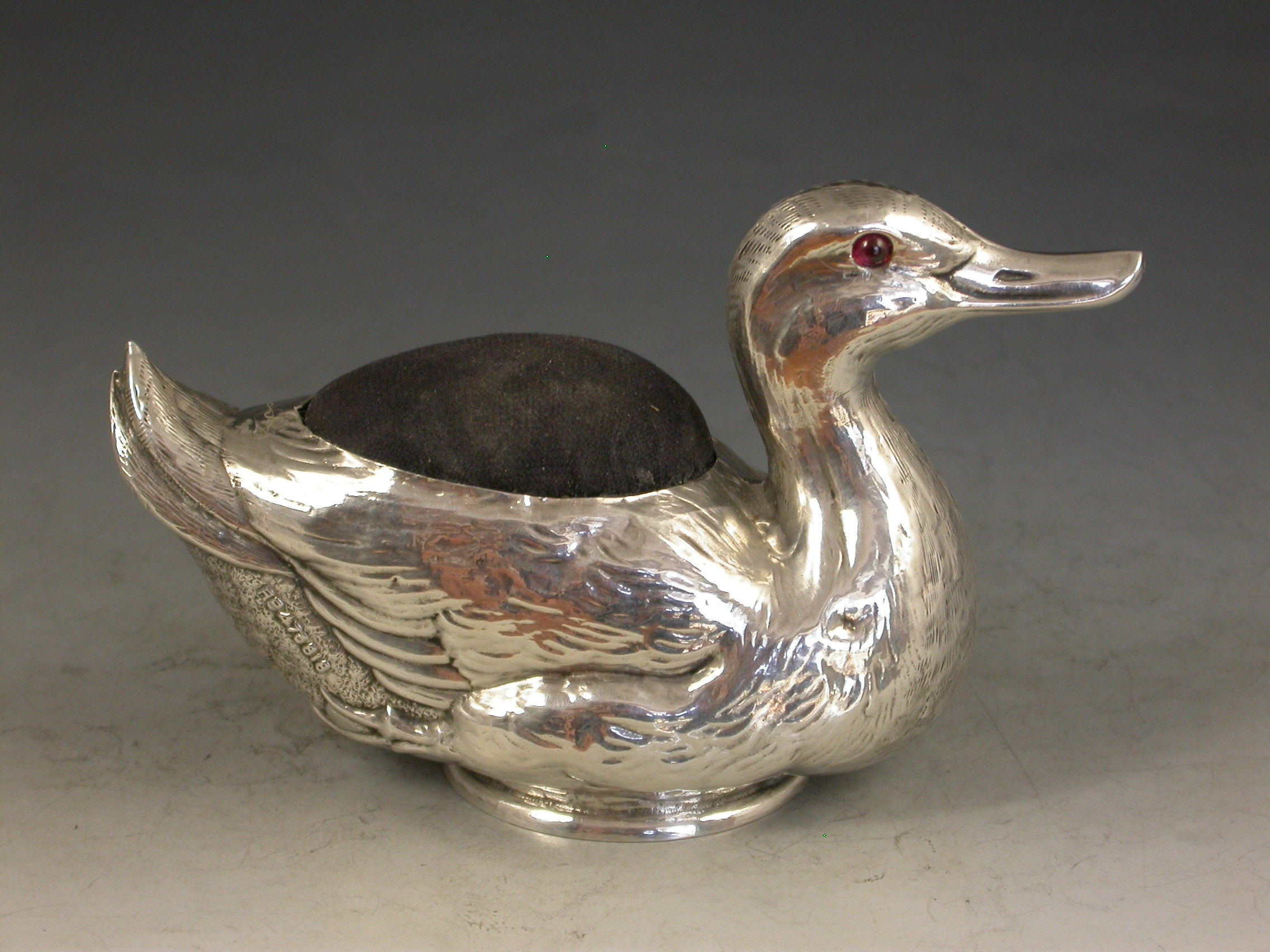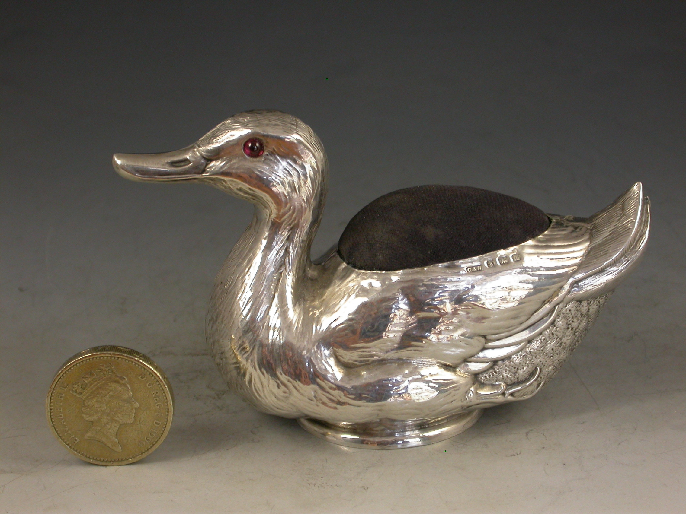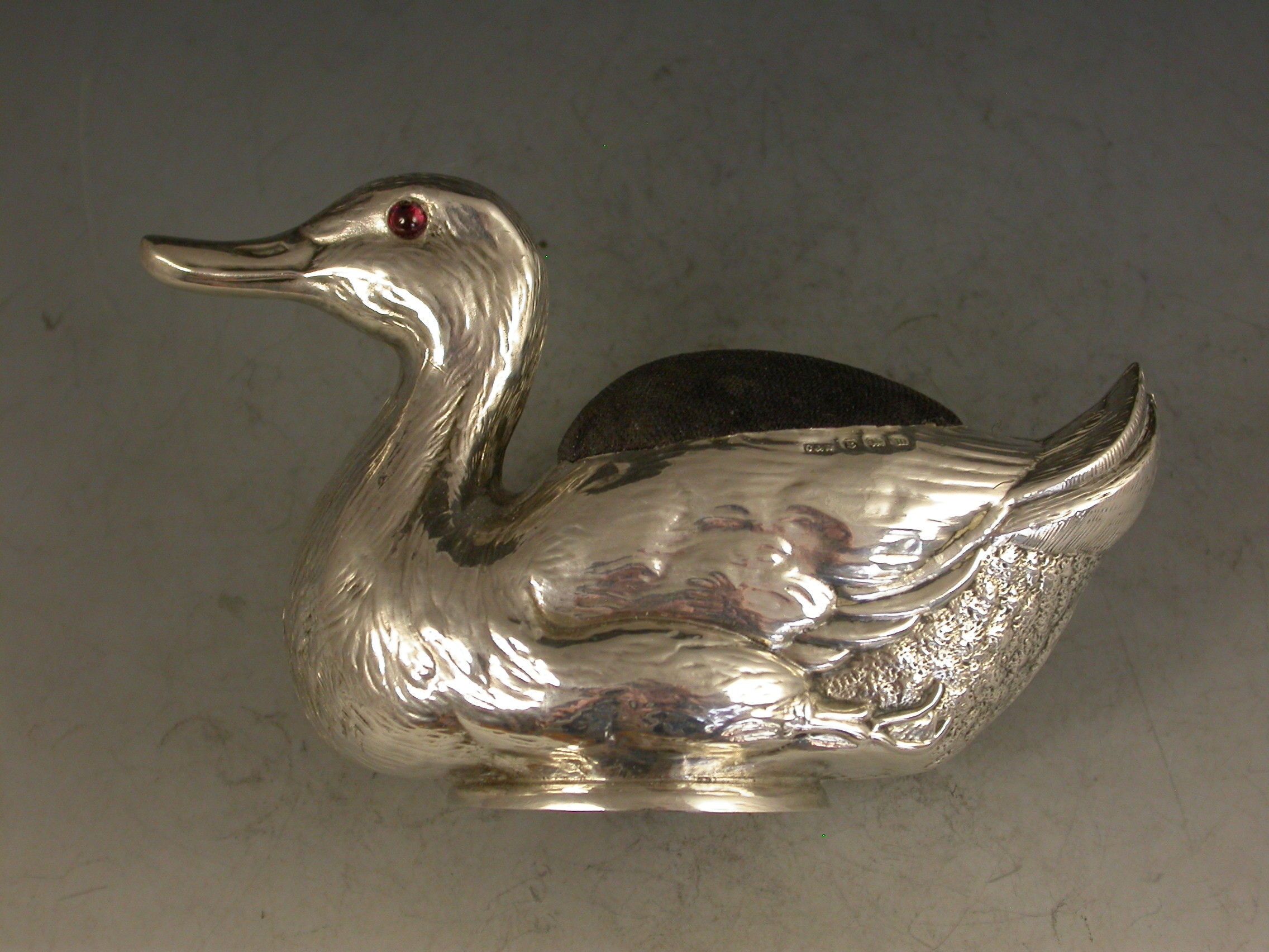A rare Edwardian novelty silver Pin Cushion of unusually large size, made in the form of a swimming Duck with up-turned tail, complete with red glass eyes and blue velvet cushion. Realistically modelled complete with trailing webbed feet.