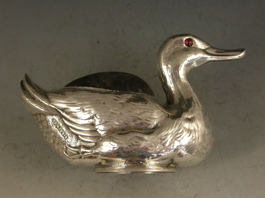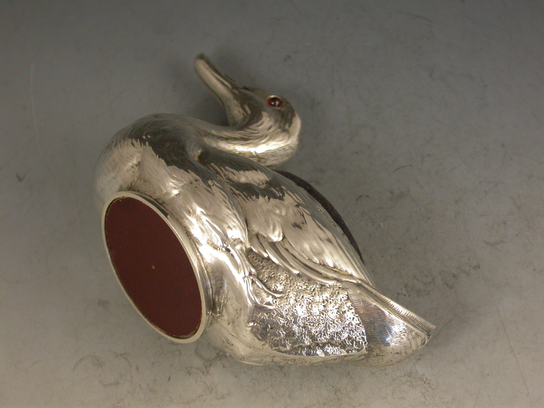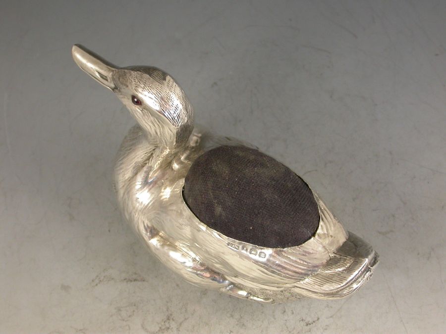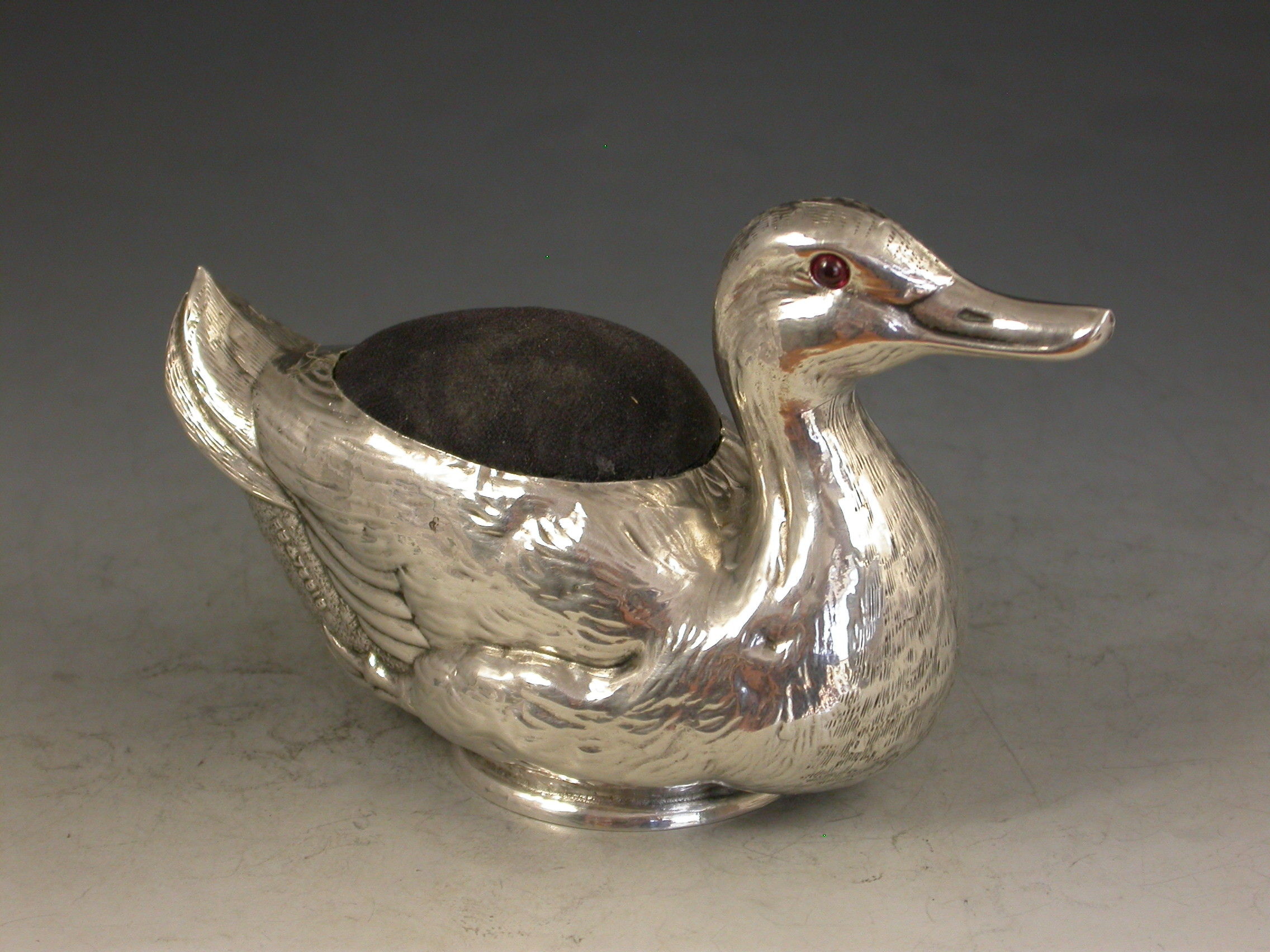 A rare Edwardian novelty silver Pin Cushion of unusually large size, made in the form of a swimming Duck with up-turned tail, complete with red glass eyes and blue velvet cushion. Realistically modelled complete with trailing webbed feet.