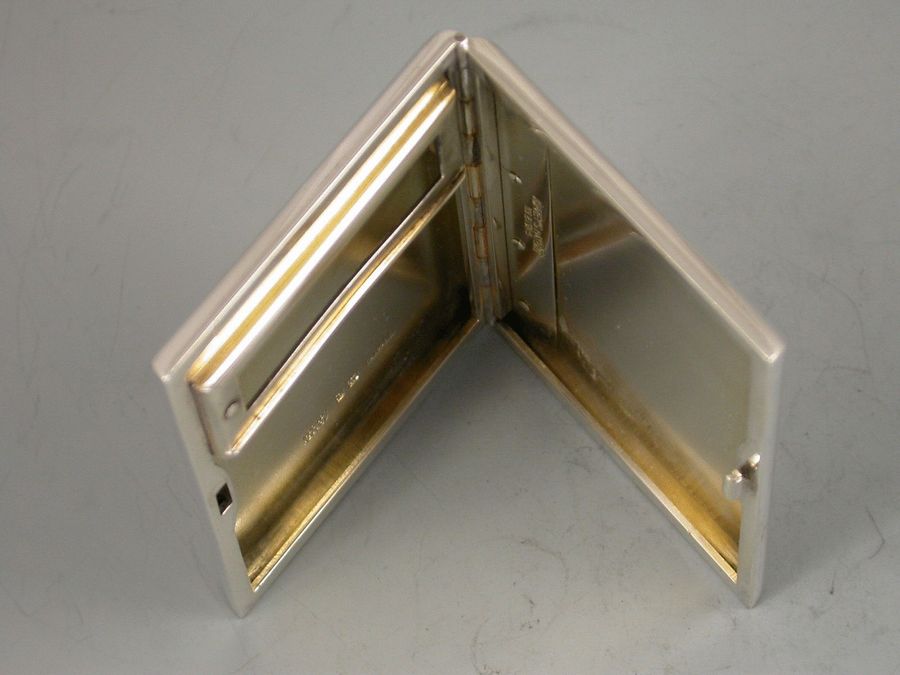 A George V novelty silver Patented Match Book Case in the form of an engine turned Cigarette Case, with trick opening slide action sprung hinged cover, silver gilt interior.