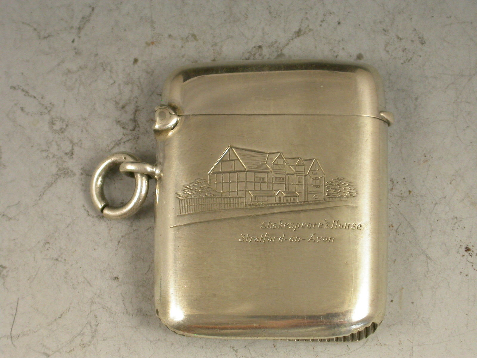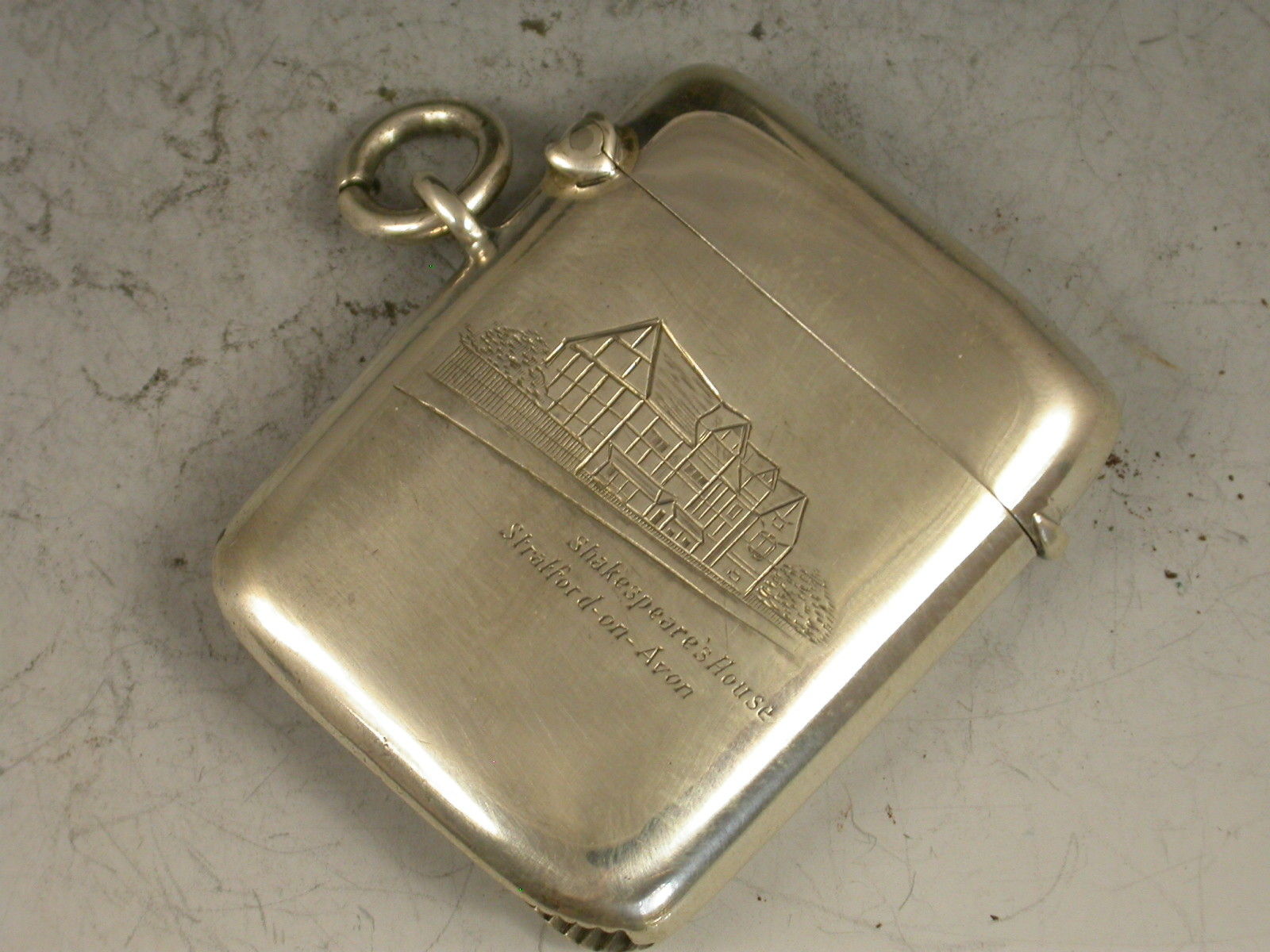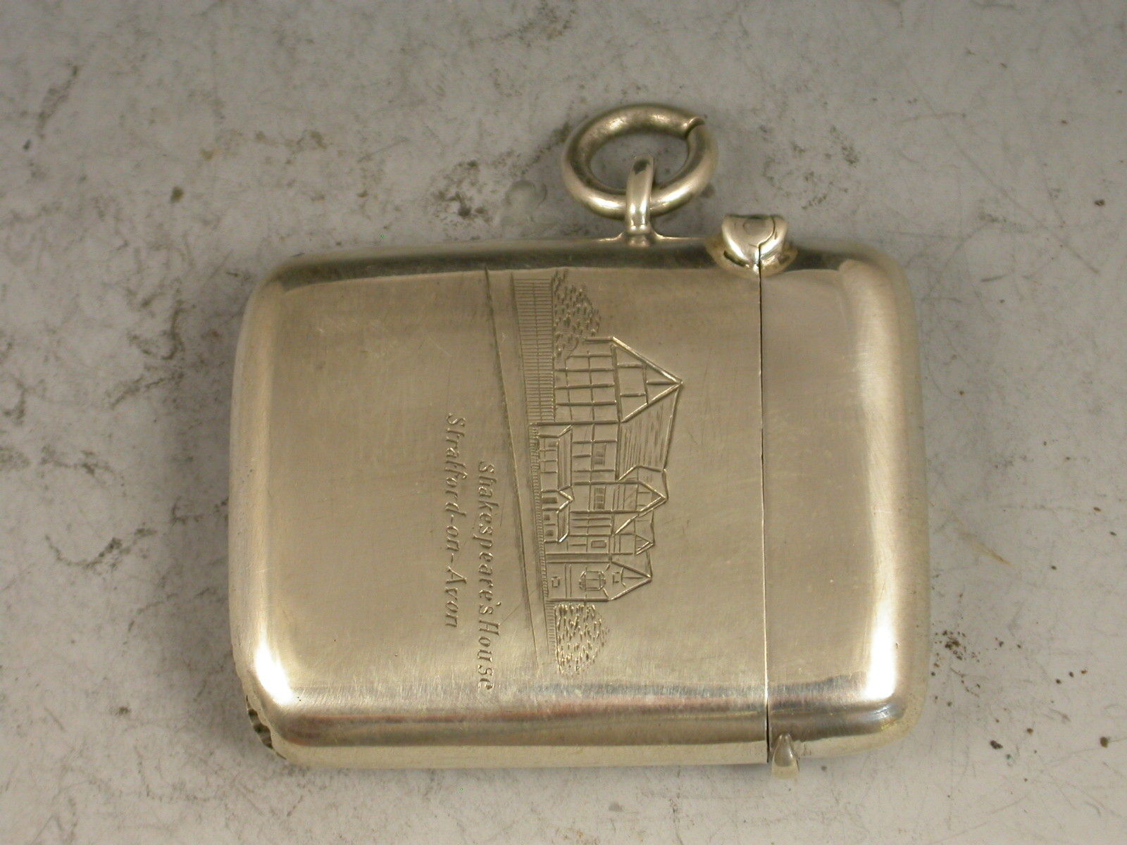 A rare George V silver Vesta Case of rounded rectangular form with attached suspension ring and hinged flip top lid. The face engraved with Shakespear's House at Stratford-On-Avon.