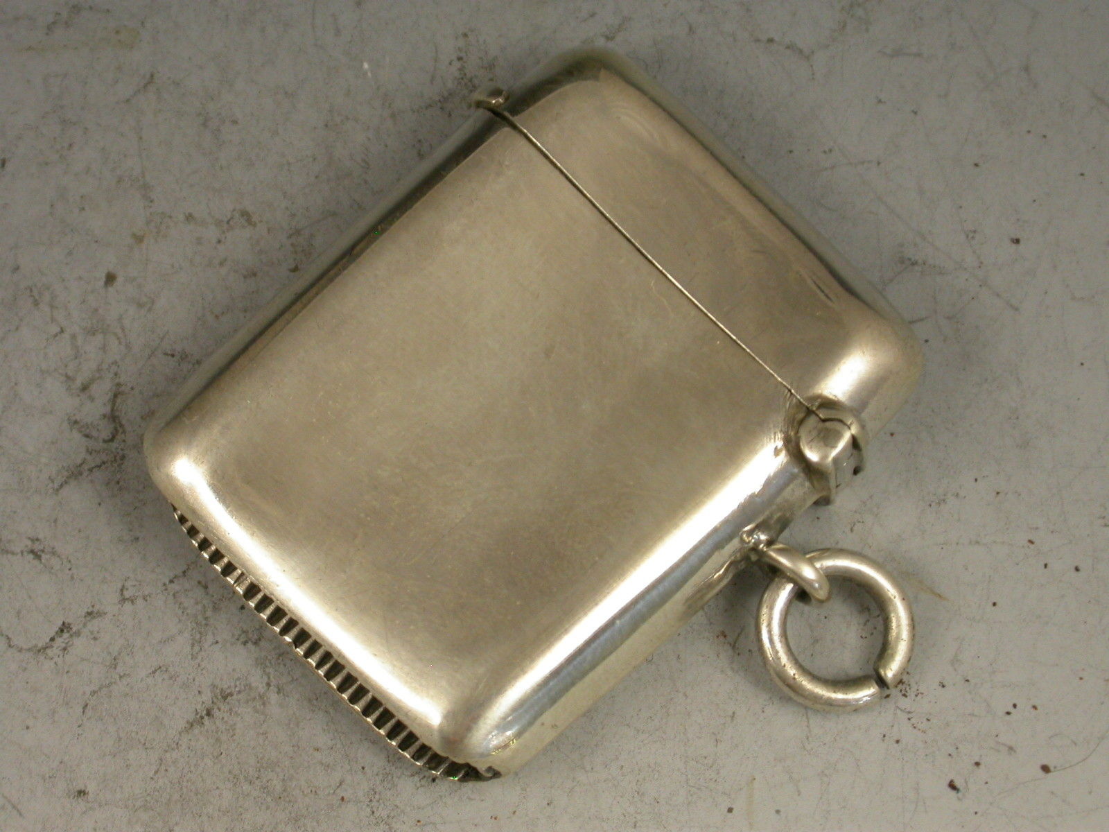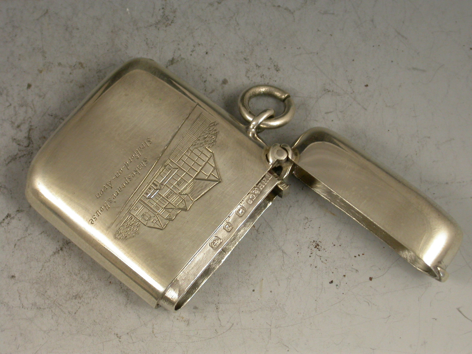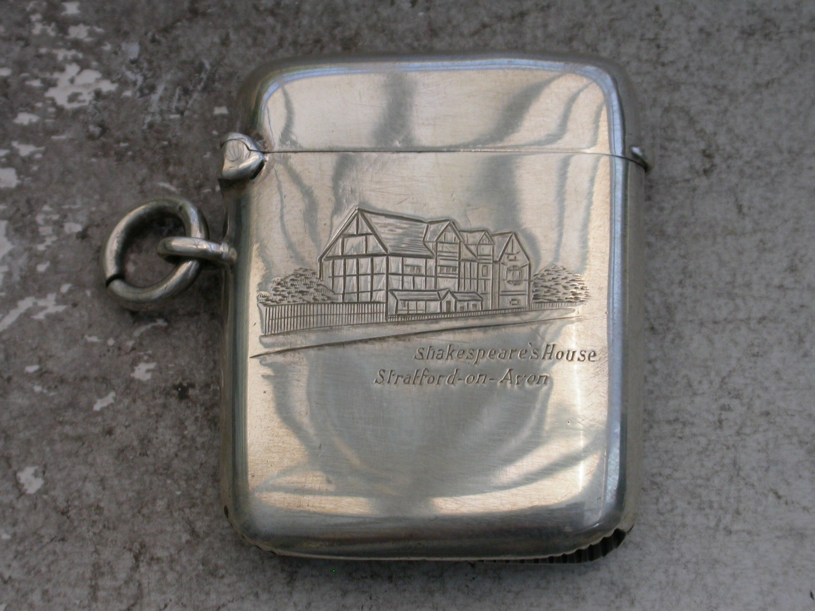 A rare George V silver Vesta Case of rounded rectangular form with attached suspension ring and hinged flip top lid. The face engraved with Shakespear's House at Stratford-On-Avon.