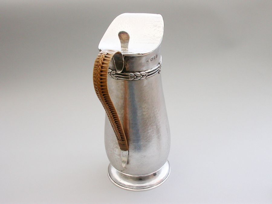 A good quality George V Arts & Crafts hammered silver lidded hot water Jug with wheat ear and Celtic designs around the neck, rattan braided handle.
