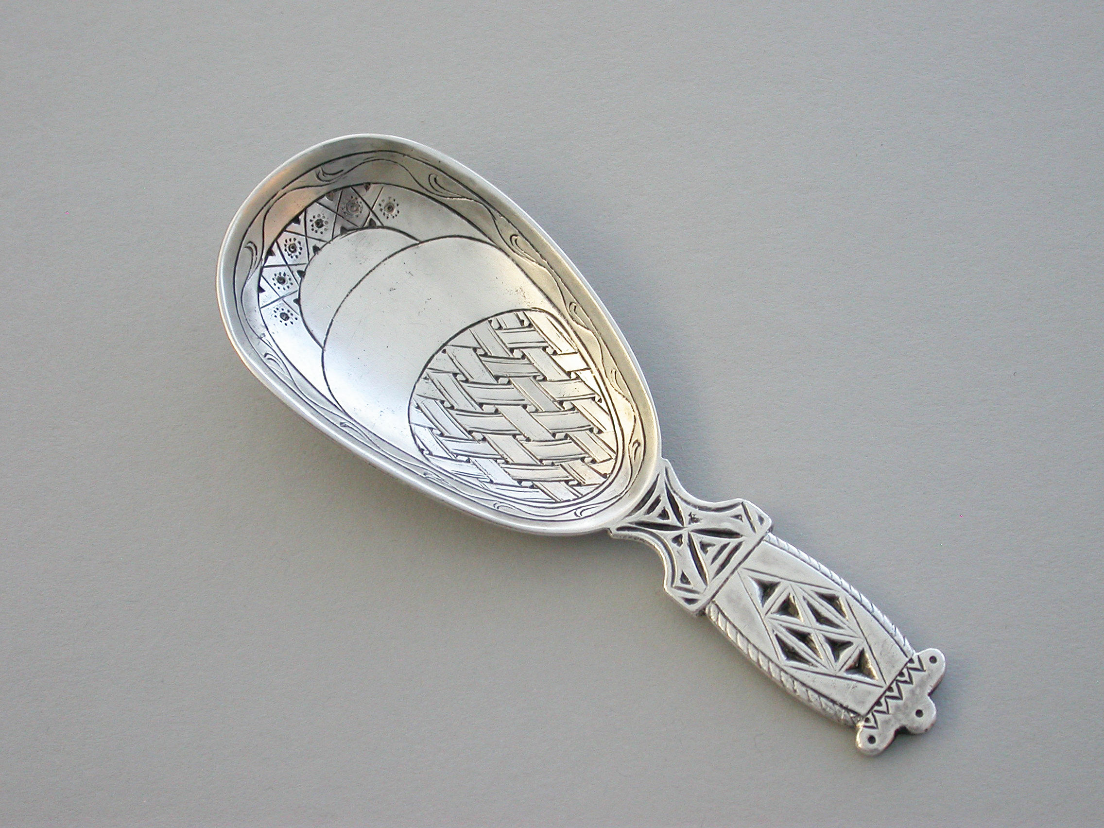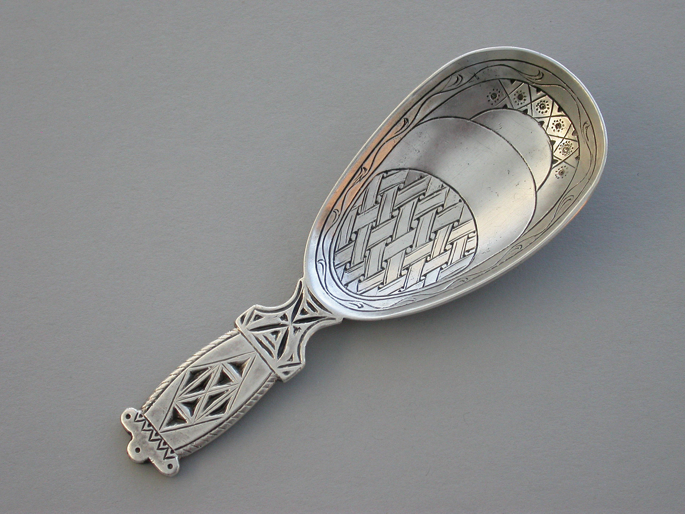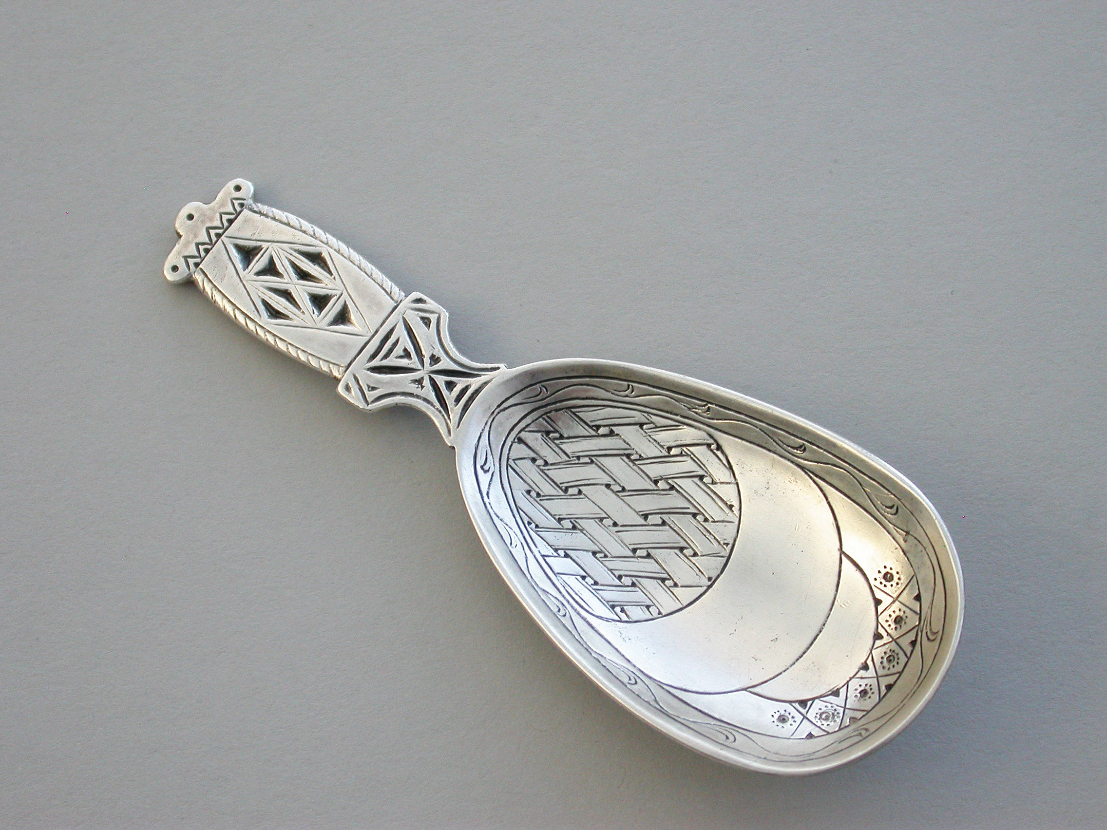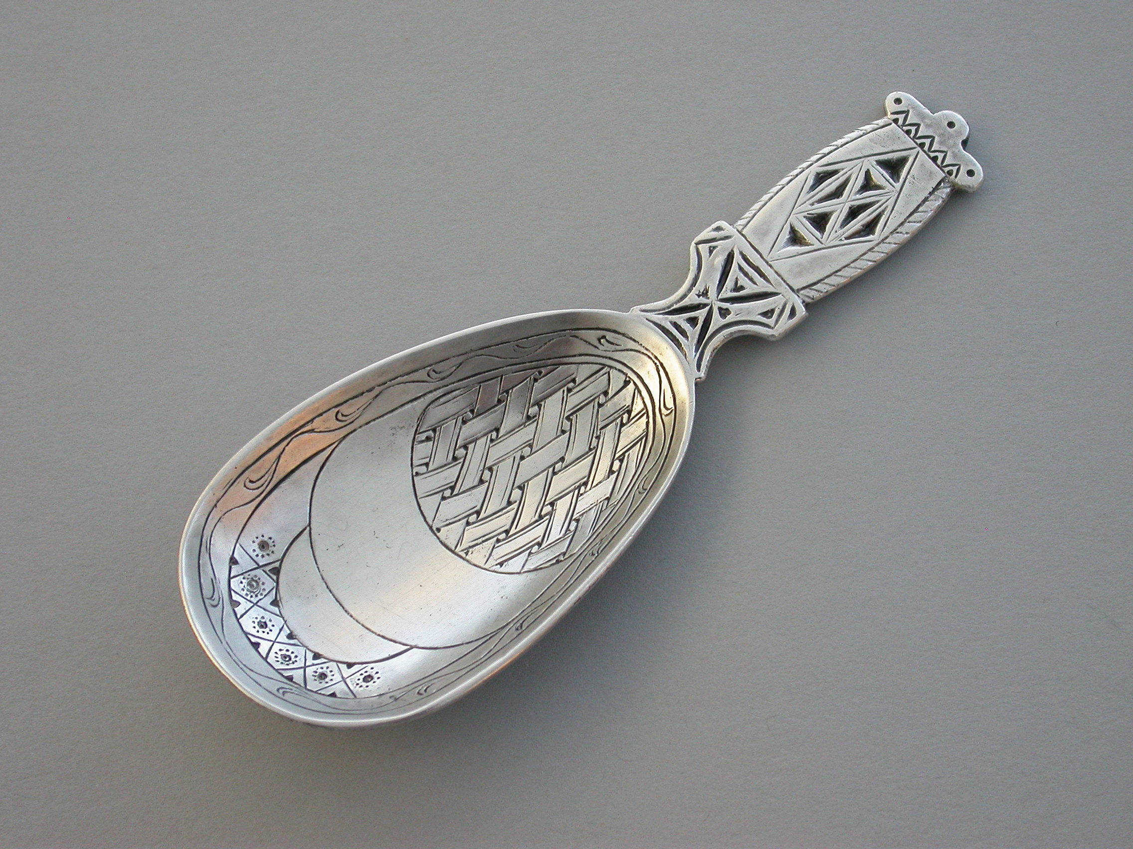 A good early 19th century Arts & Crafts style silver Caddy Spoon, the pear shaped bowl and shaped handle engraved with geometric Celtic patterns and deigns.