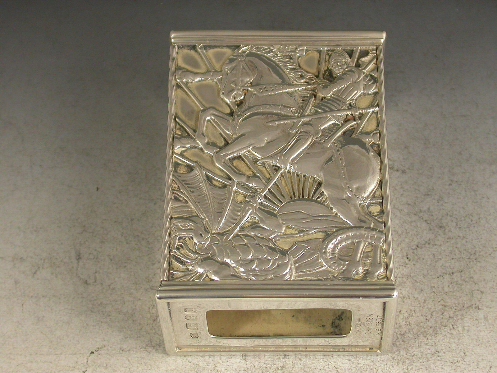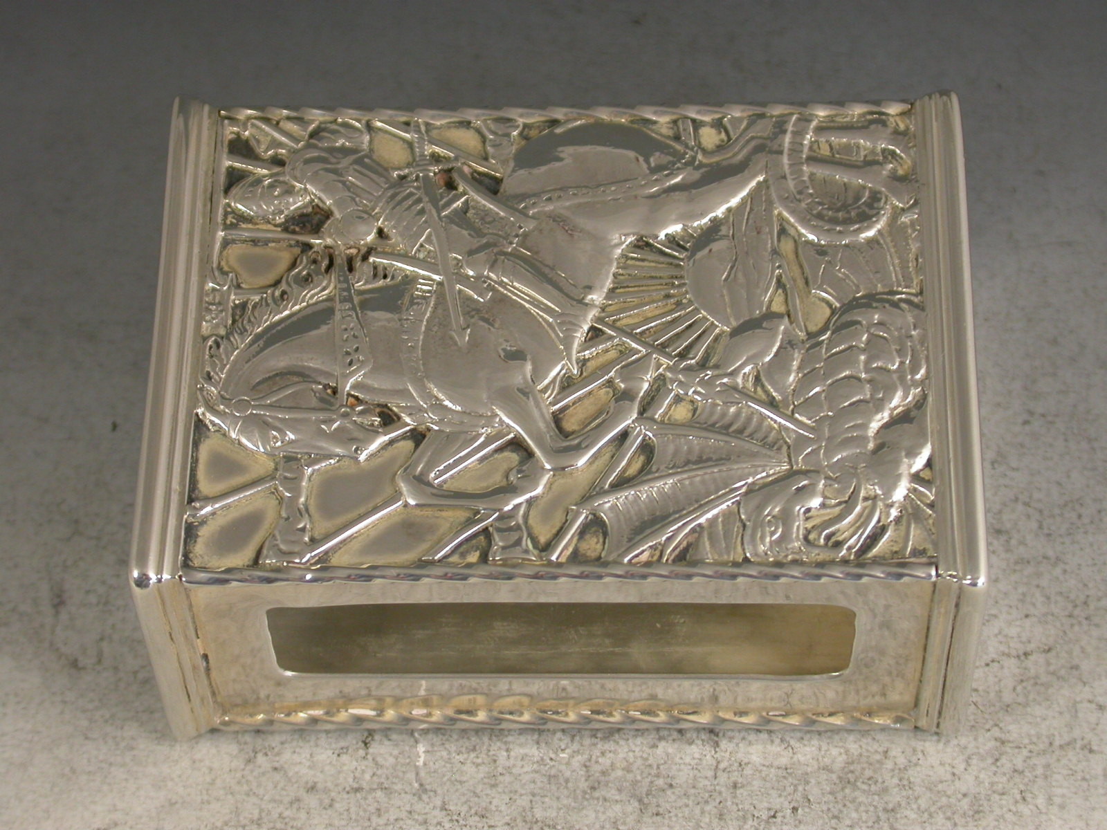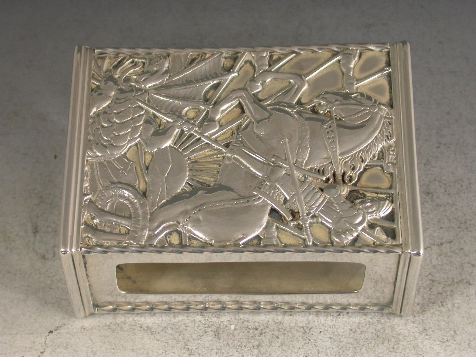 A fine quality and large sized George V silver Match Box Cover in the Arts & Crafts style, of rectangular form with rope work and reeded borders, the face with cut-out and applied scene depicting St George and The Dragon.