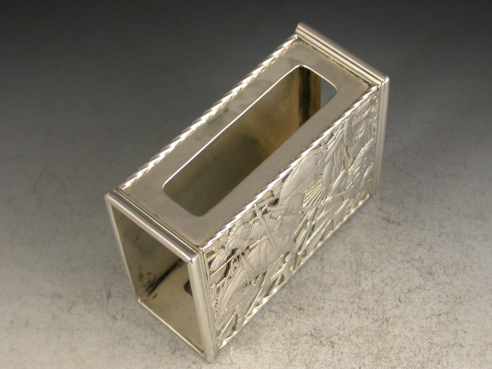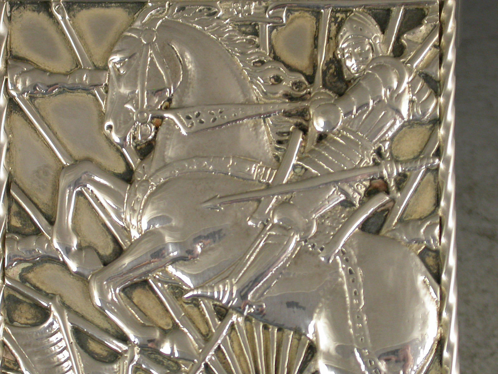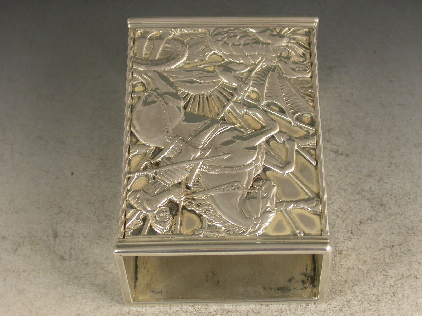 A fine quality and large sized George V silver Match Box Cover in the Arts & Crafts style, of rectangular form with rope work and reeded borders, the face with cut-out and applied scene depicting St George and The Dragon.