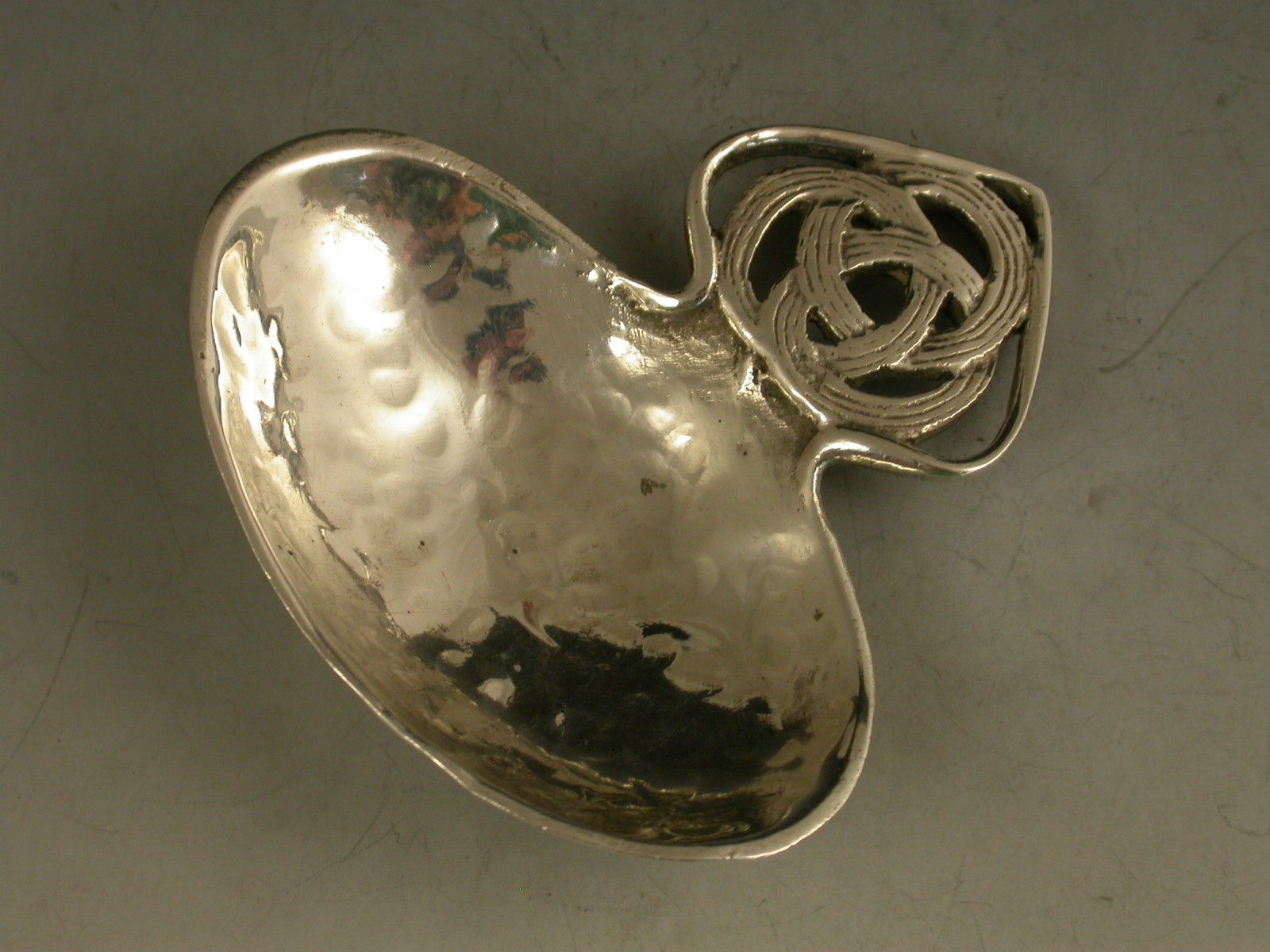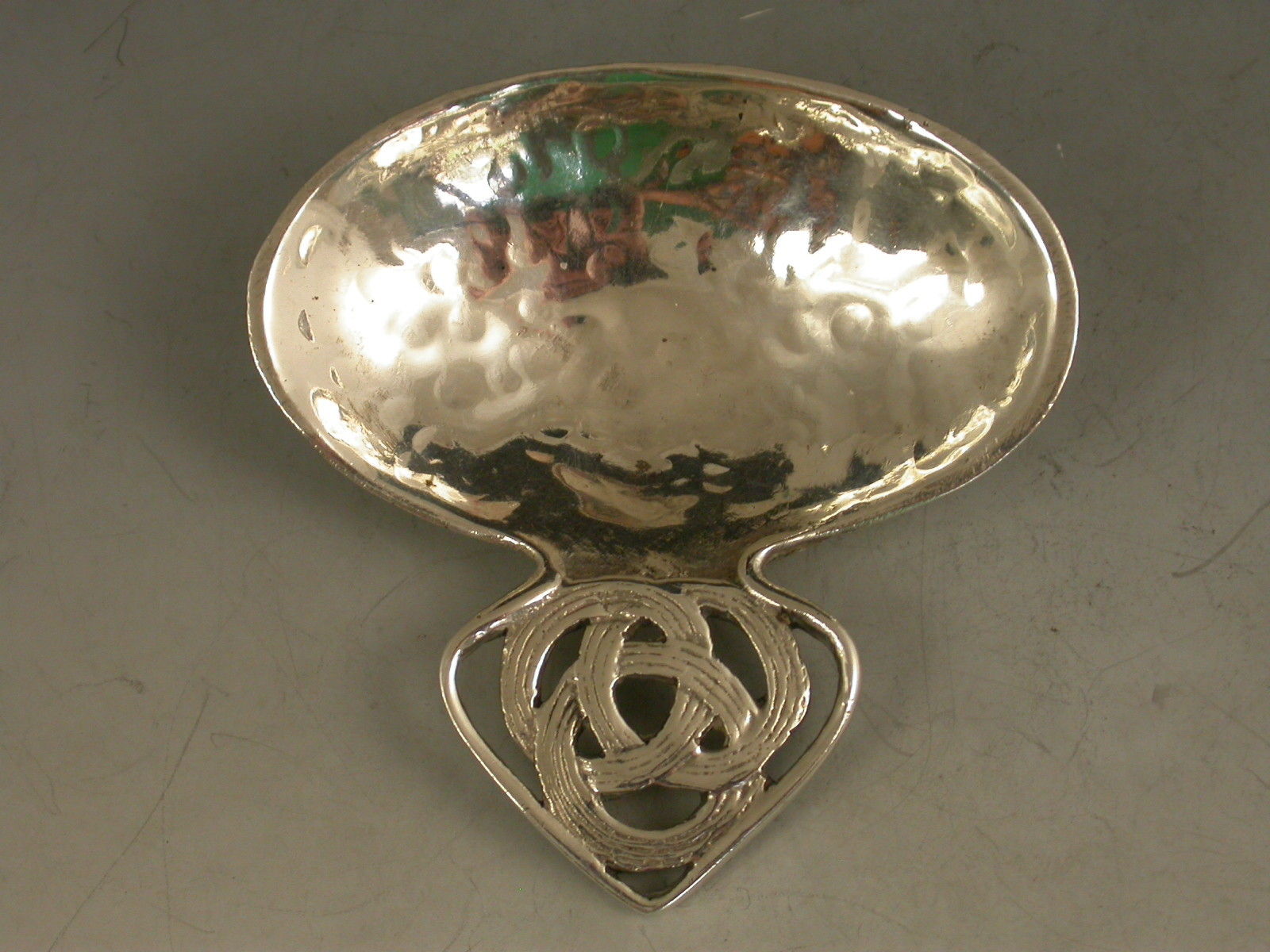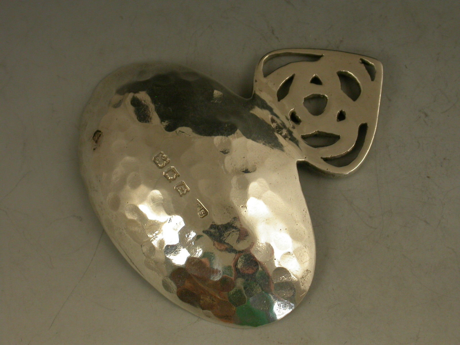 A good quality early 20th century cast silver Caddy Spoon made in the Arts & Crafts style with hammered sideways oval bowl and pierced Celtic knot type handle.