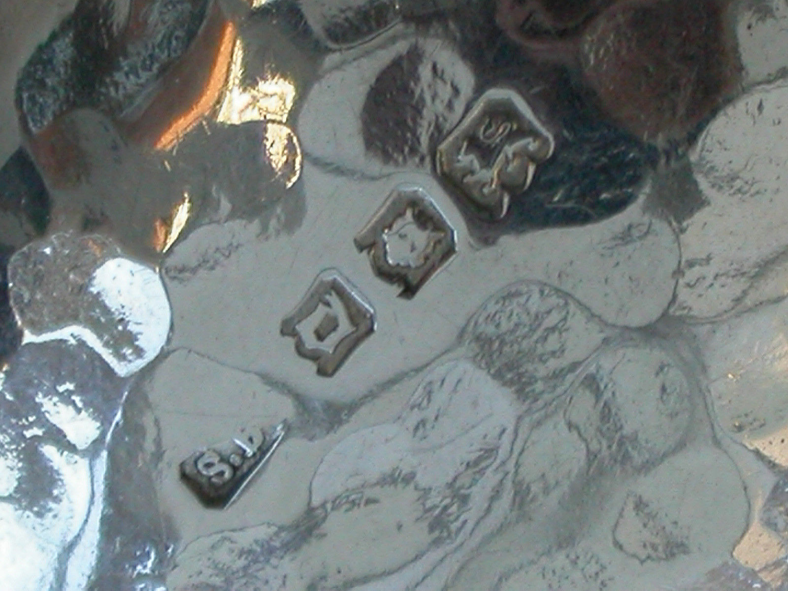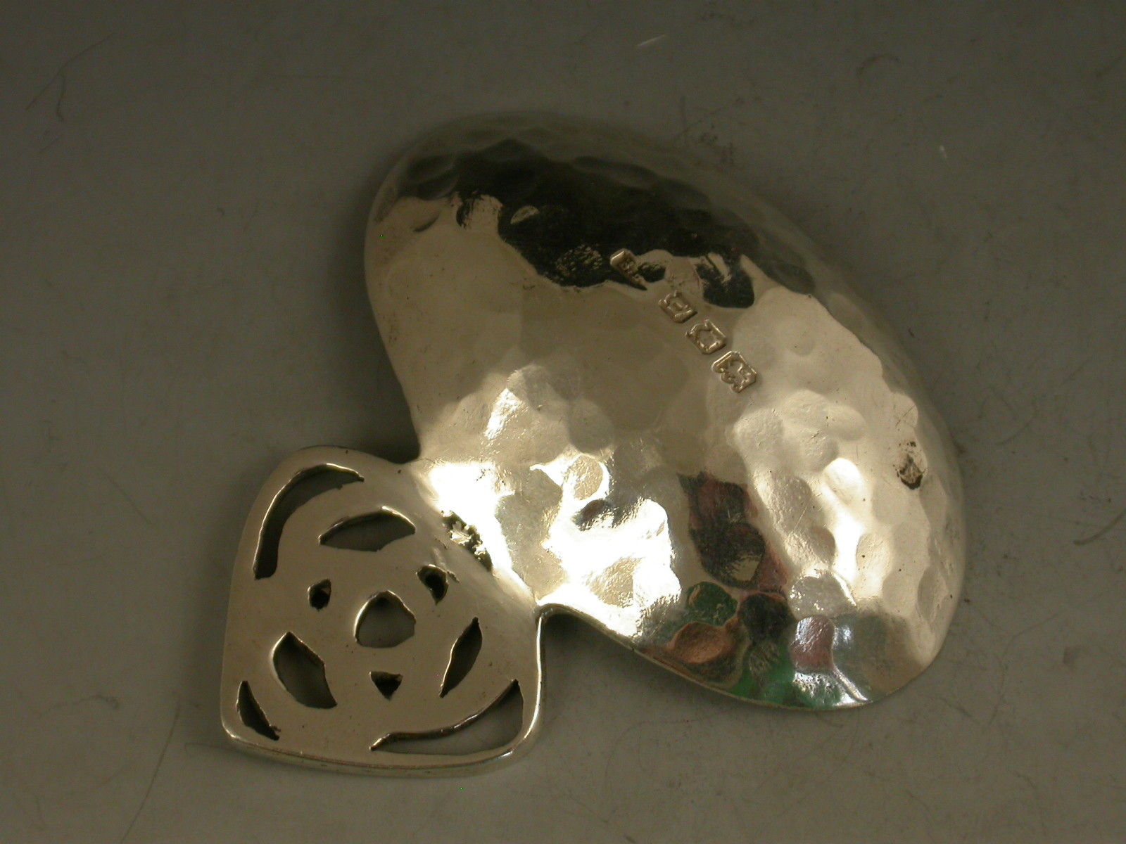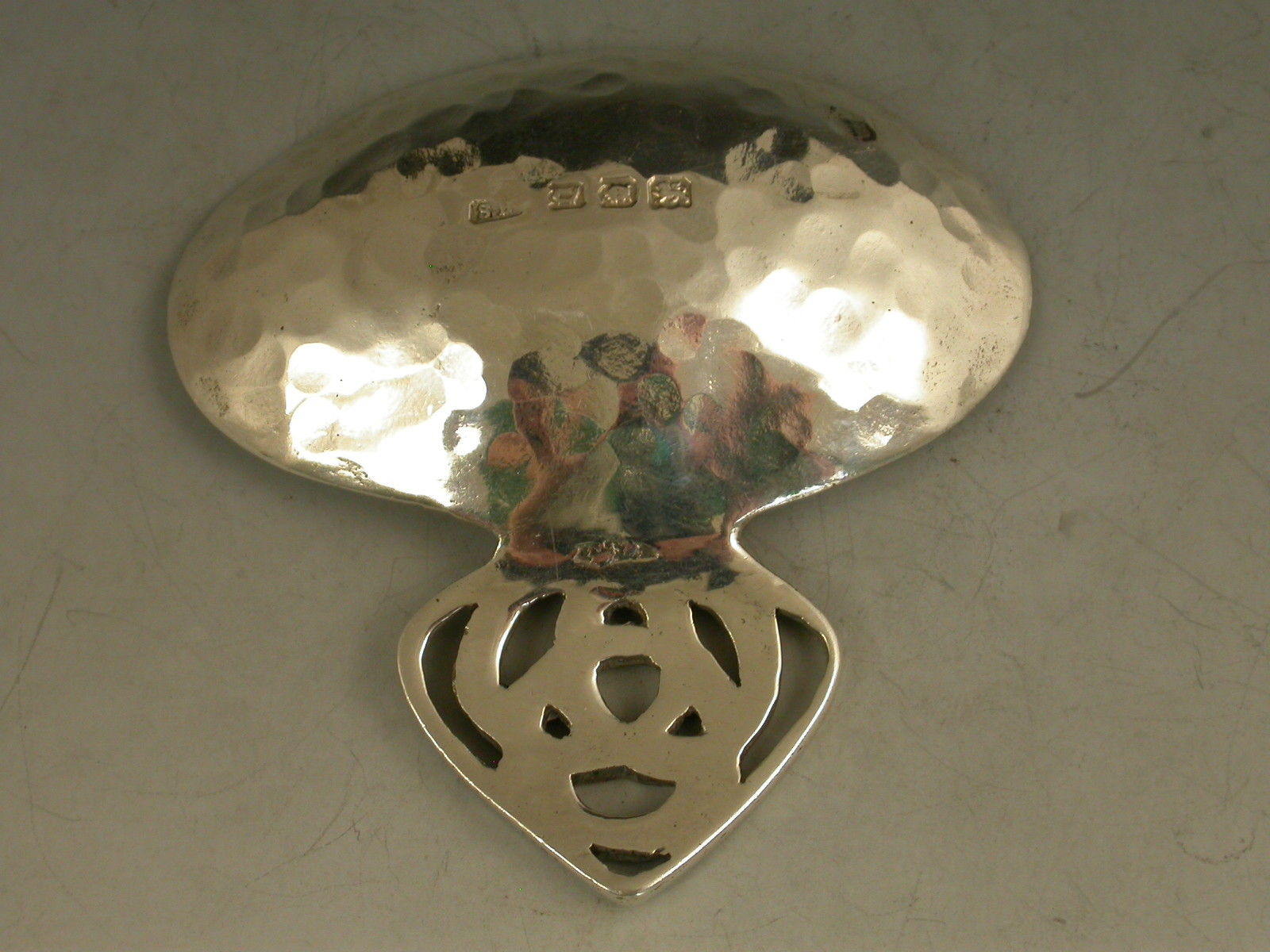 A good quality early 20th century cast silver Caddy Spoon made in the Arts & Crafts style with hammered sideways oval bowl and pierced Celtic knot type handle.
