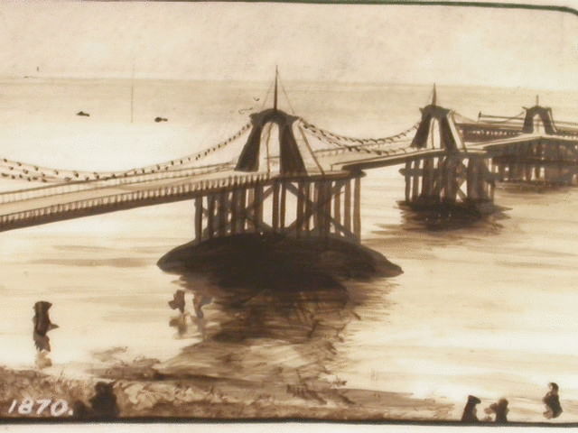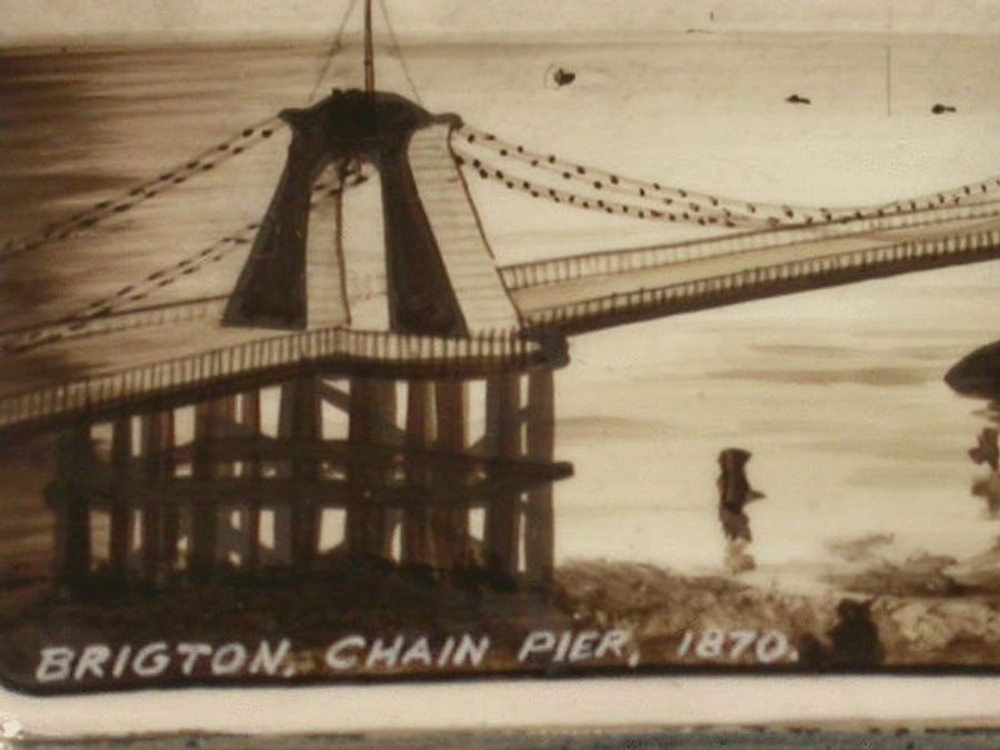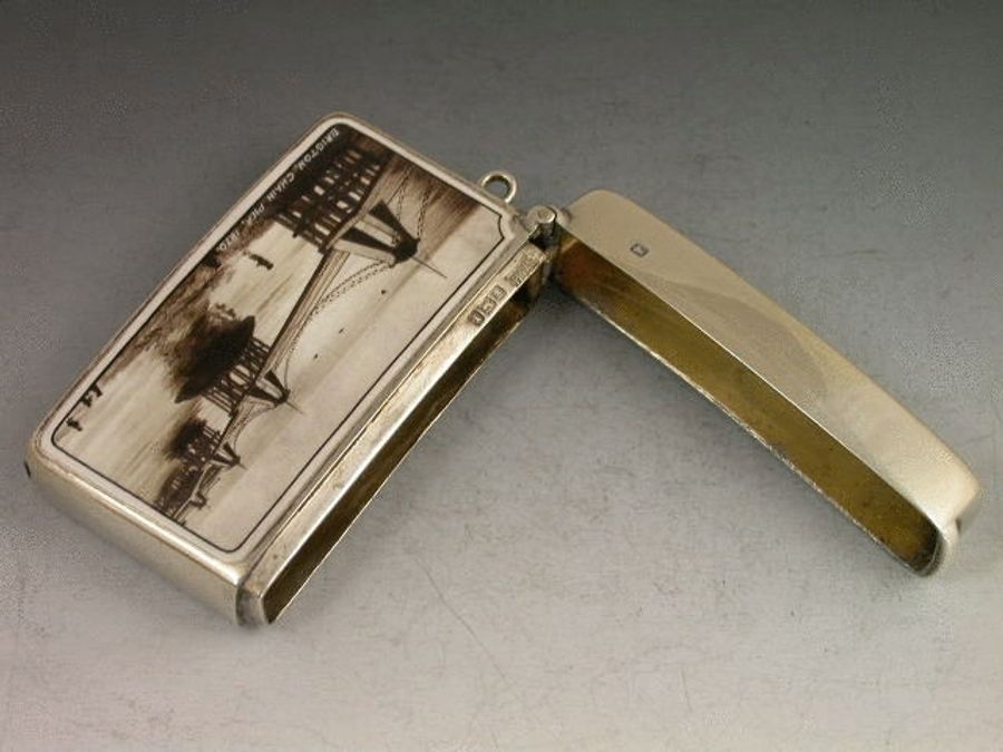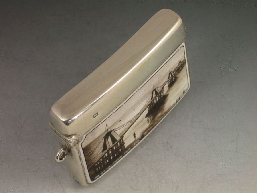 A rare George V silver and enamel Vesta Case of large elongated curved rectangular form with hinged flat flip top lid and attached suspension ring. The fine sepia enamelled panel to the front depicting Brighton Chain Pier and dated 1870.