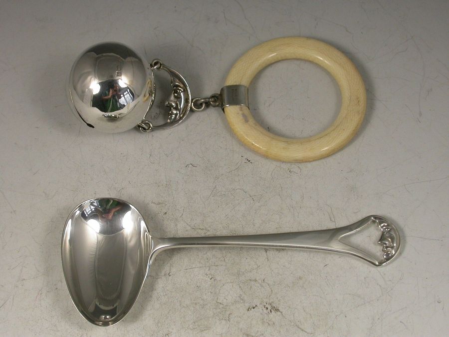 A charming George V cased silver 'Man in the Moon' Christening Set comprising, a child's feeding spoon with sideways oval bowl with man in the moon terminal, a bone teething ring attached to a ball shaped rattle, with a man in the moon link.