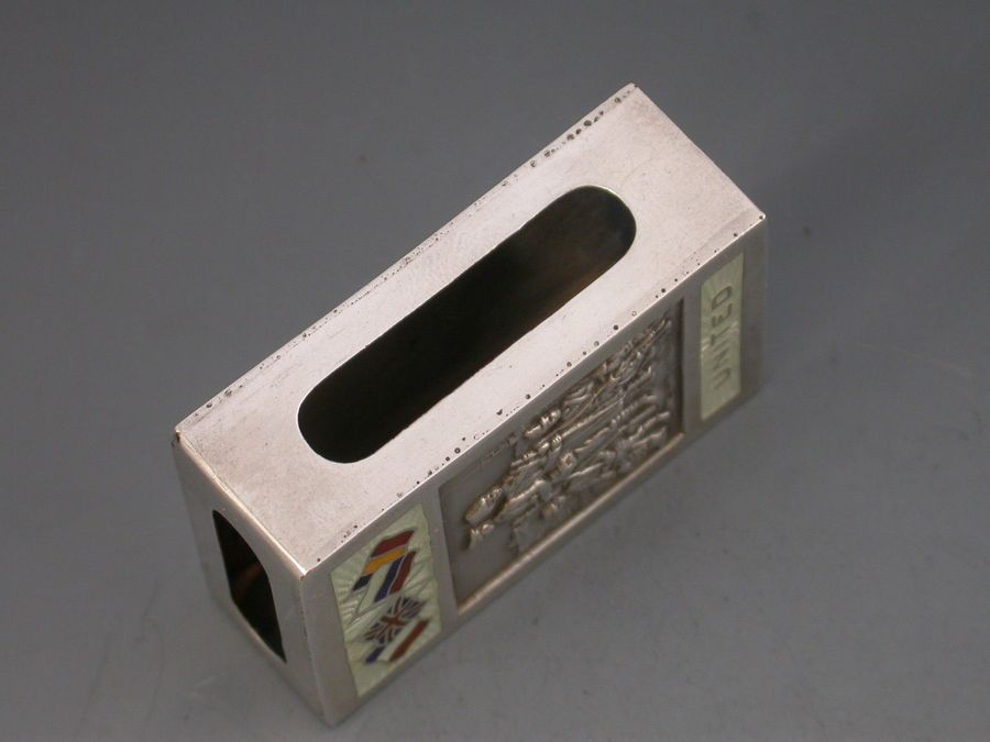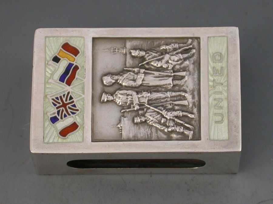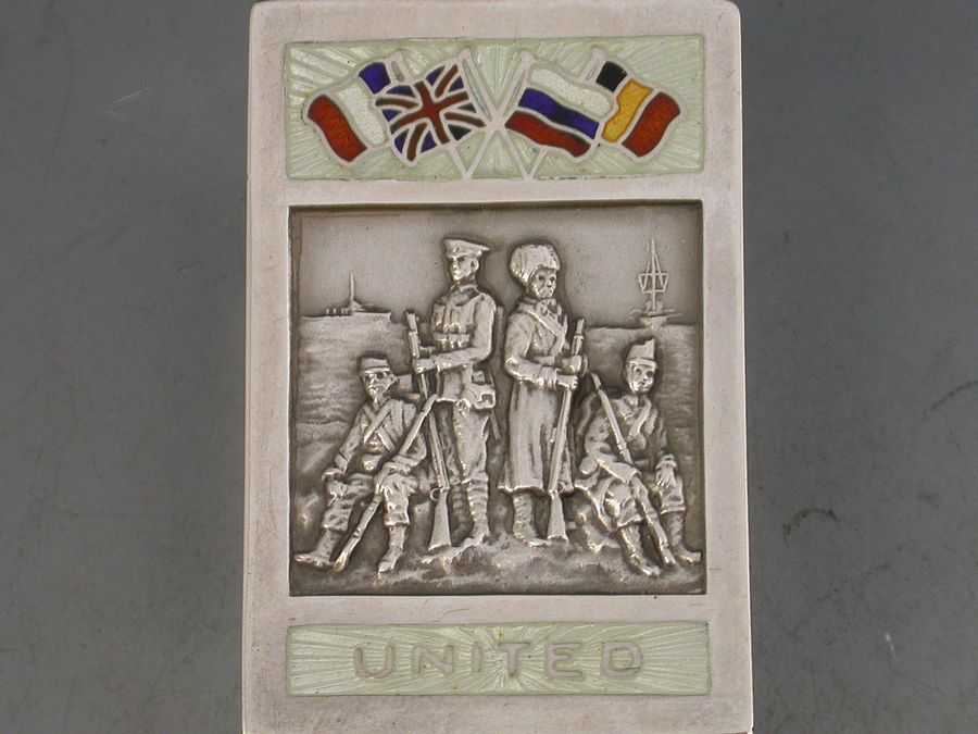 A nice quality early 20th century silver and enamel Match Box Cover depicting the flags and the soldiers of the Allies - France, England, Russia & Belgium. The word 'United' at the base.