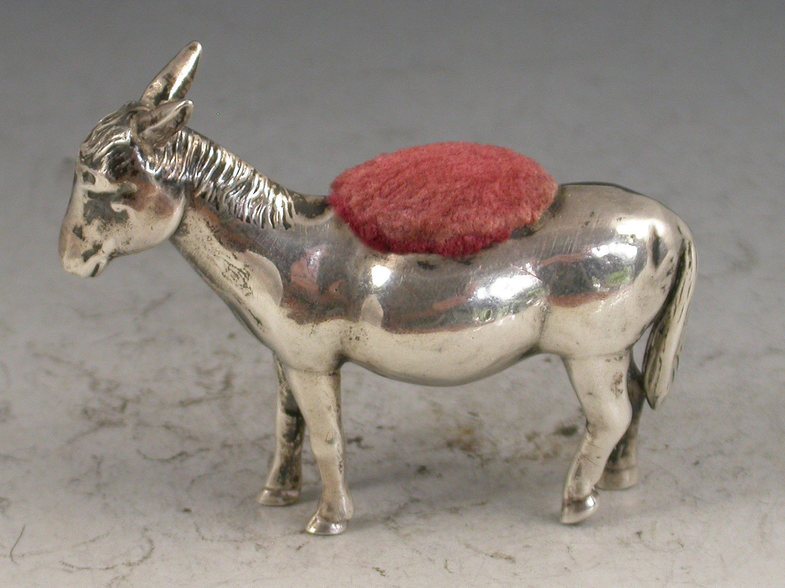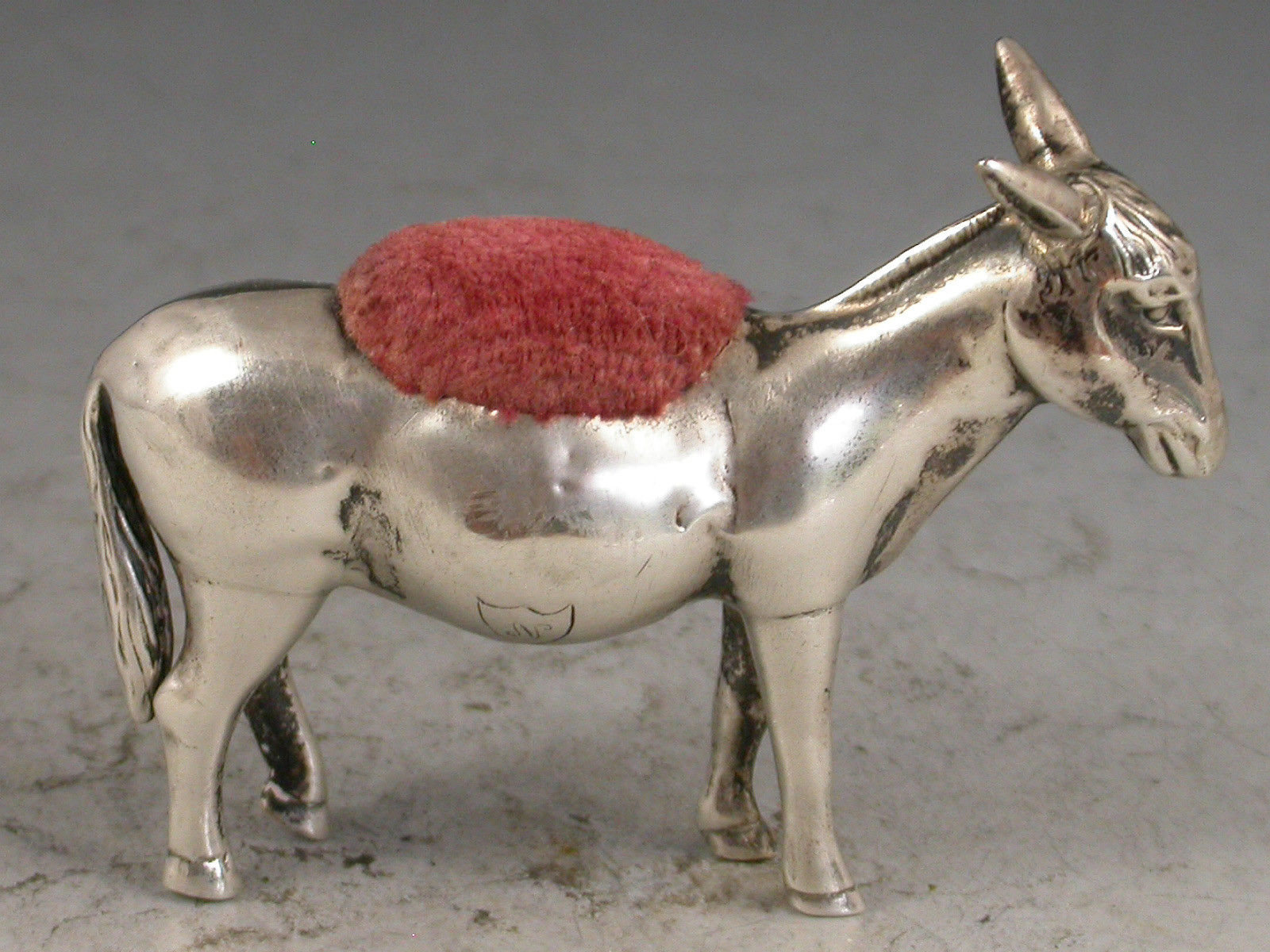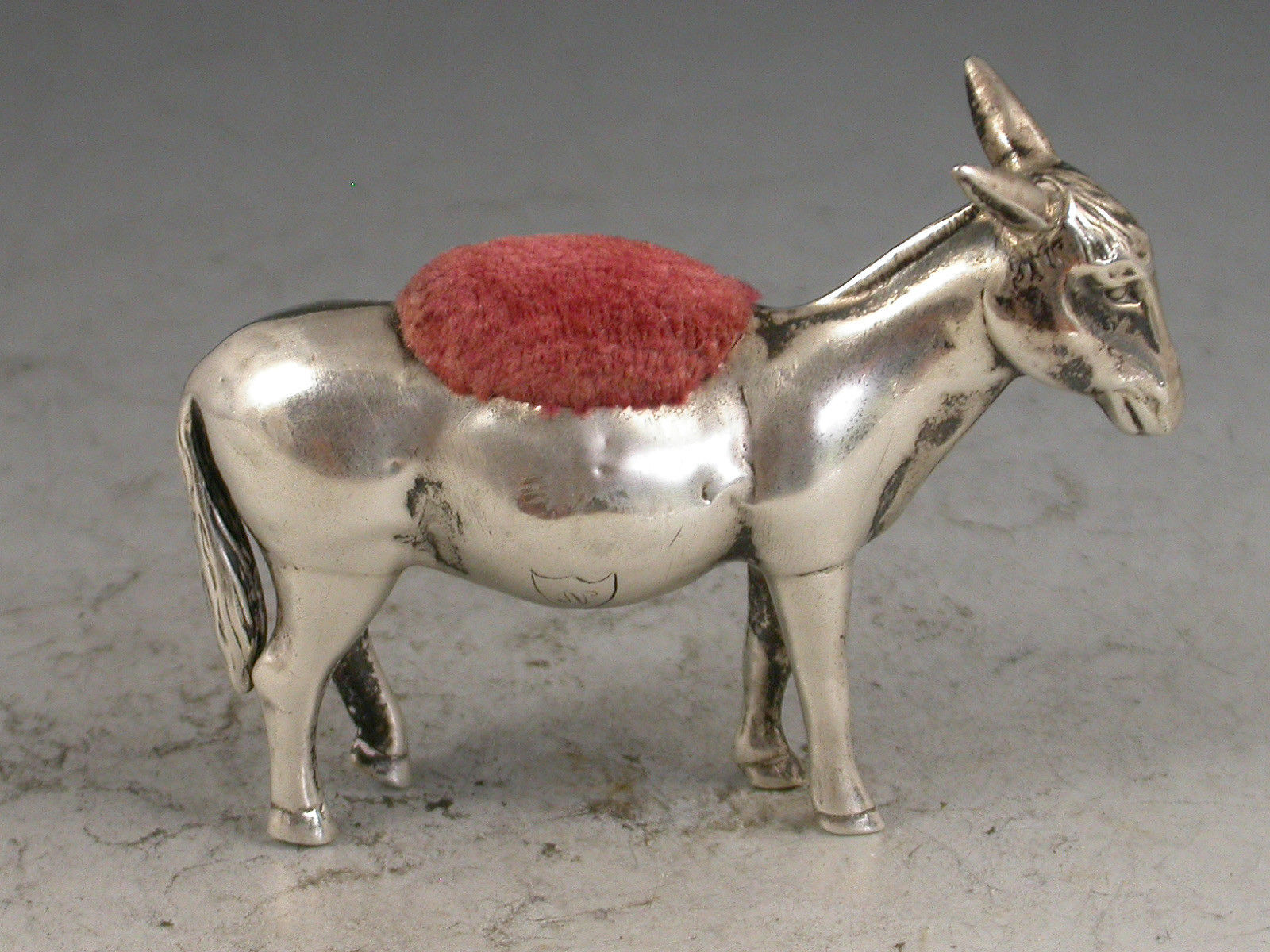 A rare early 20th century novelty silver Pin Cushion made in the form of a Donkey, with pink velvet cushion. The body engraved with an initial 'N' in a shield.