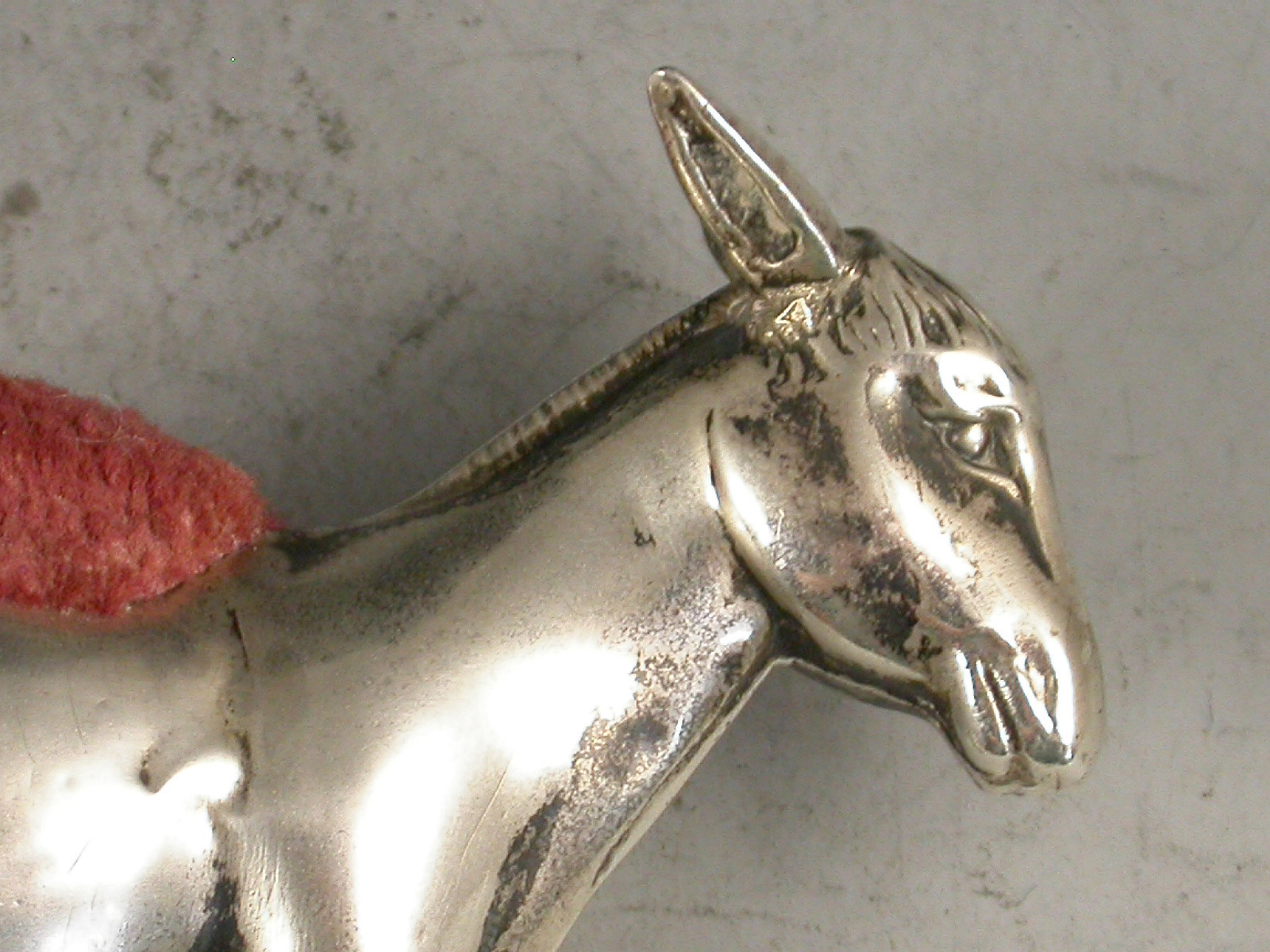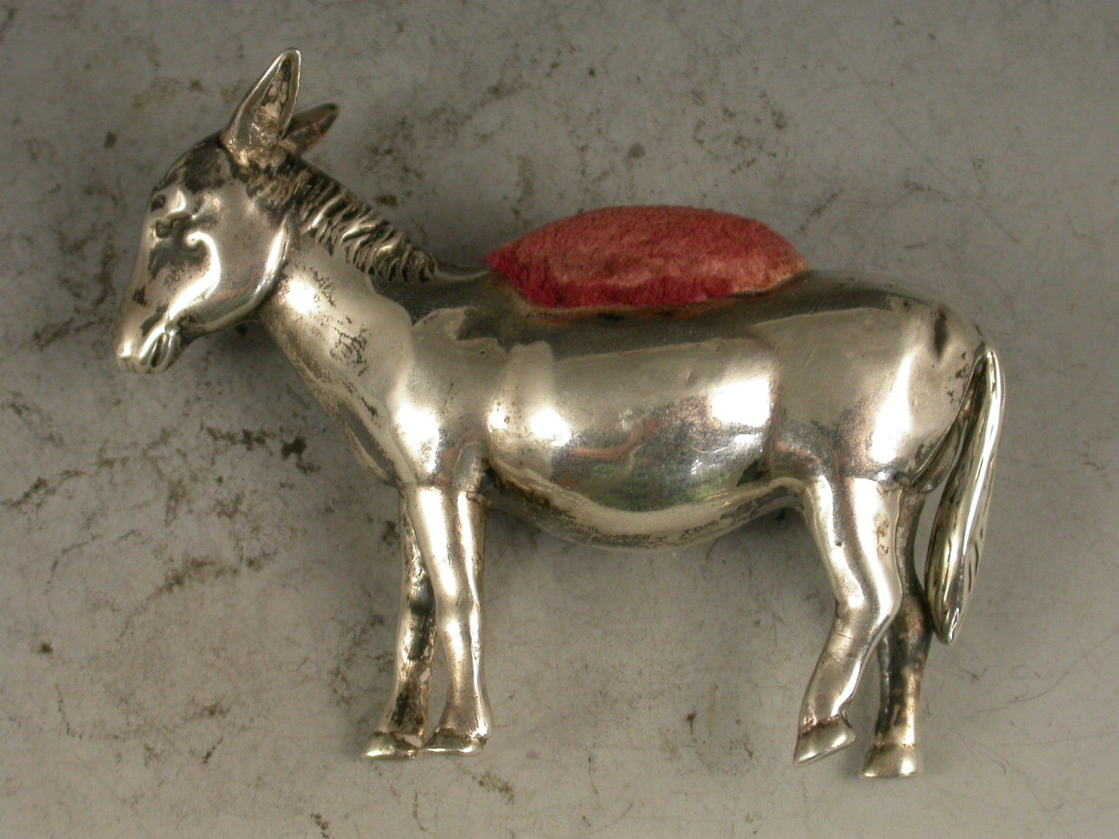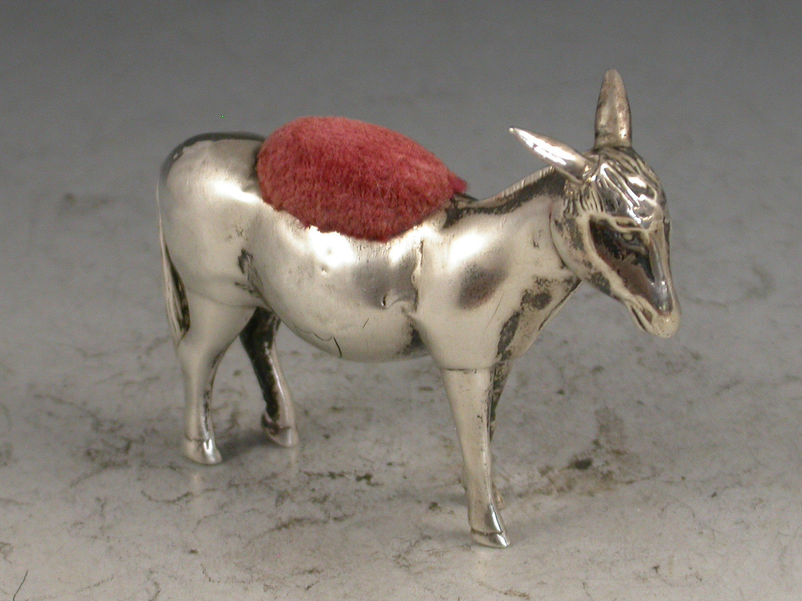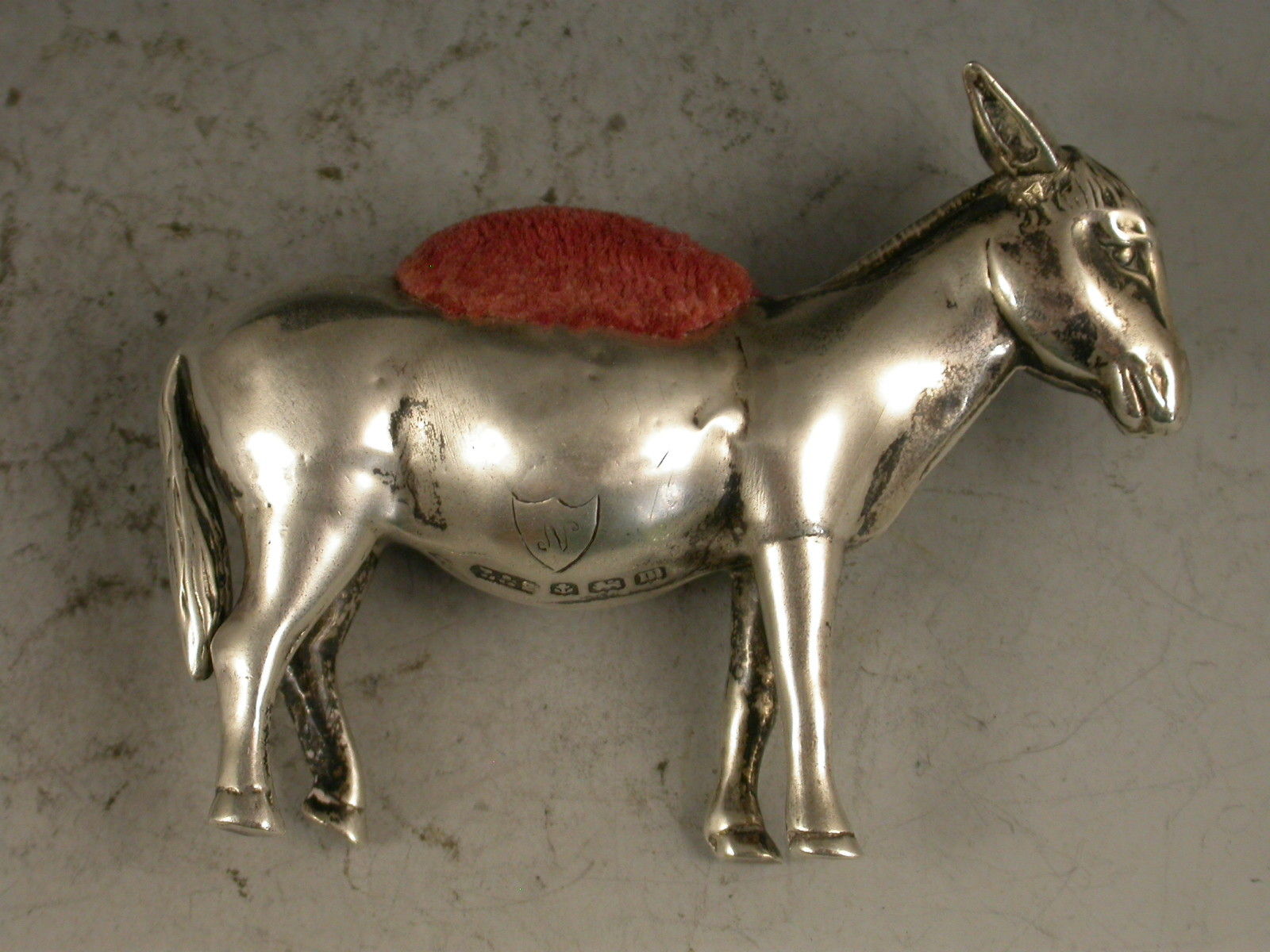 A rare early 20th century novelty silver Pin Cushion made in the form of a Donkey, with pink velvet cushion. The body engraved with an initial 'N' in a shield.