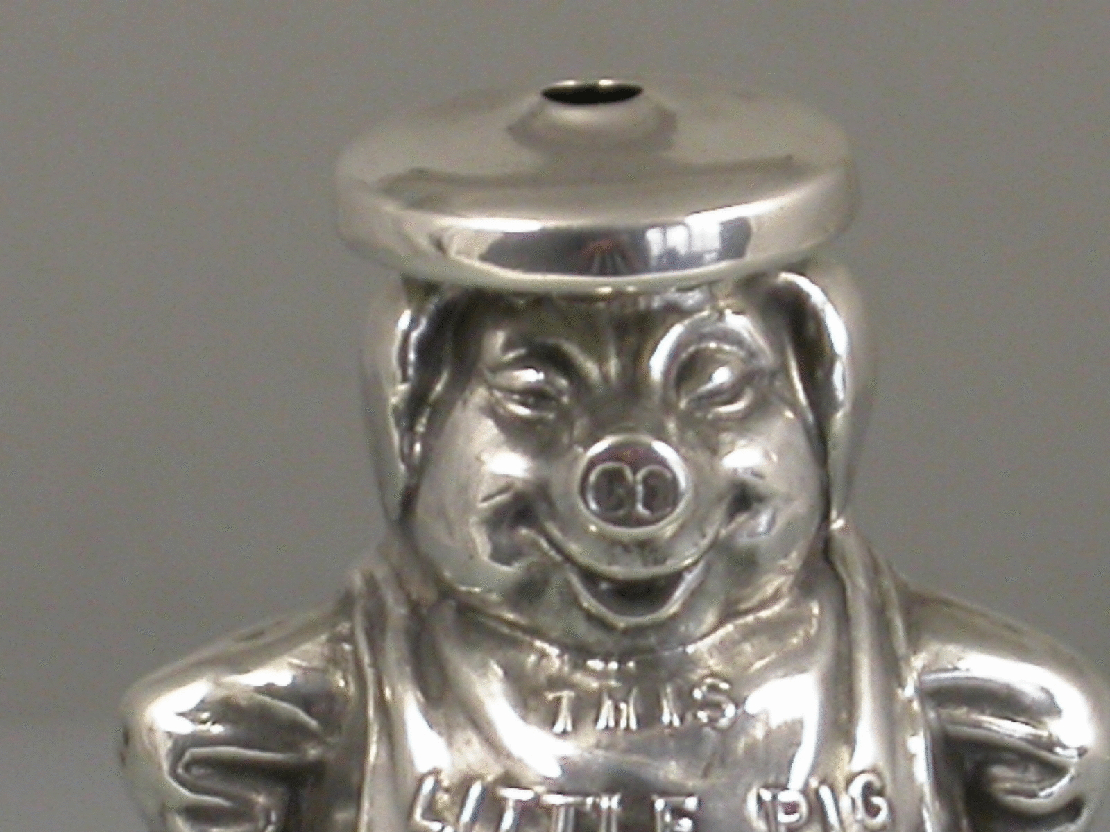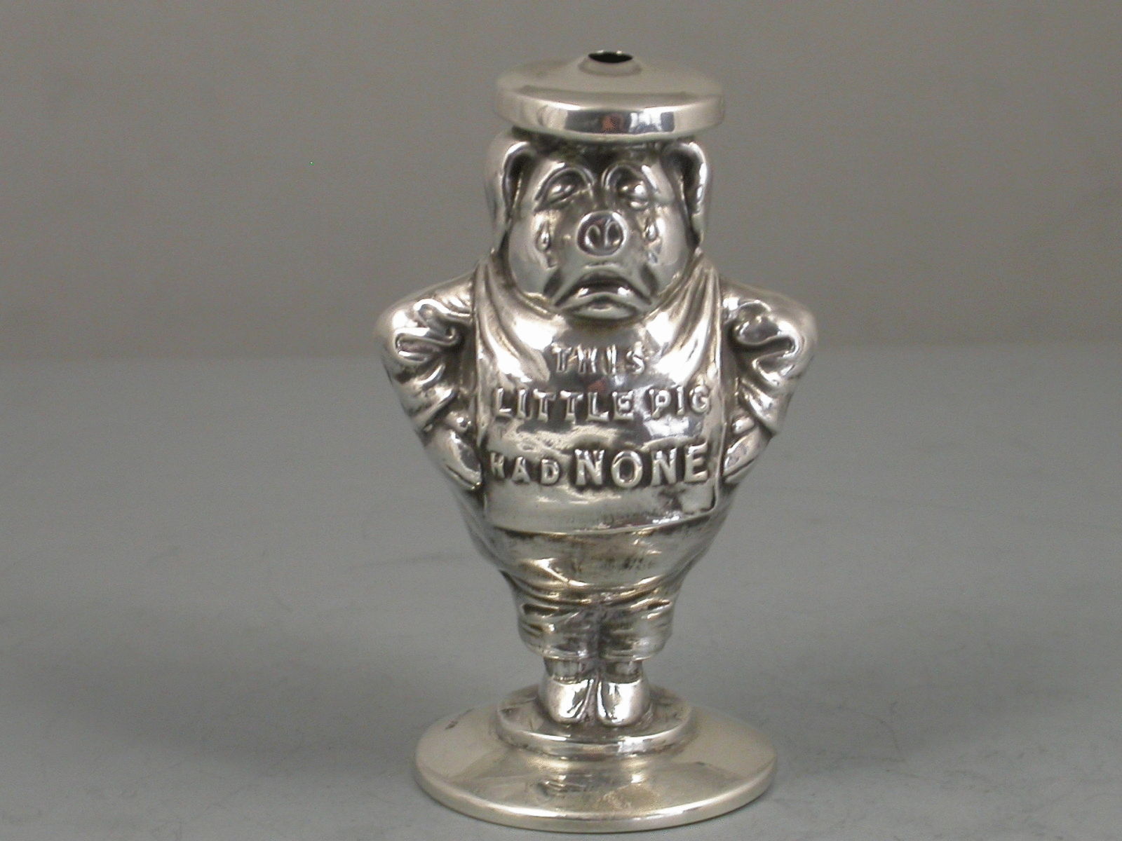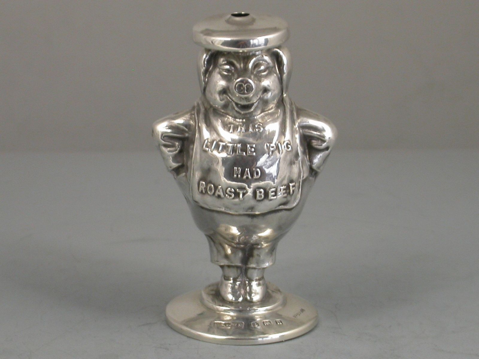 A rare George V novelty silver nursery rhyme Salt Pot in the form of a double side figure of a pig standing with his trotters on his hips, ""THIS LITTLE PIG HAD ROAST BEEF"" stamped on one side and ""THIS LITTLE PIG HAD NONE"", on the other.