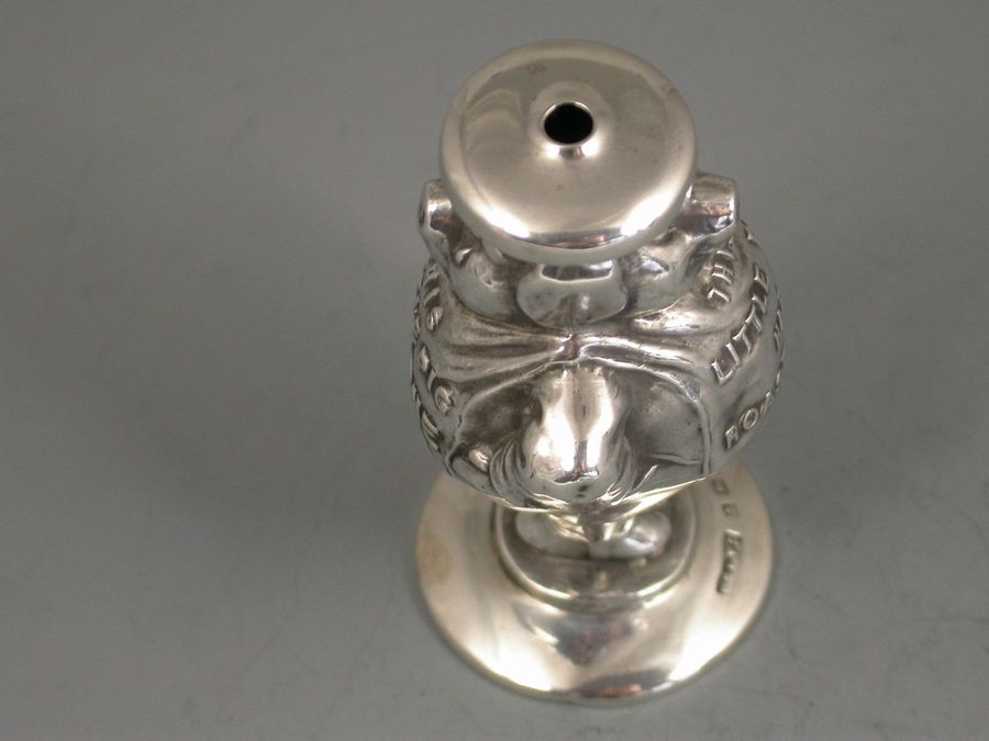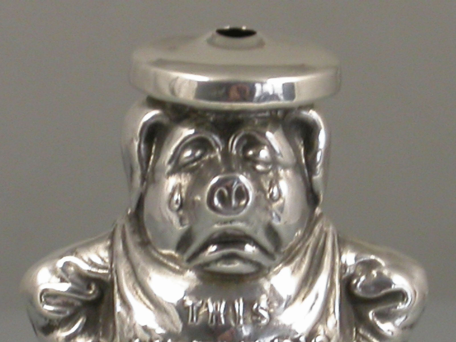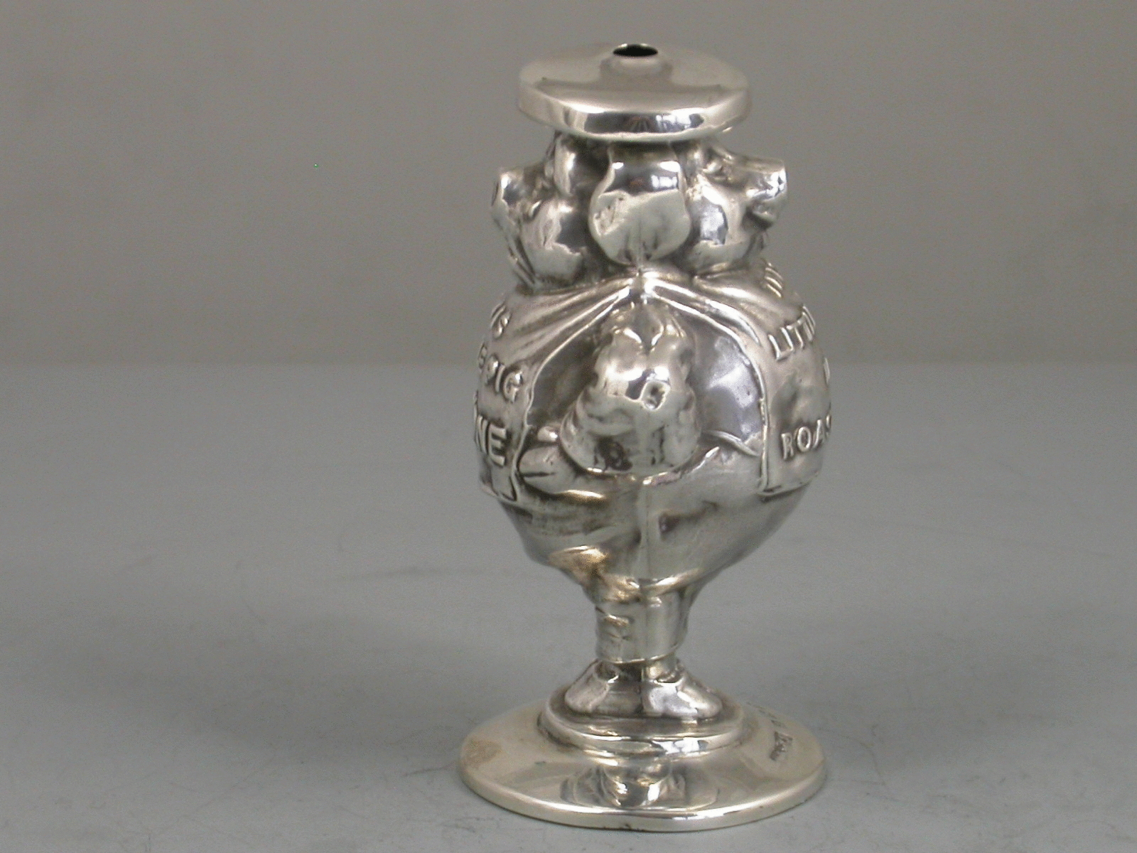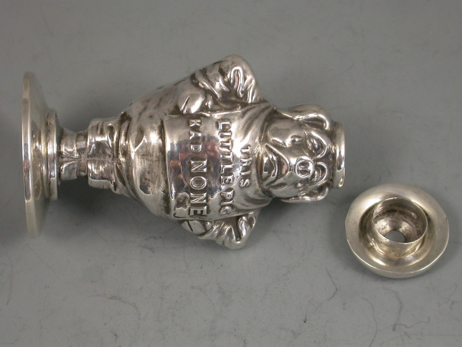 A rare George V novelty silver nursery rhyme Salt Pot in the form of a double side figure of a pig standing with his trotters on his hips, ""THIS LITTLE PIG HAD ROAST BEEF"" stamped on one side and ""THIS LITTLE PIG HAD NONE"", on the other.