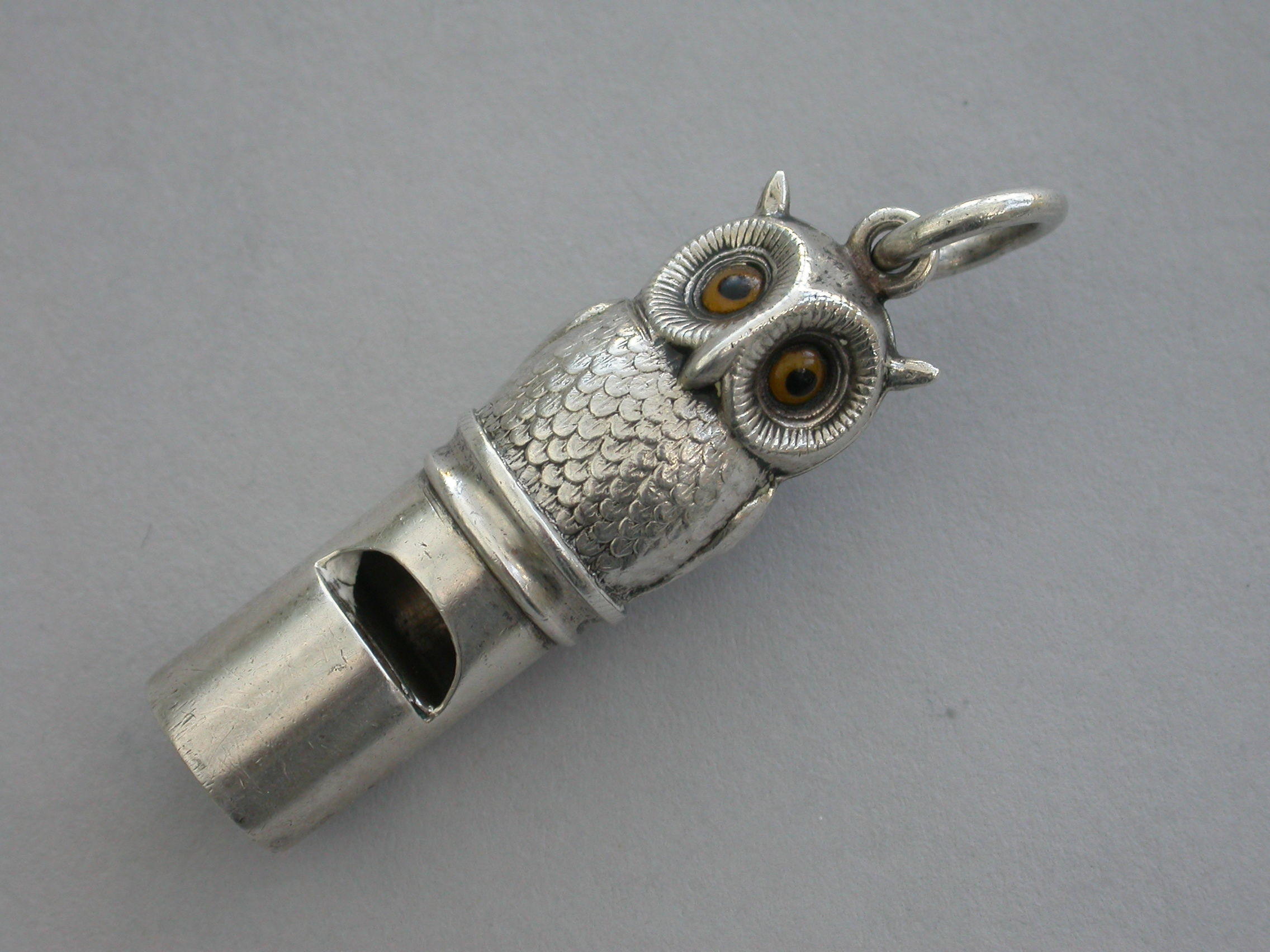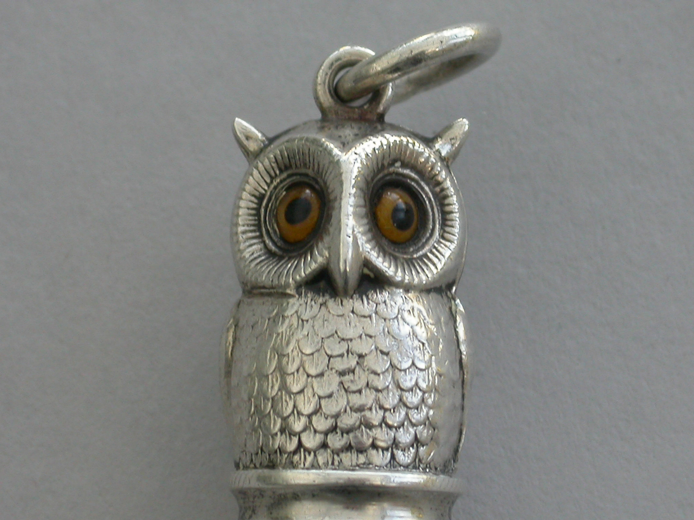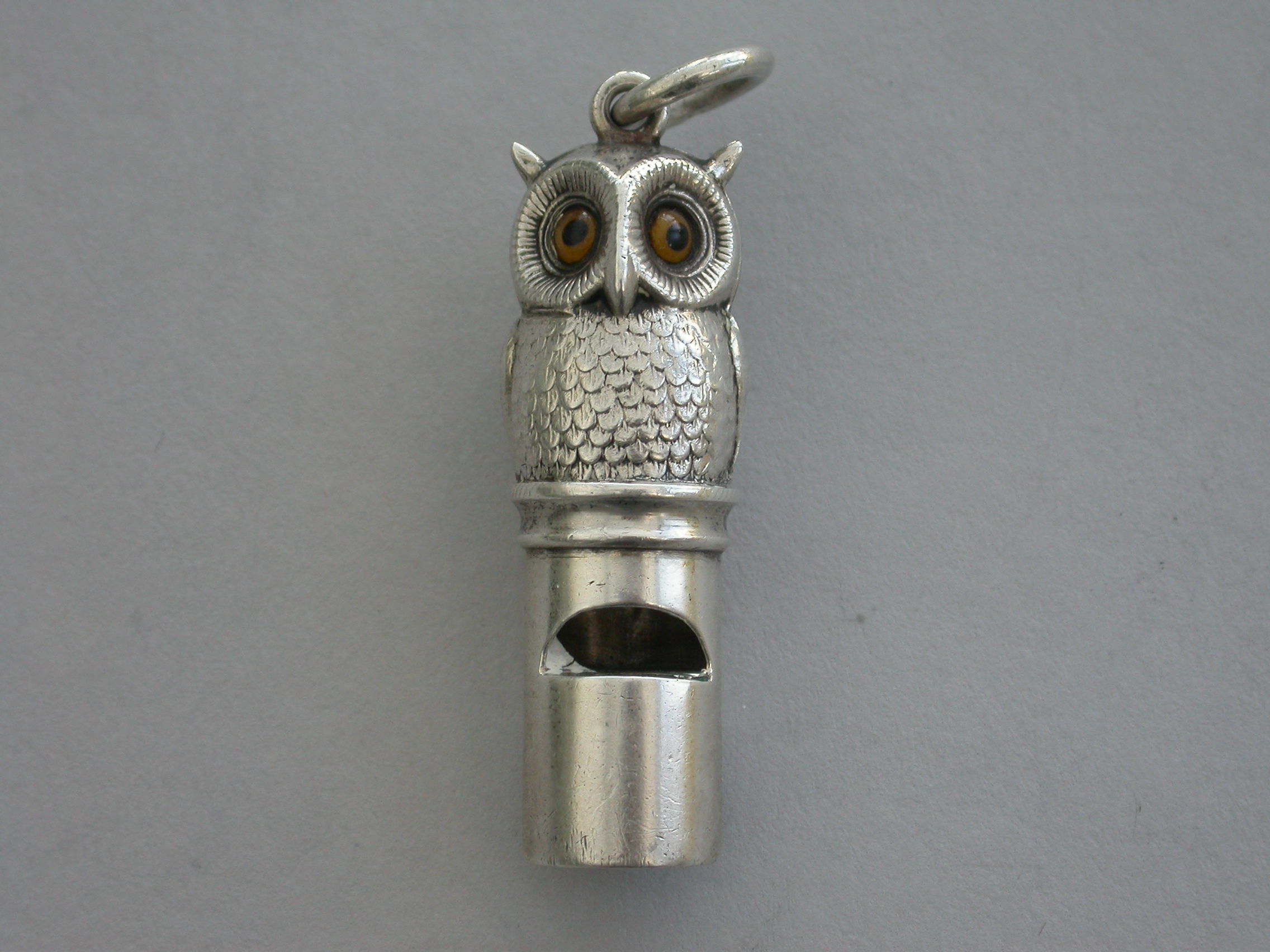 An early 20th century novelty silver Whistle made in the form of an Owl, with yellow glass eyes and attached suspension ring.