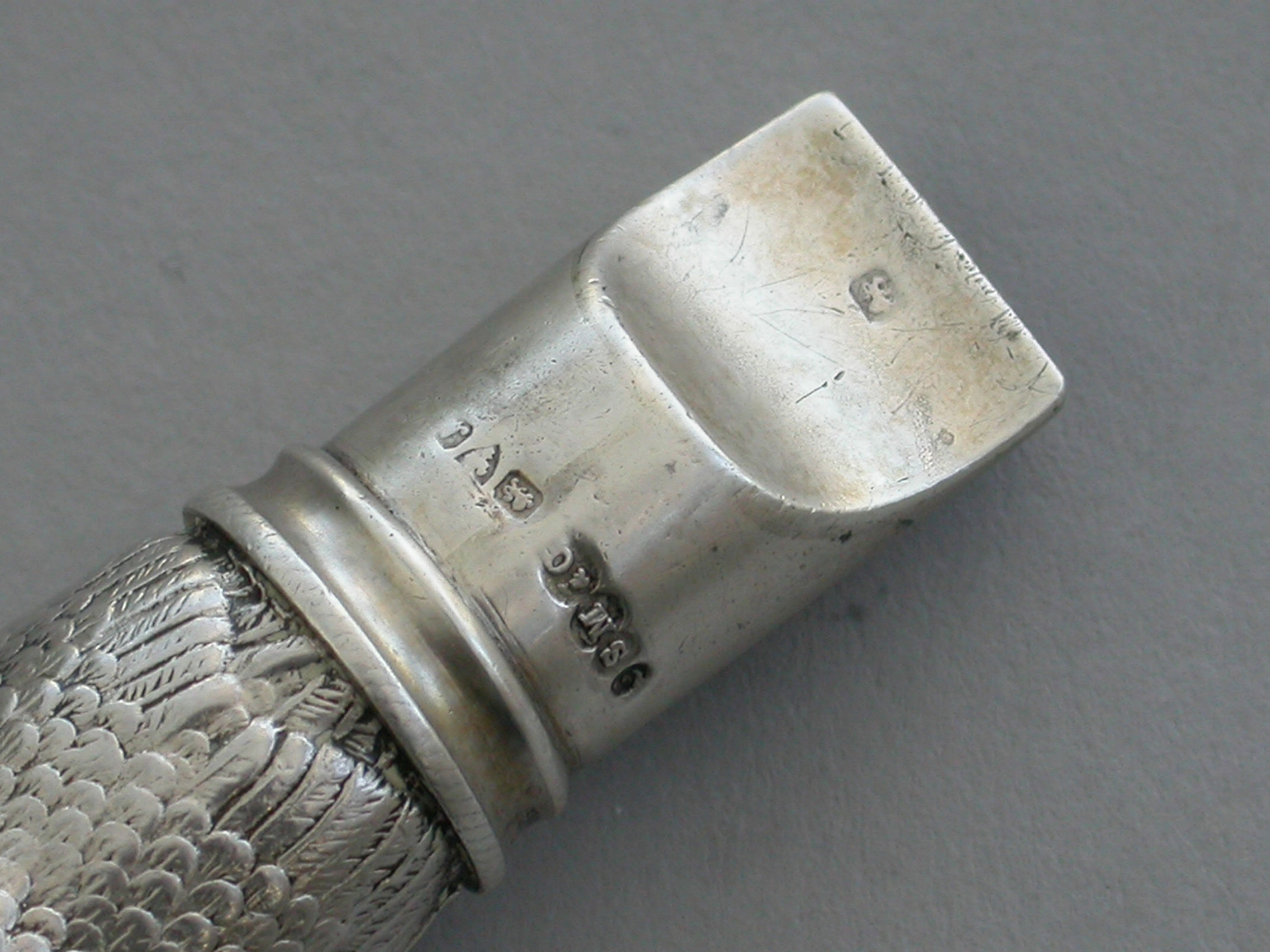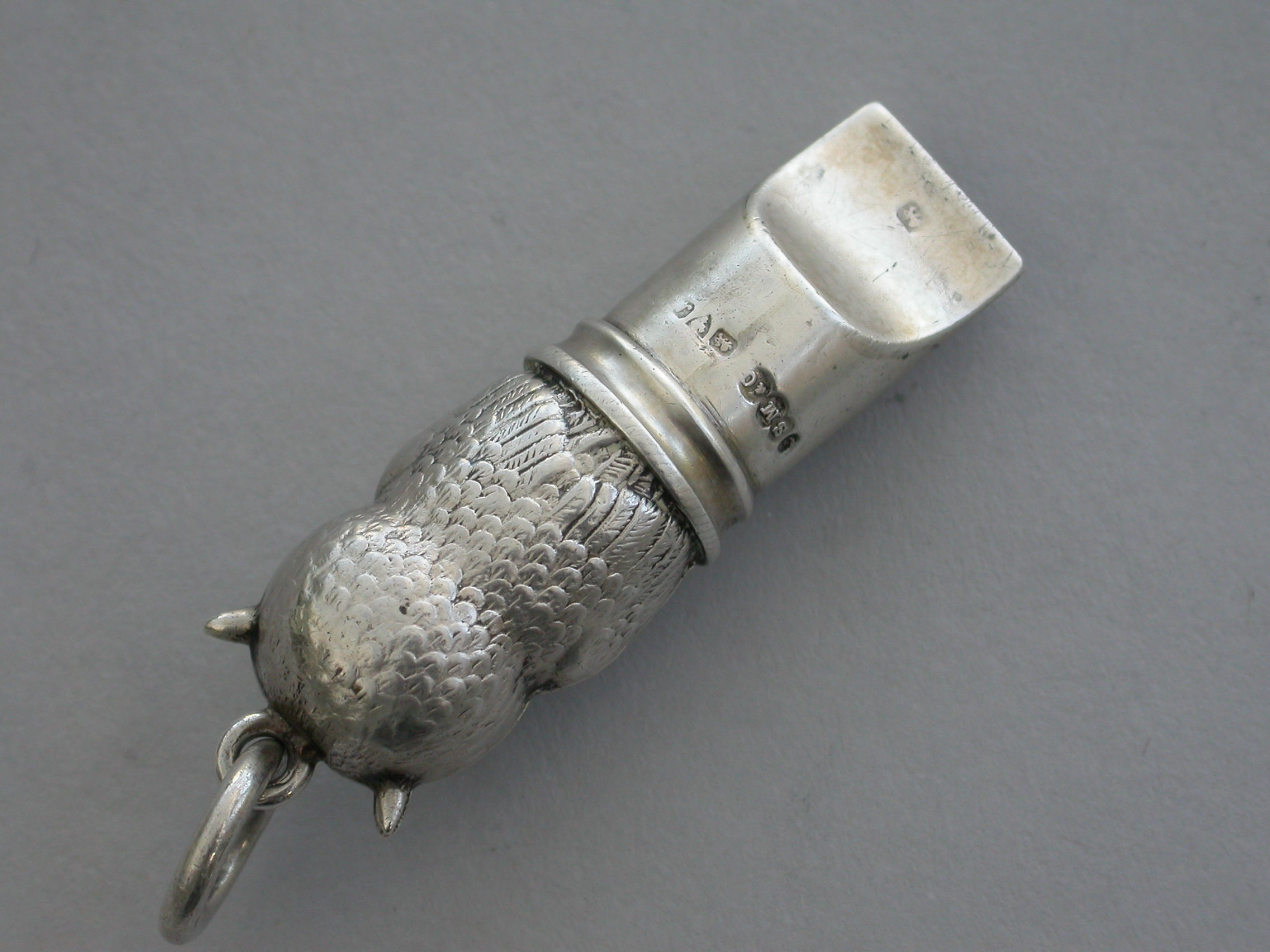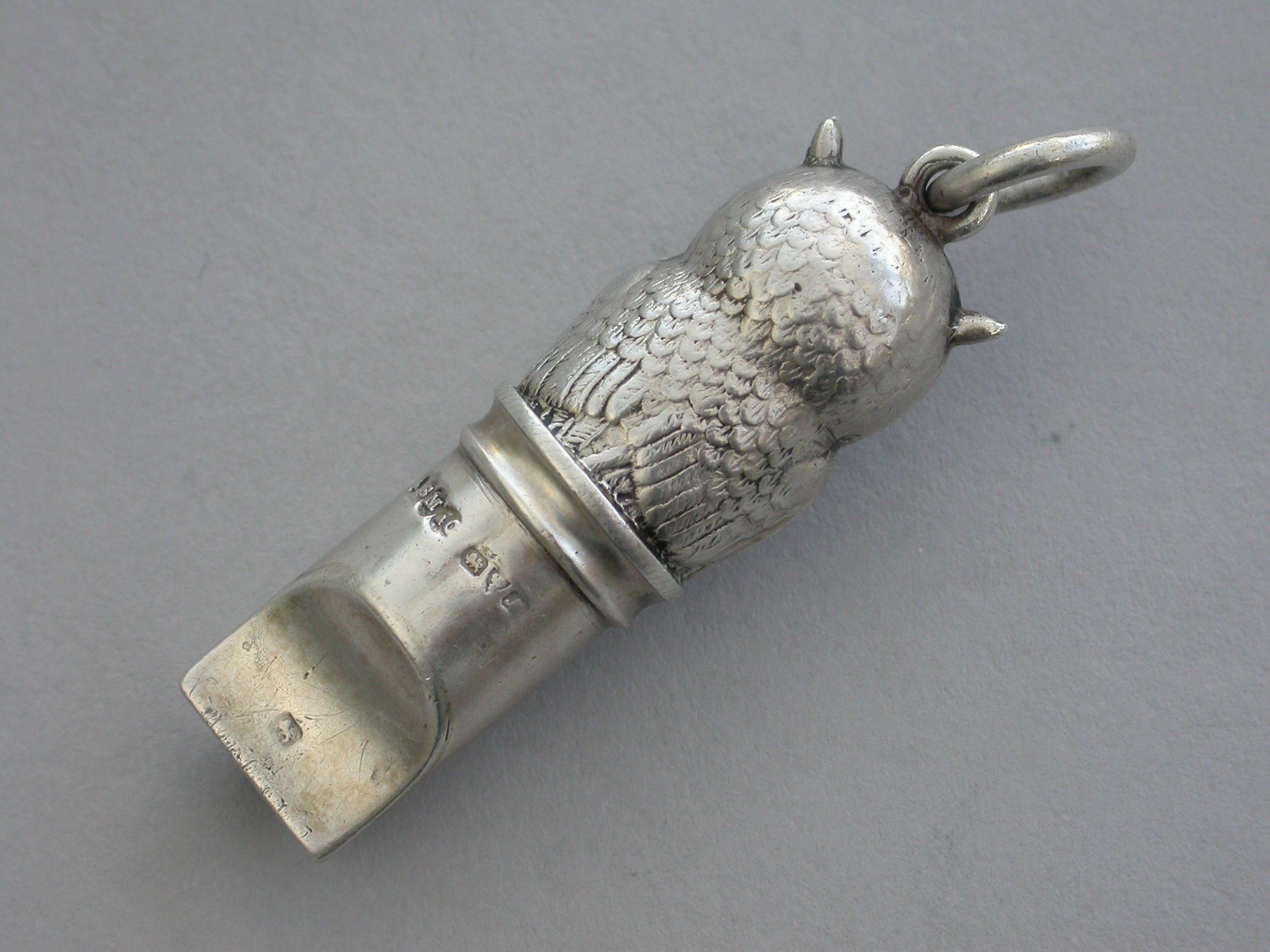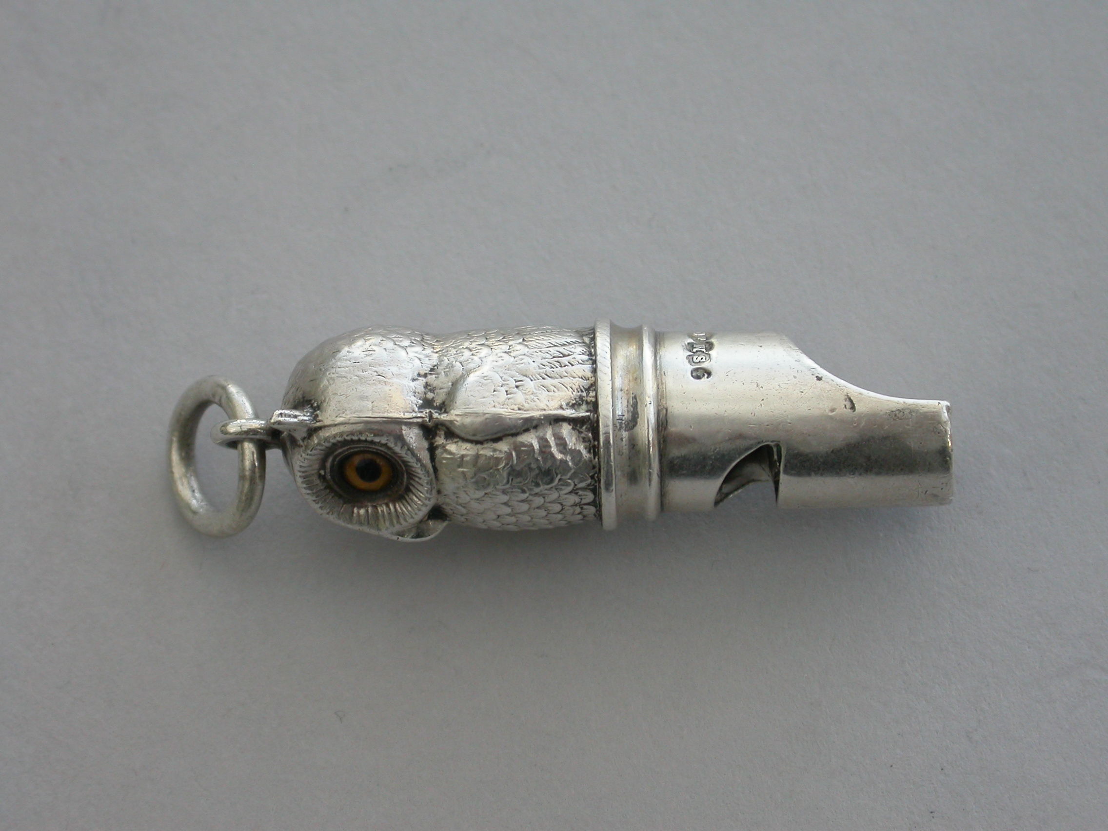 An early 20th century novelty silver Whistle made in the form of an Owl, with yellow glass eyes and attached suspension ring.