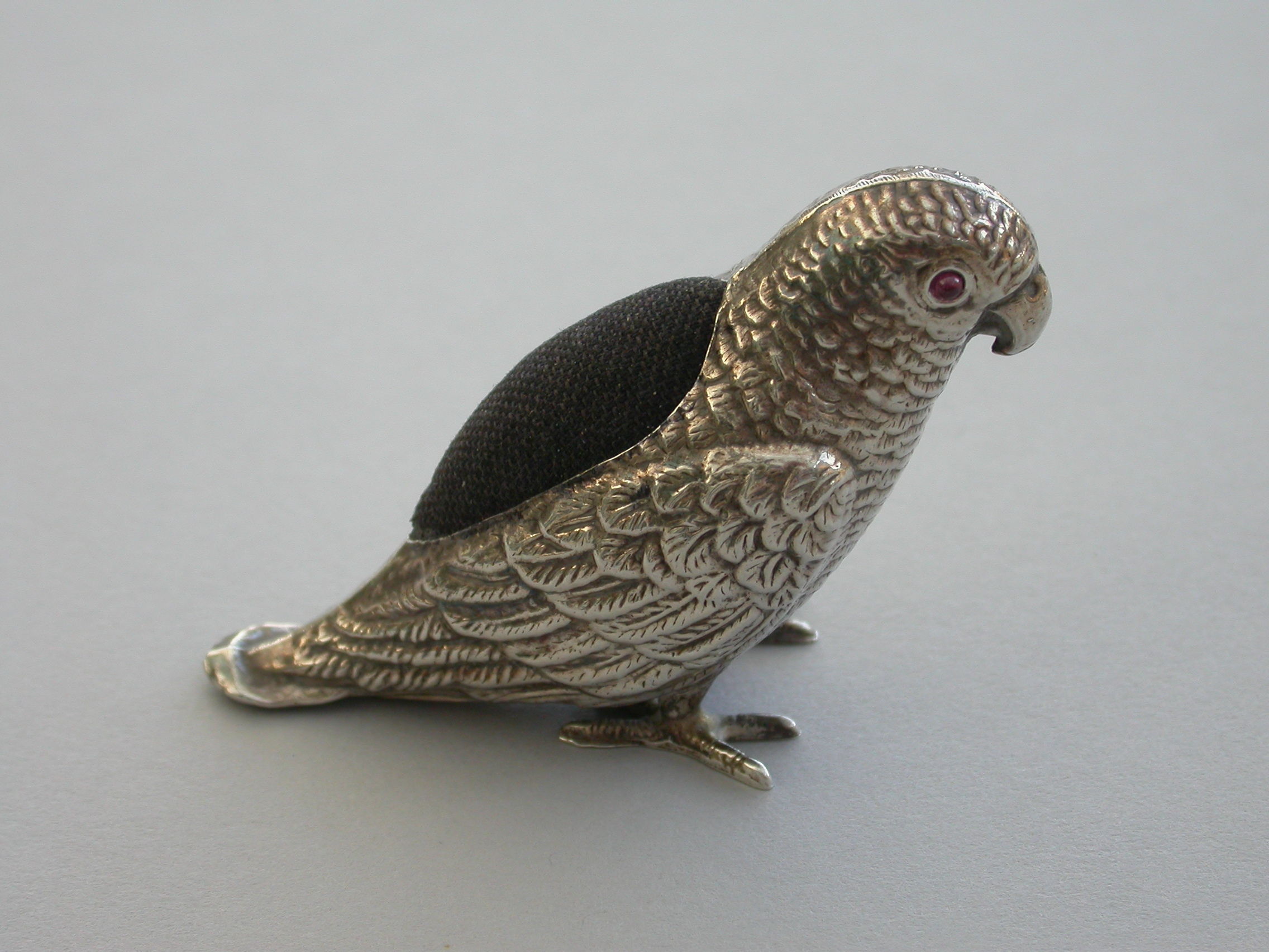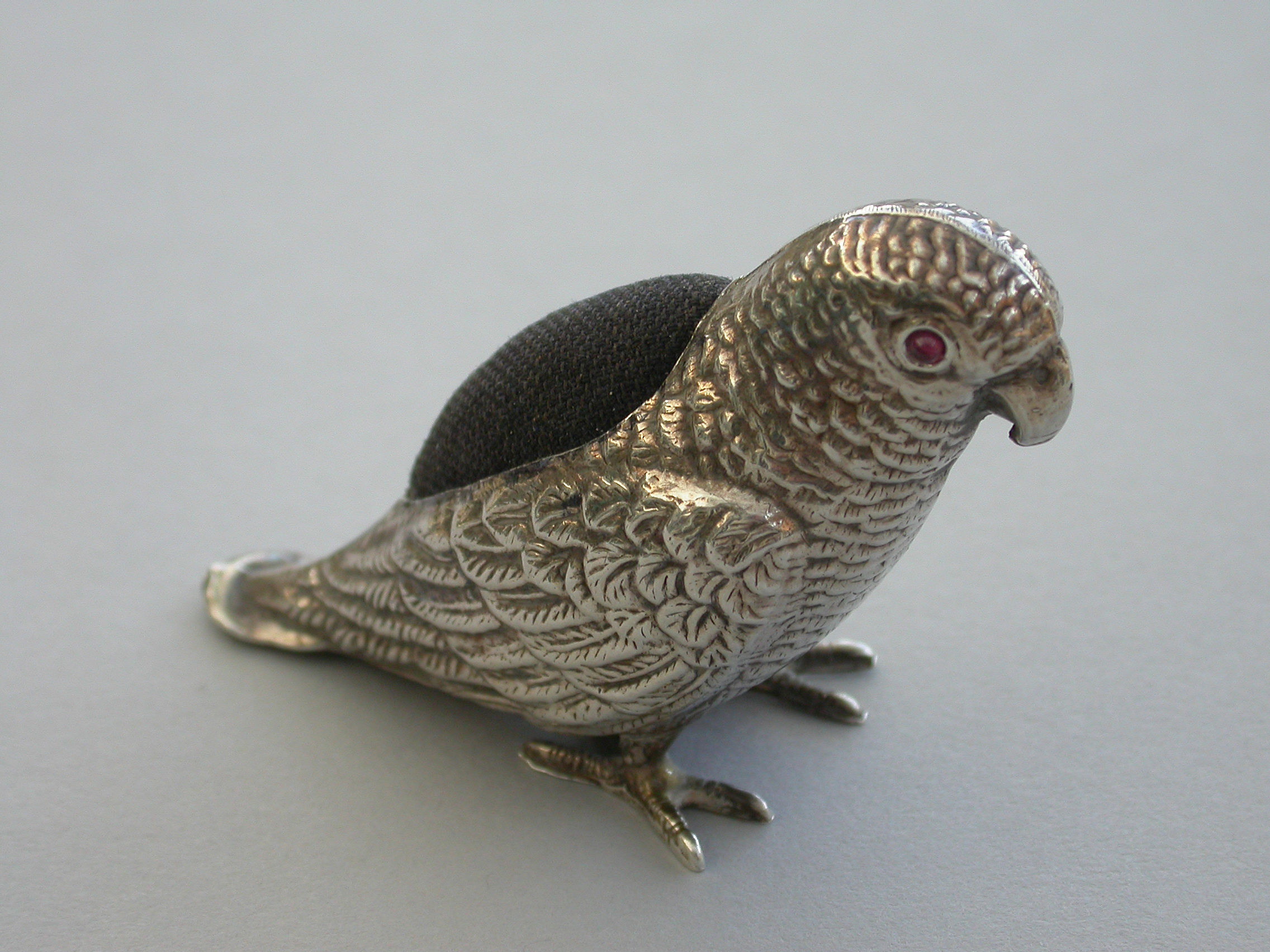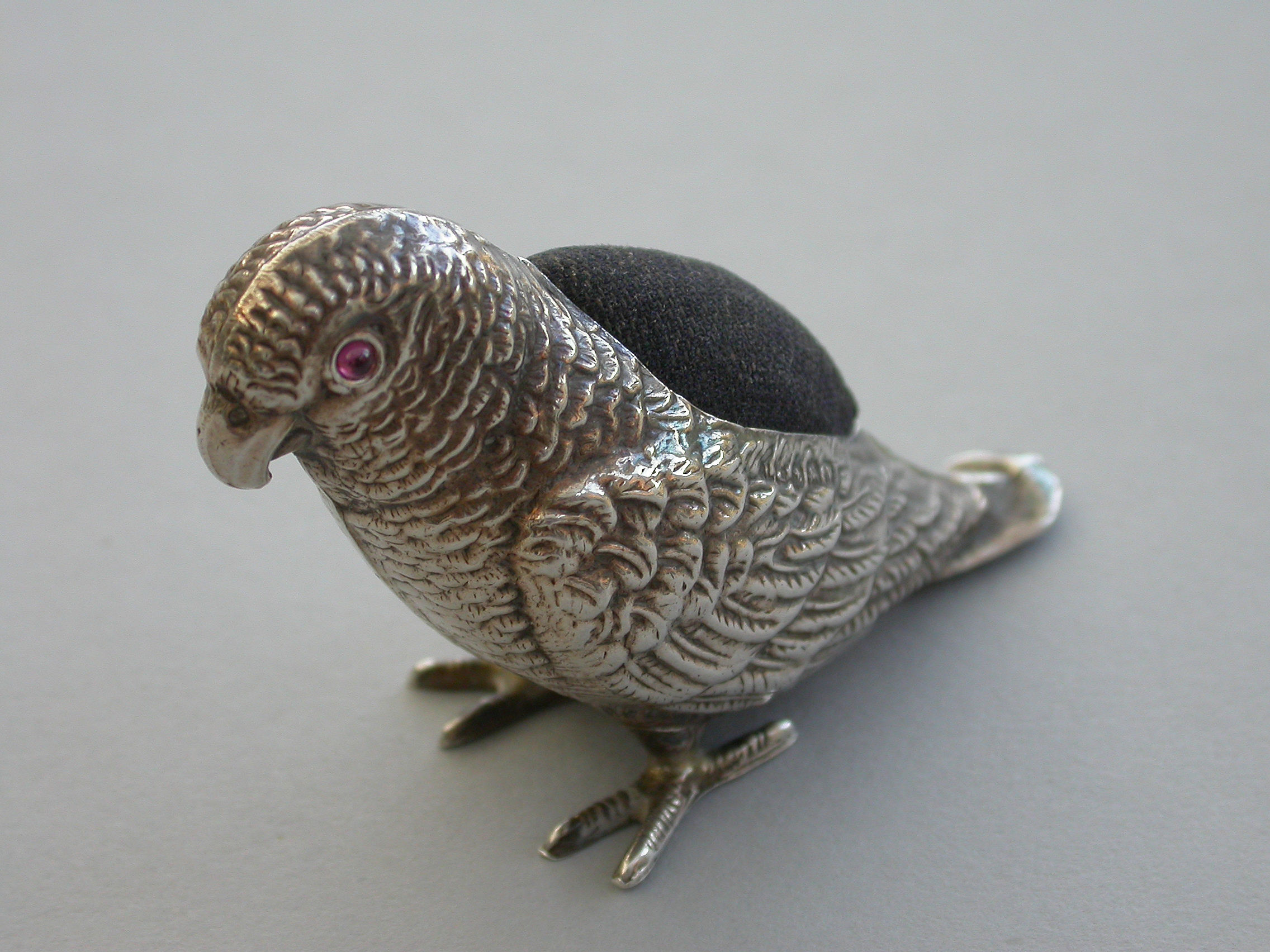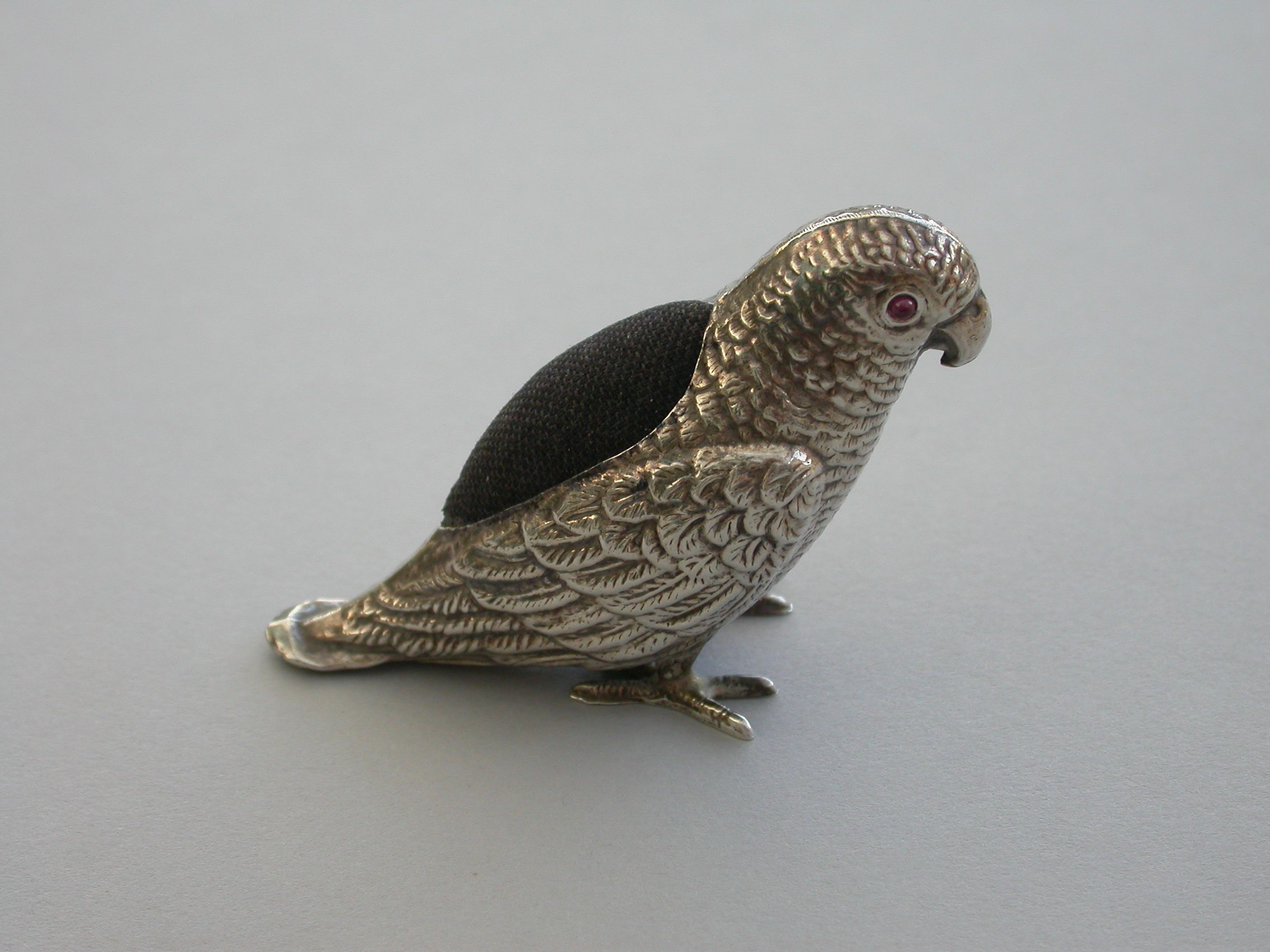 An extremely rare George V novelty silver Pin Cushion made in the form of a Parrot, set with red garnet eyes and complete with original velvet cushion.