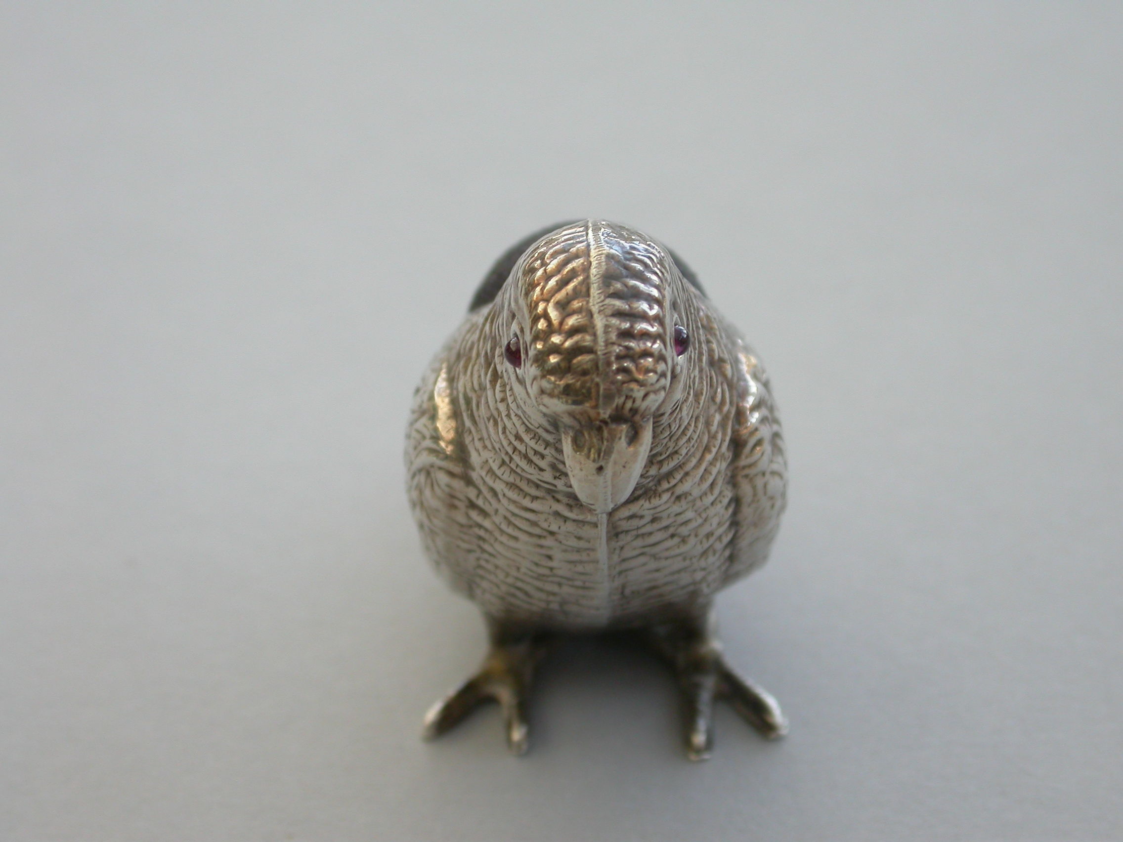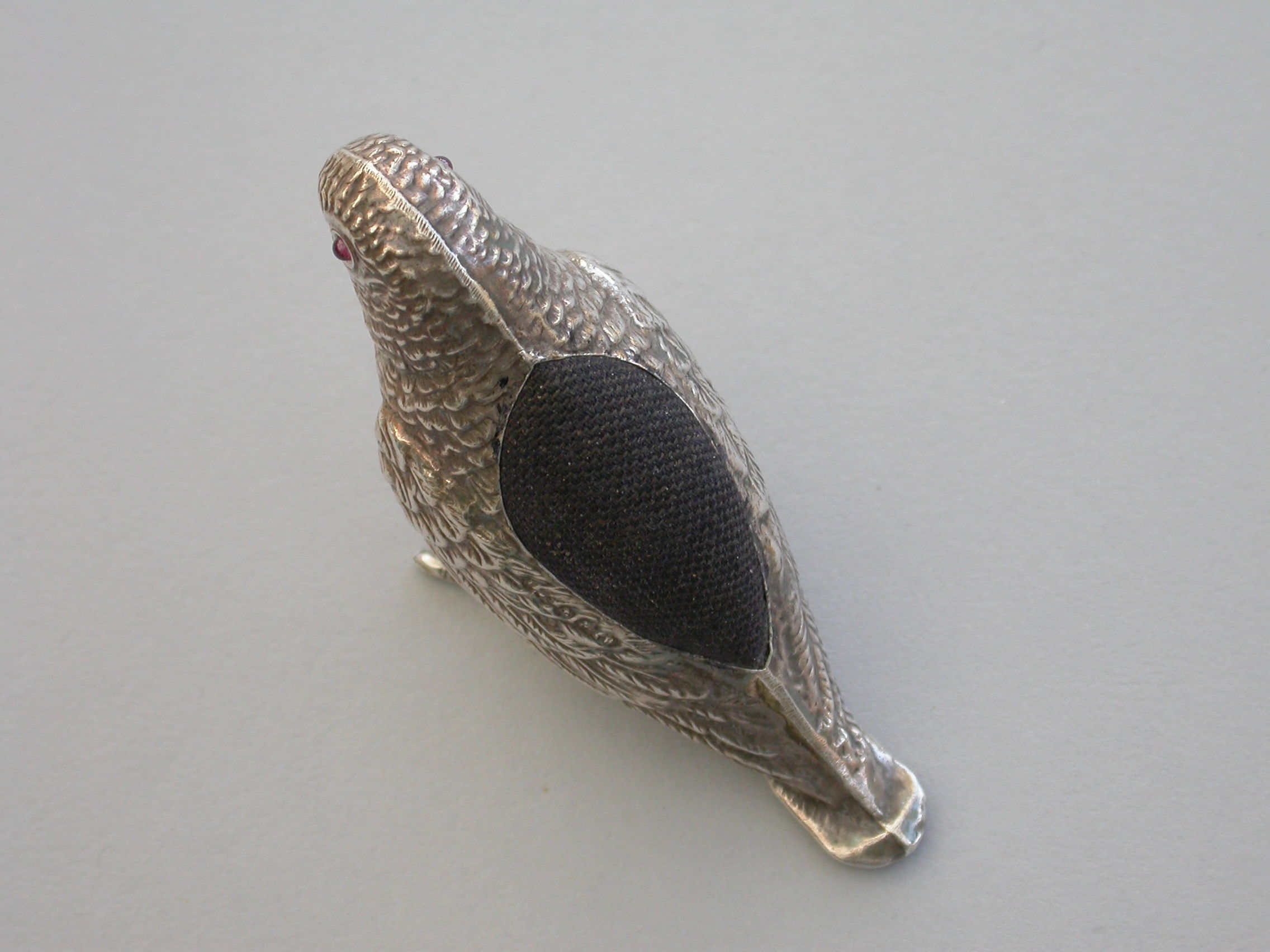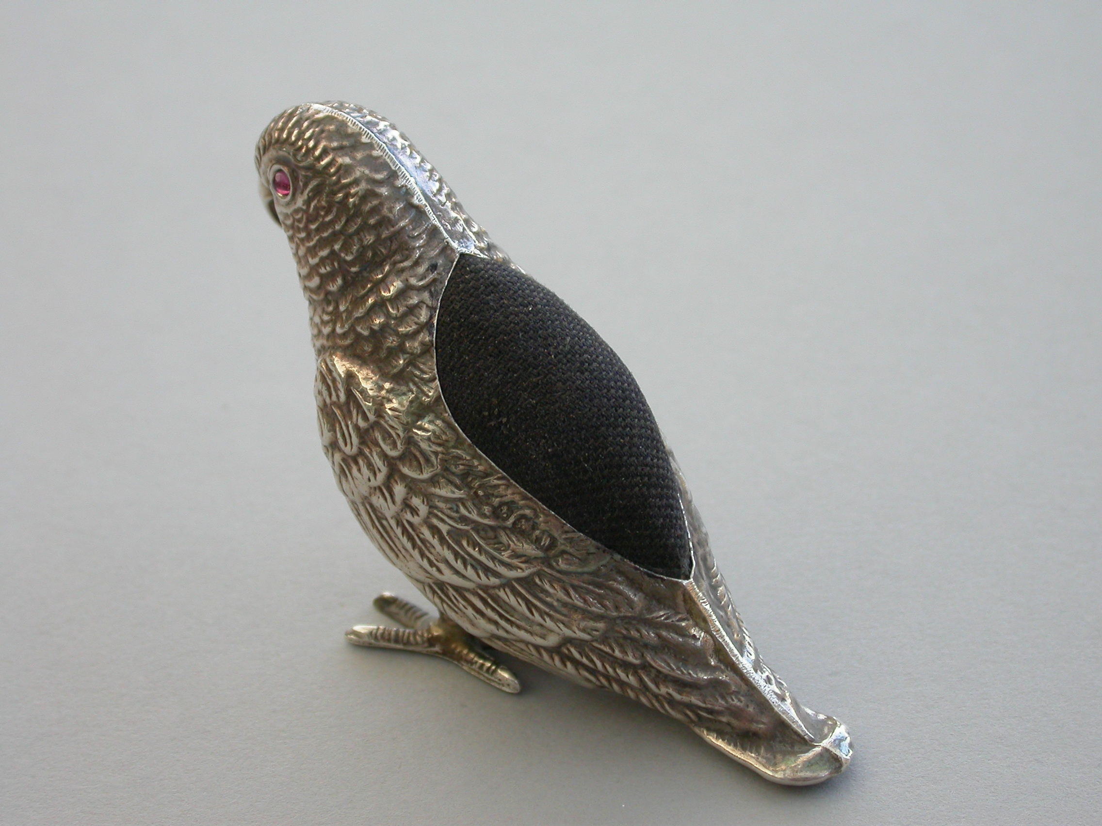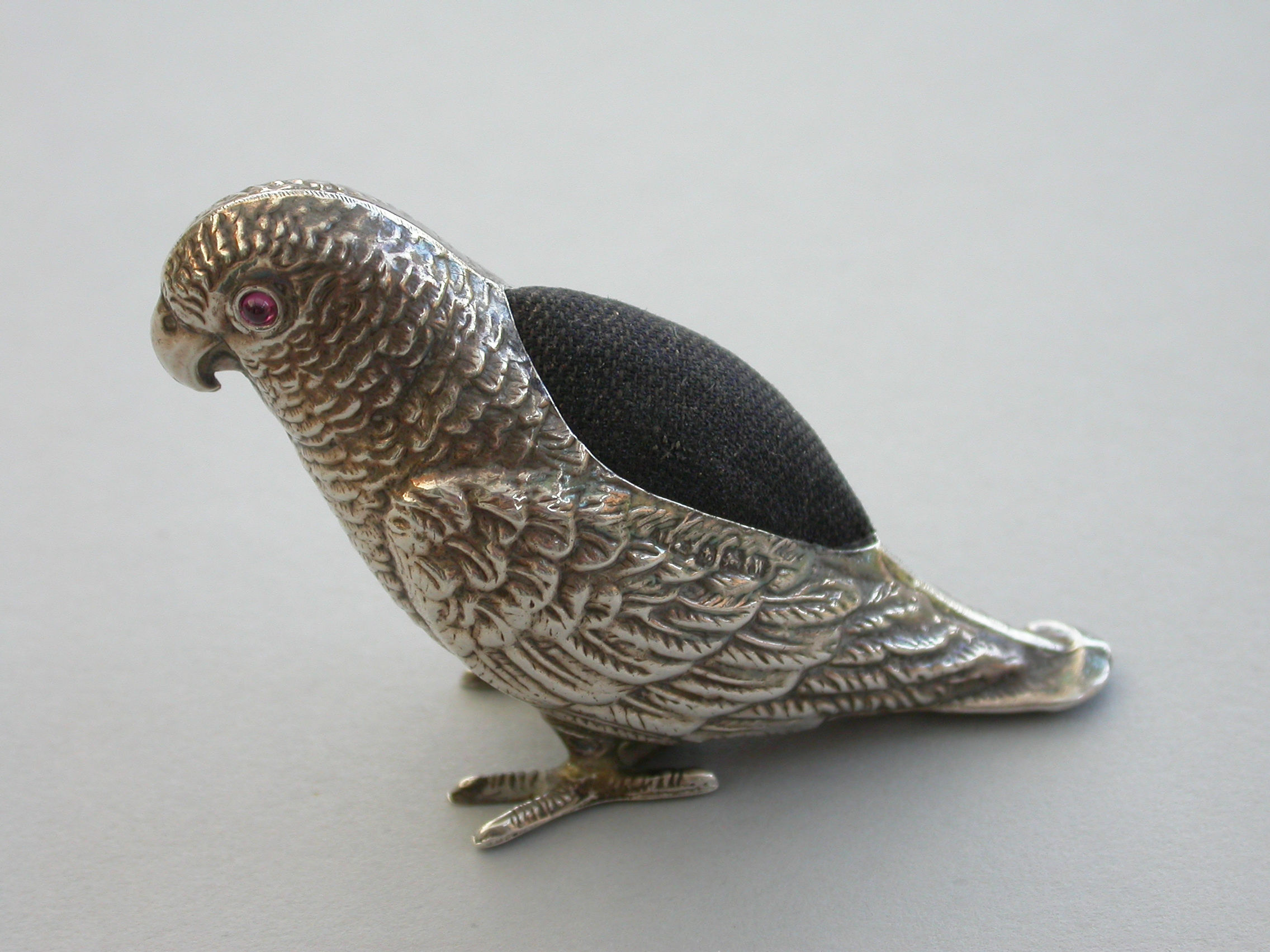 An extremely rare George V novelty silver Pin Cushion made in the form of a Parrot, set with red garnet eyes and complete with original velvet cushion.
