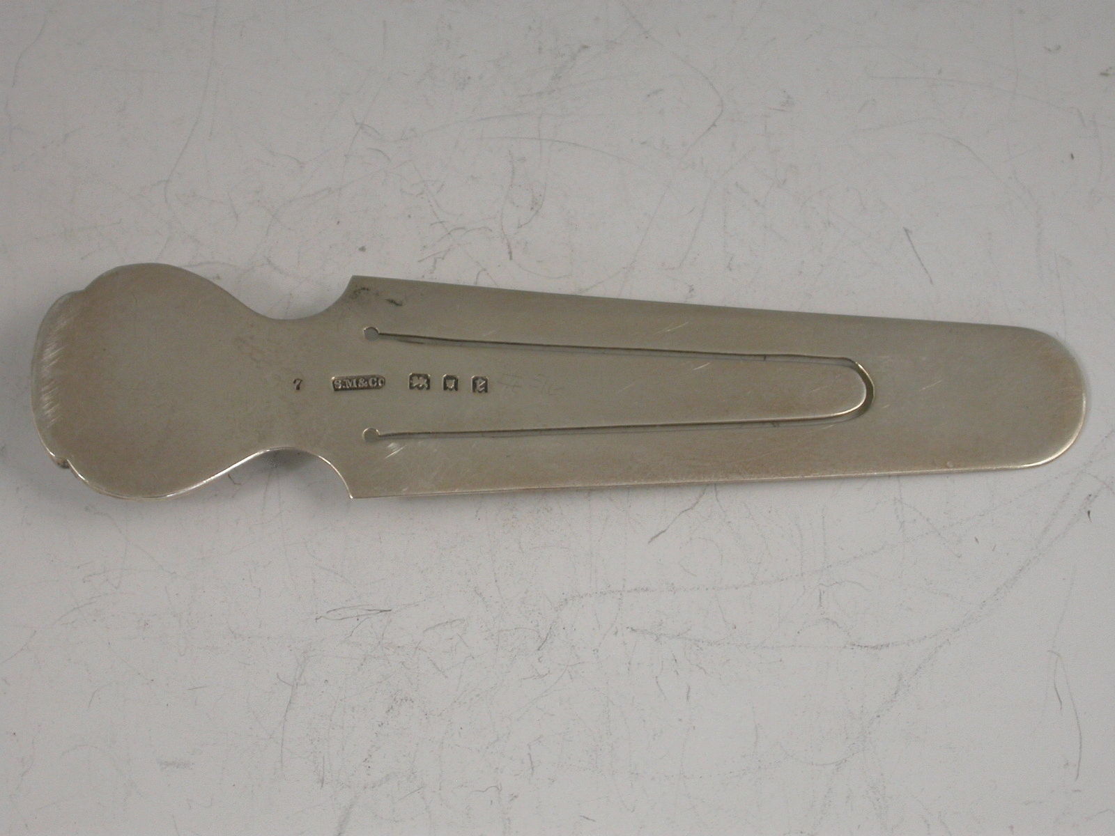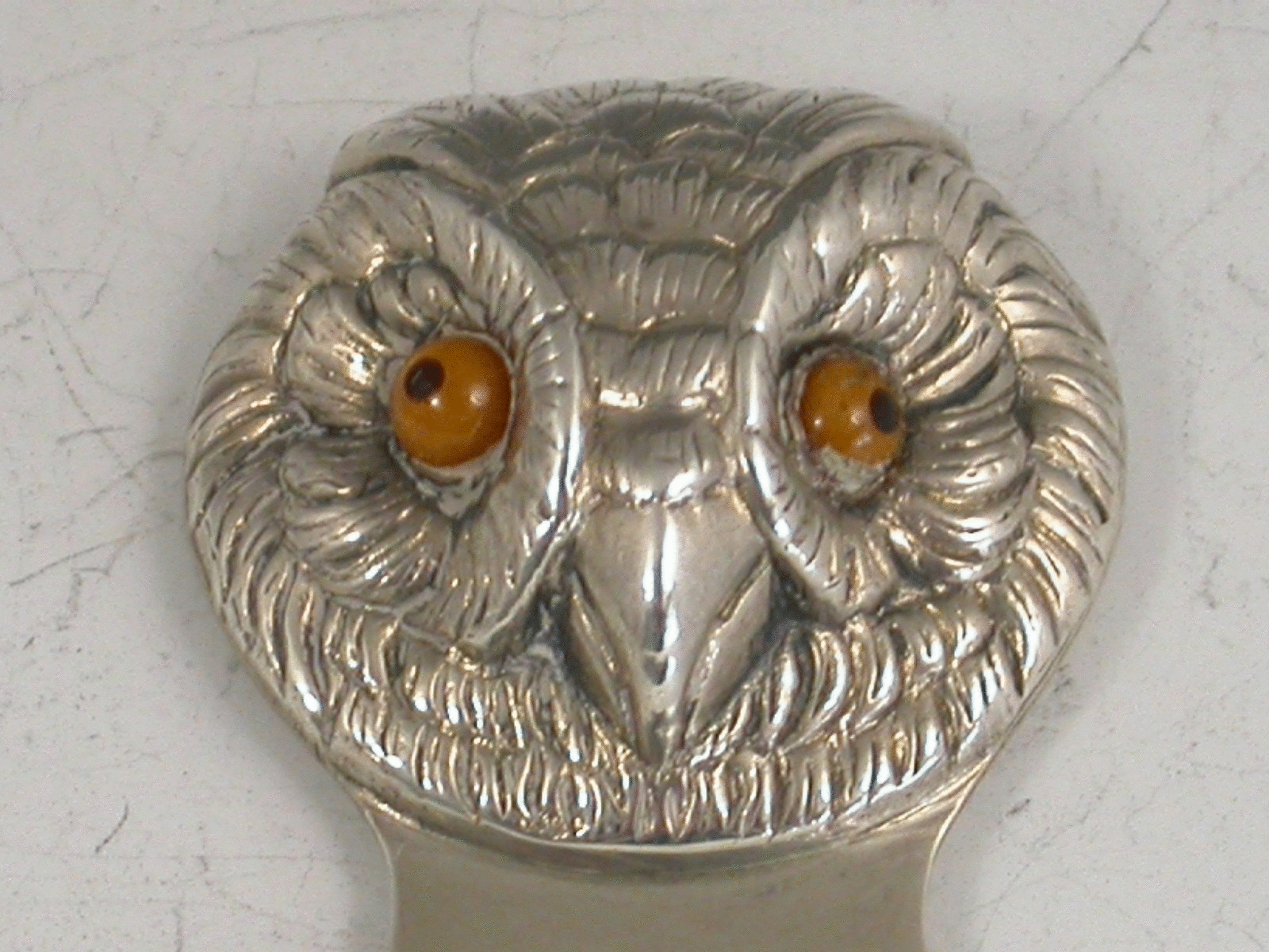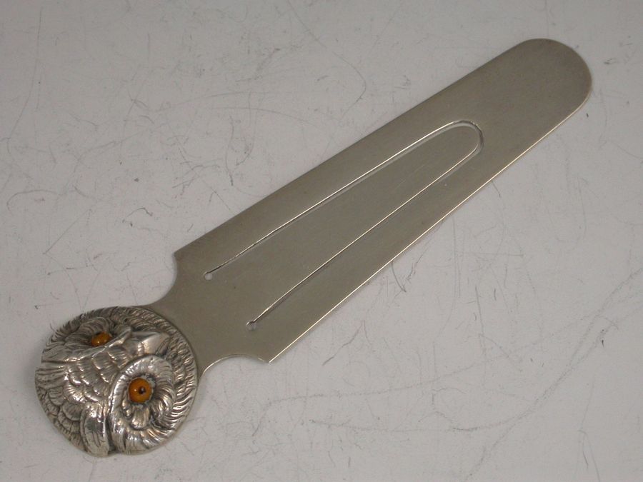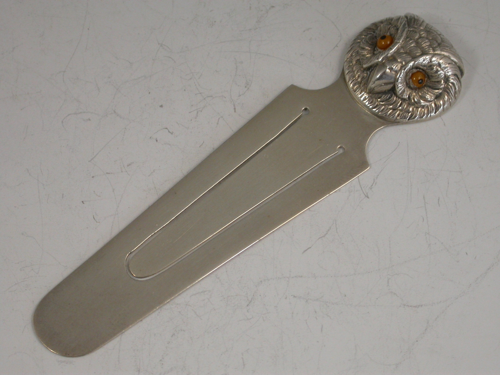 An early 20th century silver Bookmark, the terminal formed as an Owl’s head with realistically chased feathers and amber glass eyes.