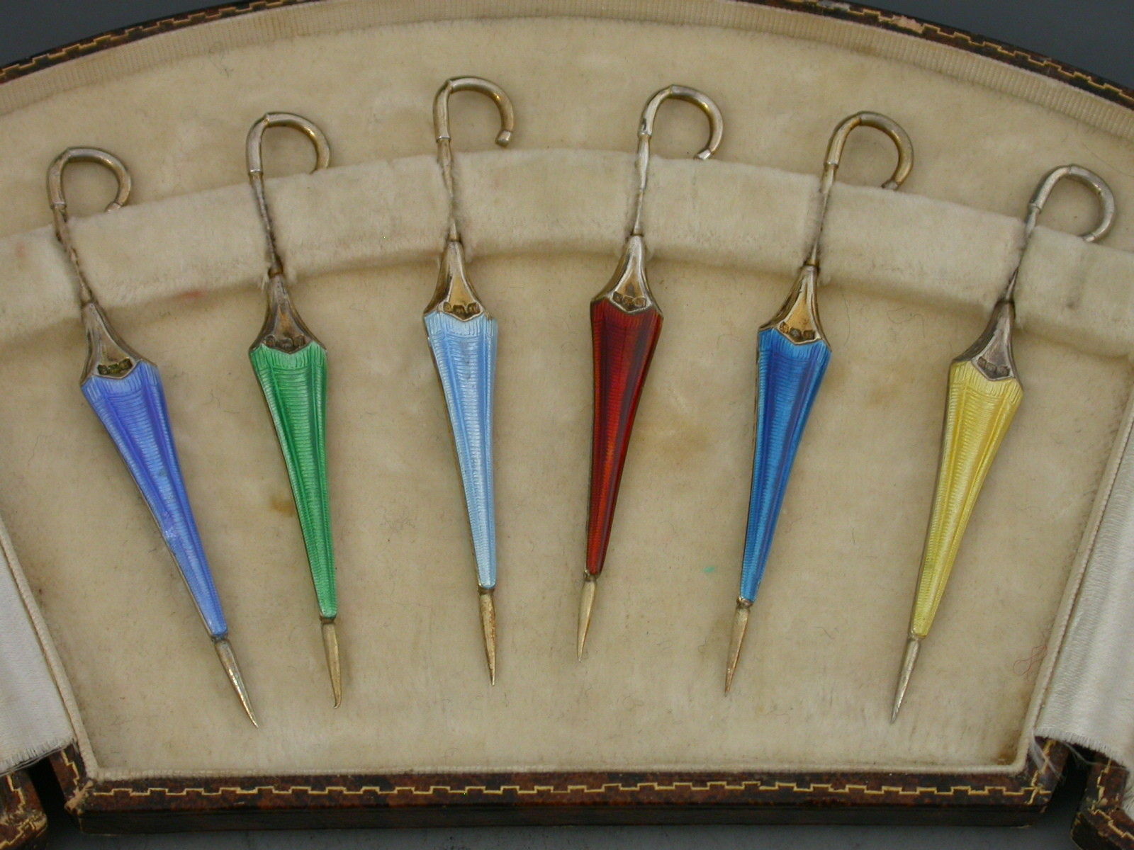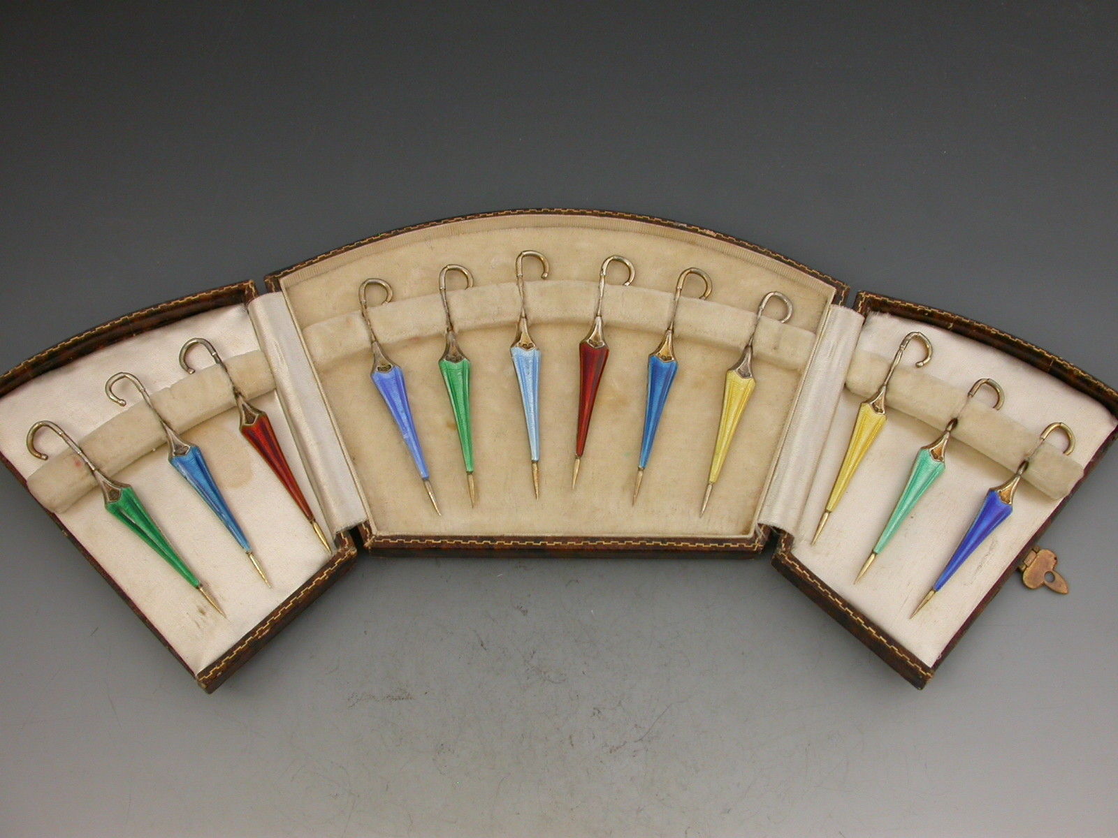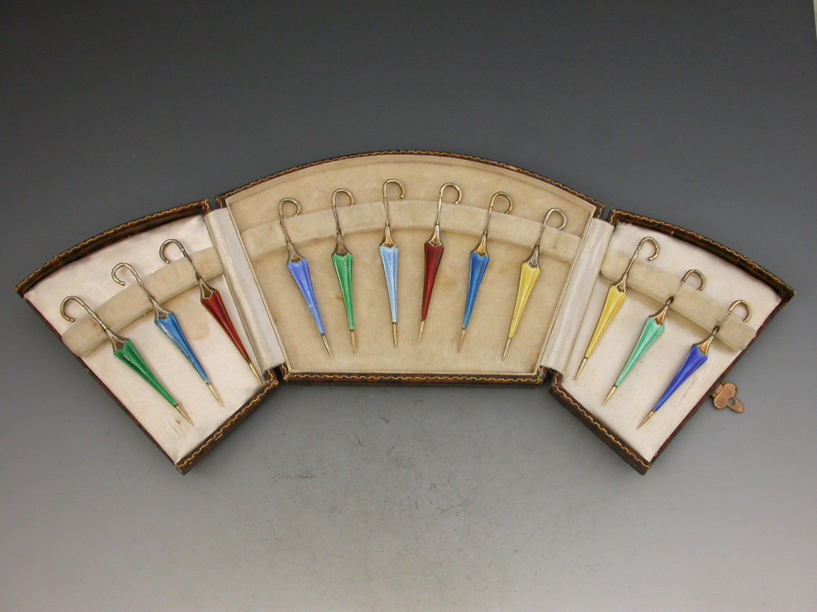 A cased set of twelve silver gilt and enamel novelty cocktail sticks, each in the form of a closed umbrella, enamelled in shades of blue, green, yellow and orange on an engine turned ground, the shafts also stamped with registered design number 763811. In a fitted leather presentation case.