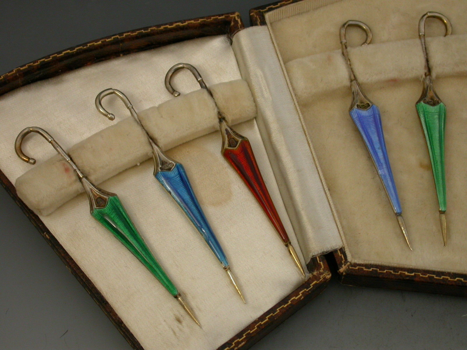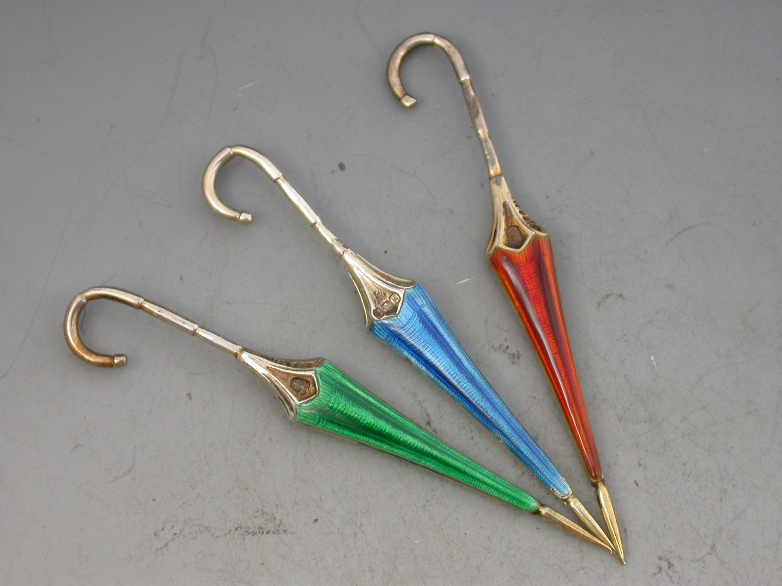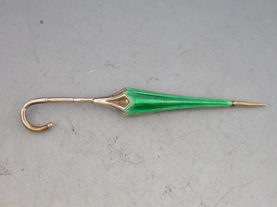 A cased set of twelve silver gilt and enamel novelty cocktail sticks, each in the form of a closed umbrella, enamelled in shades of blue, green, yellow and orange on an engine turned ground, the shafts also stamped with registered design number 763811. In a fitted leather presentation case.