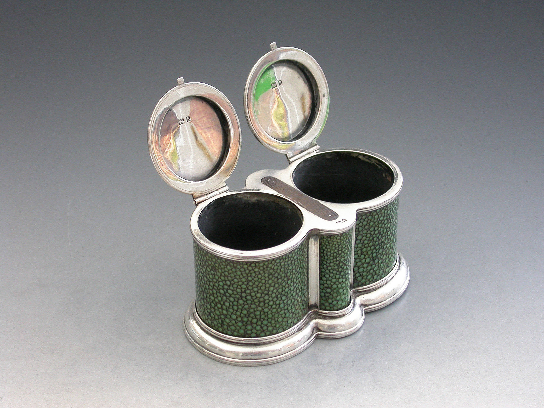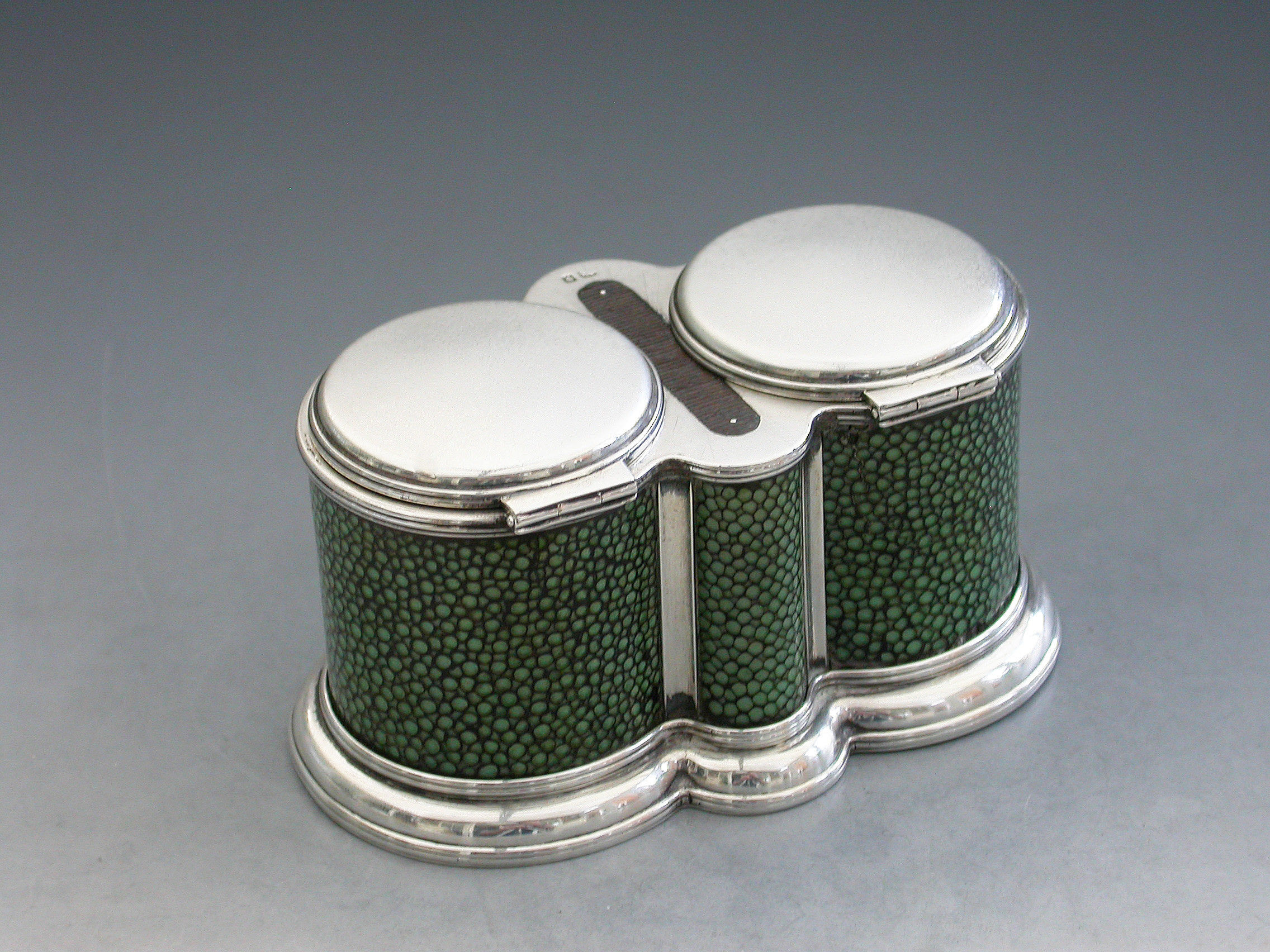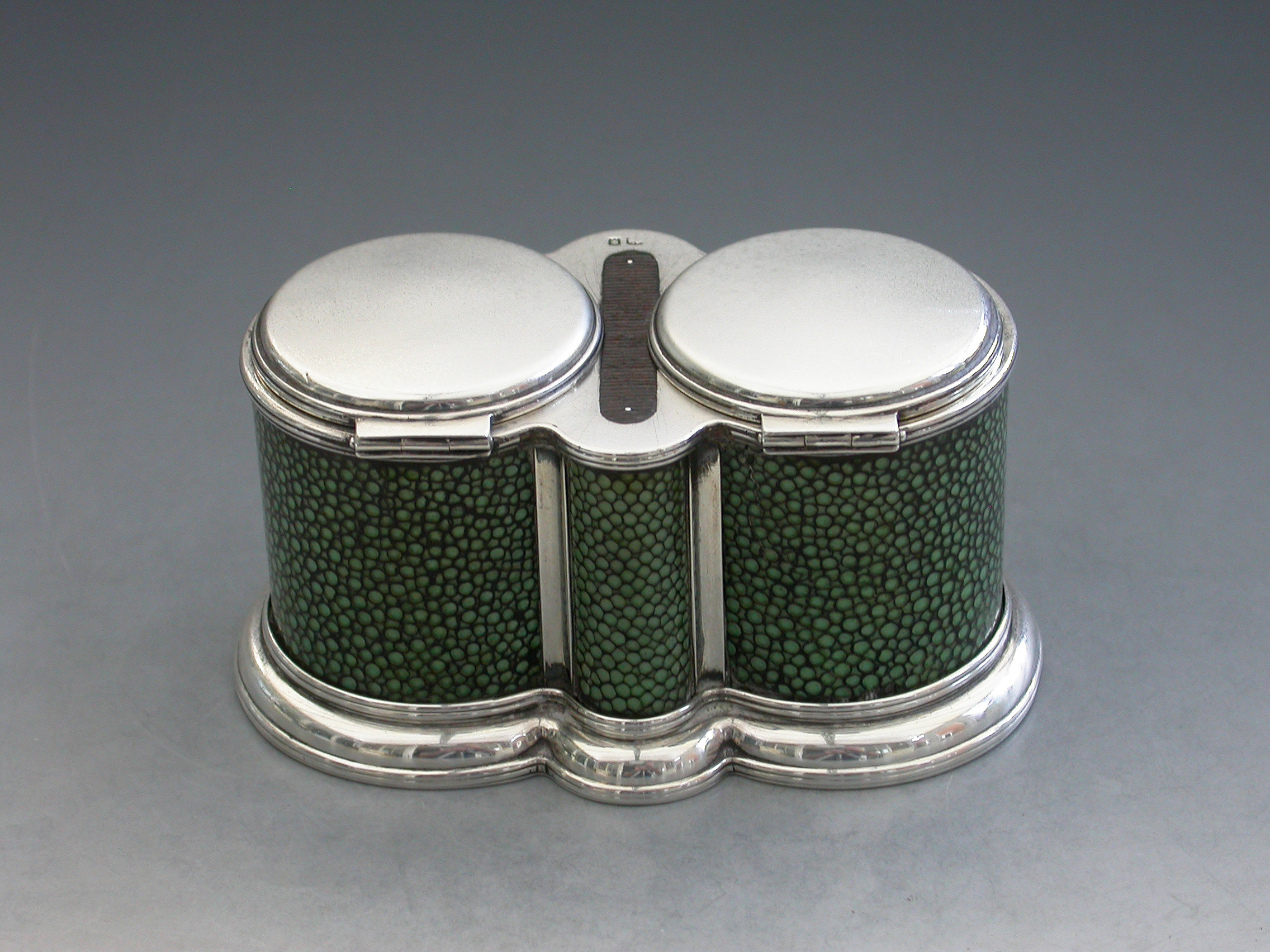 A good quality early 20th century shagreen mounted silver double Table Vesta Case of ""binocular"" form, on stepped reeded base, the two cylindrical compartments with flat hinged covers and with a steel striker set between them.